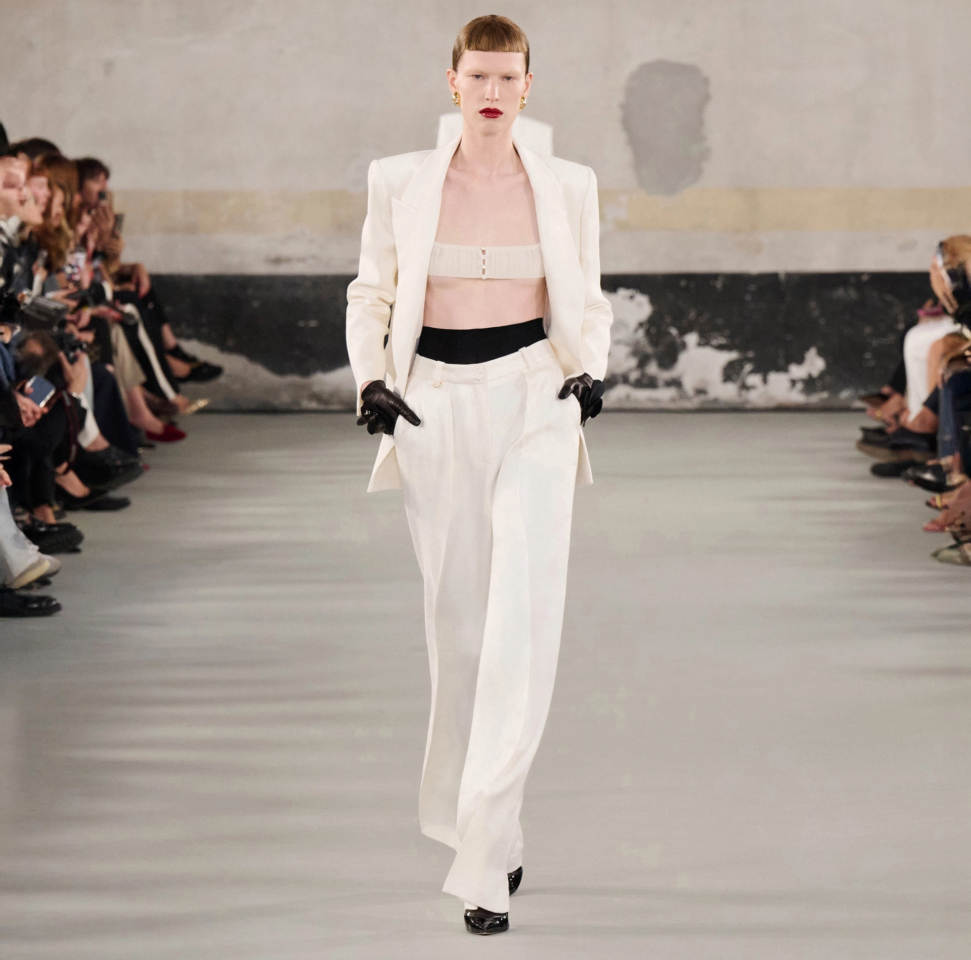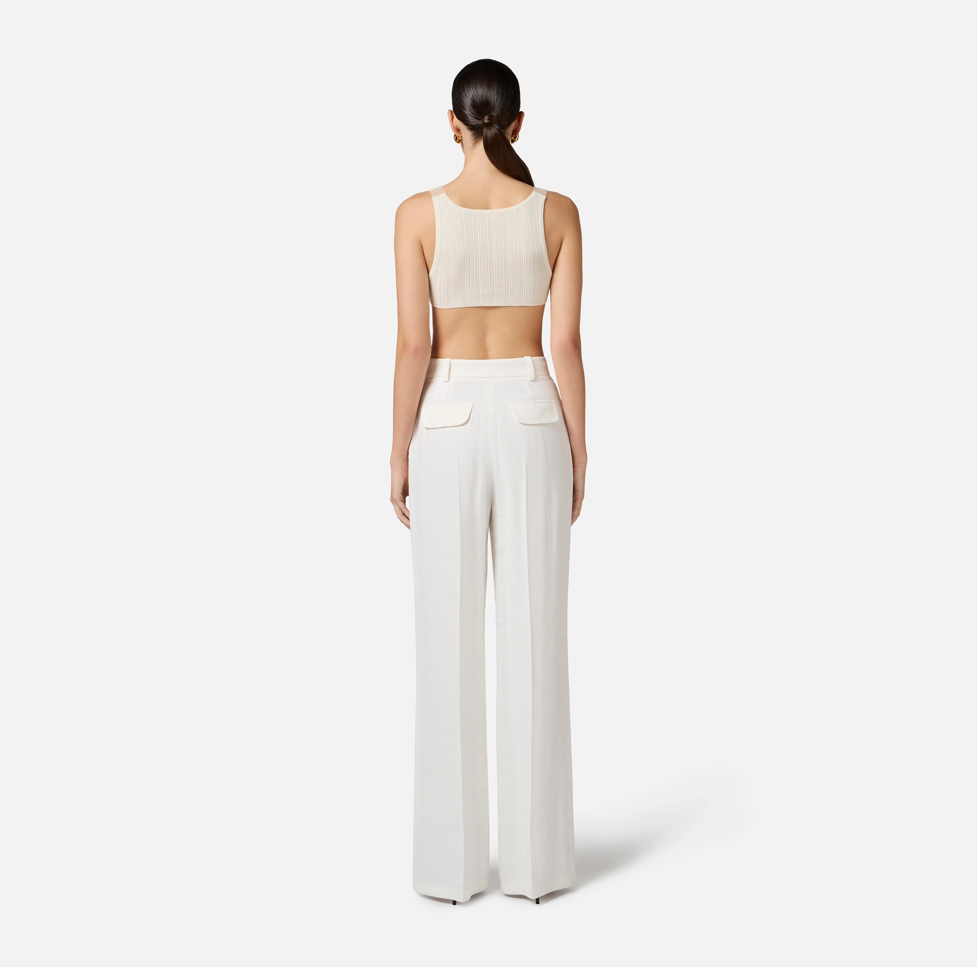 Spodnie z gabardyny z mieszanki lnu, o prostym kroju. Charakteryzują się strukturą z zaszewkami, która tworzy kant pośrodku i nadaje objętości modelowi. Szlufka ozdobiona jest akcesorium inspirowanym klasycznymi walizkami, z wiszącym logo.