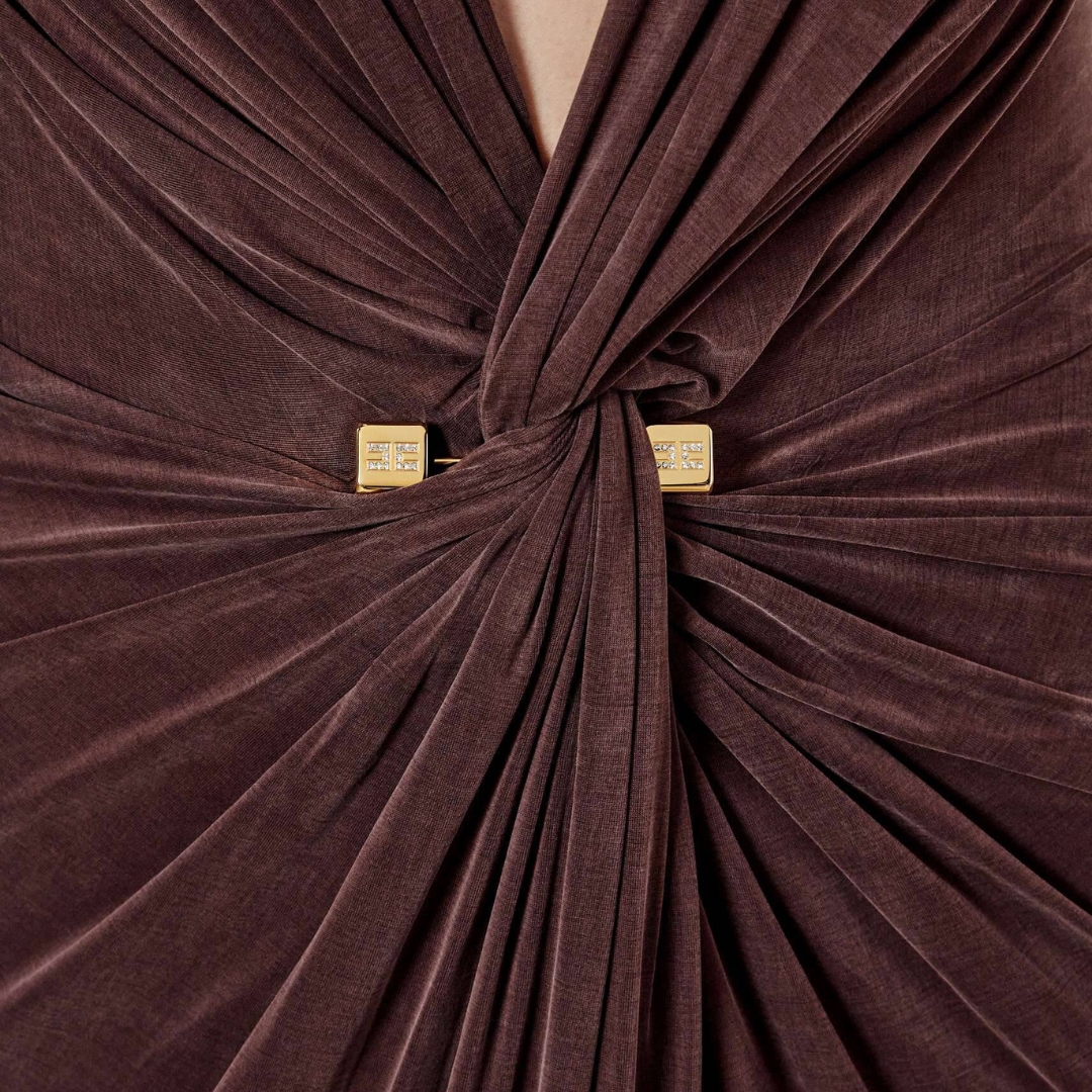 Długa suknia wieczorowa z dżerseju cupro. Model posiada długie rękawy i wyróżnia się szerokim drapowaniem z węzłem z przodu, ozdobionym odpinanym biżuteryjnym detalem ze złoconego metalu. Zaskakuje fasonem pleców, z dużym otwarciem w kształcie kropli, pozostawiającym odsłonięte plecy i ozdobionym marszczeniem.