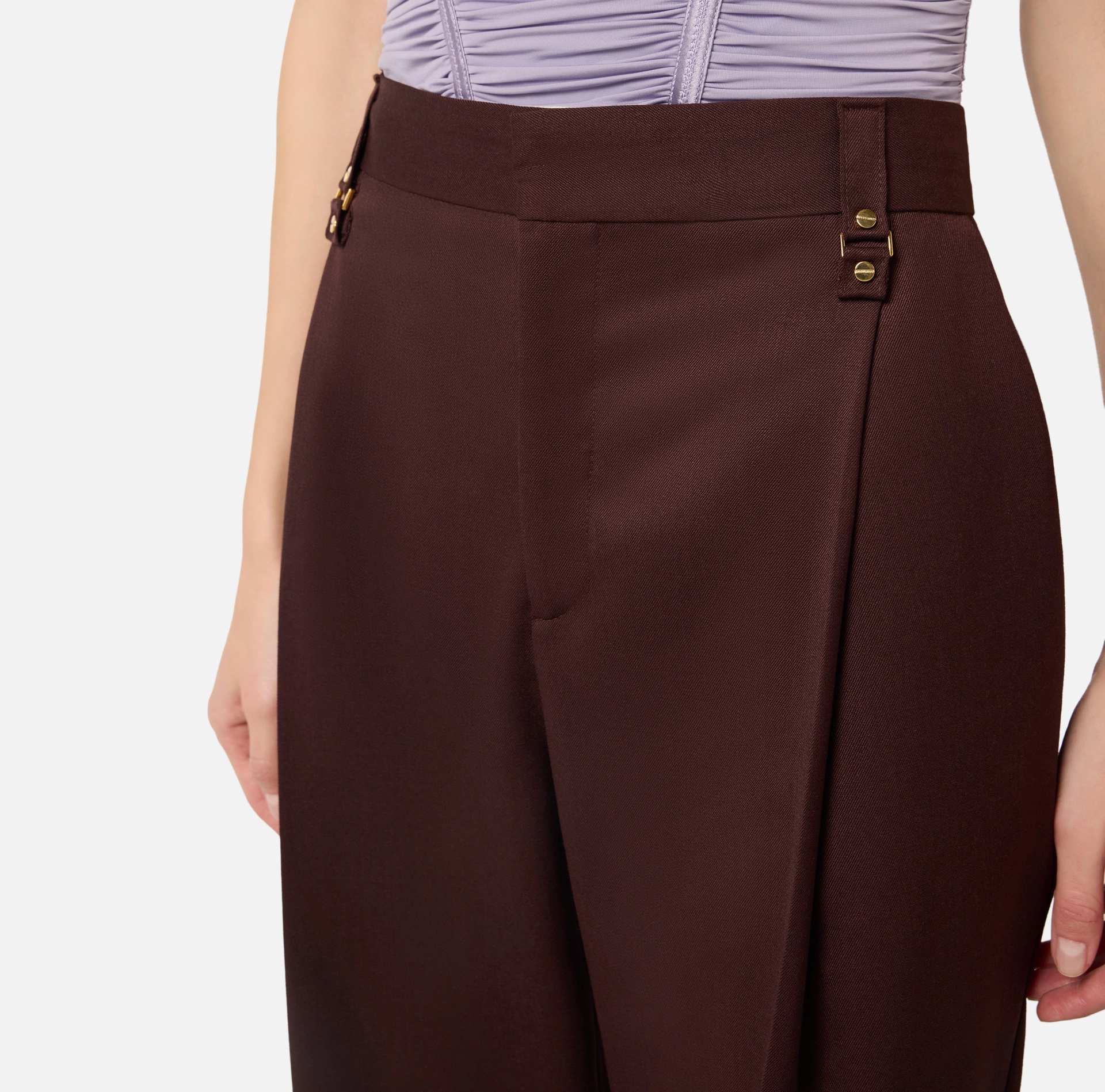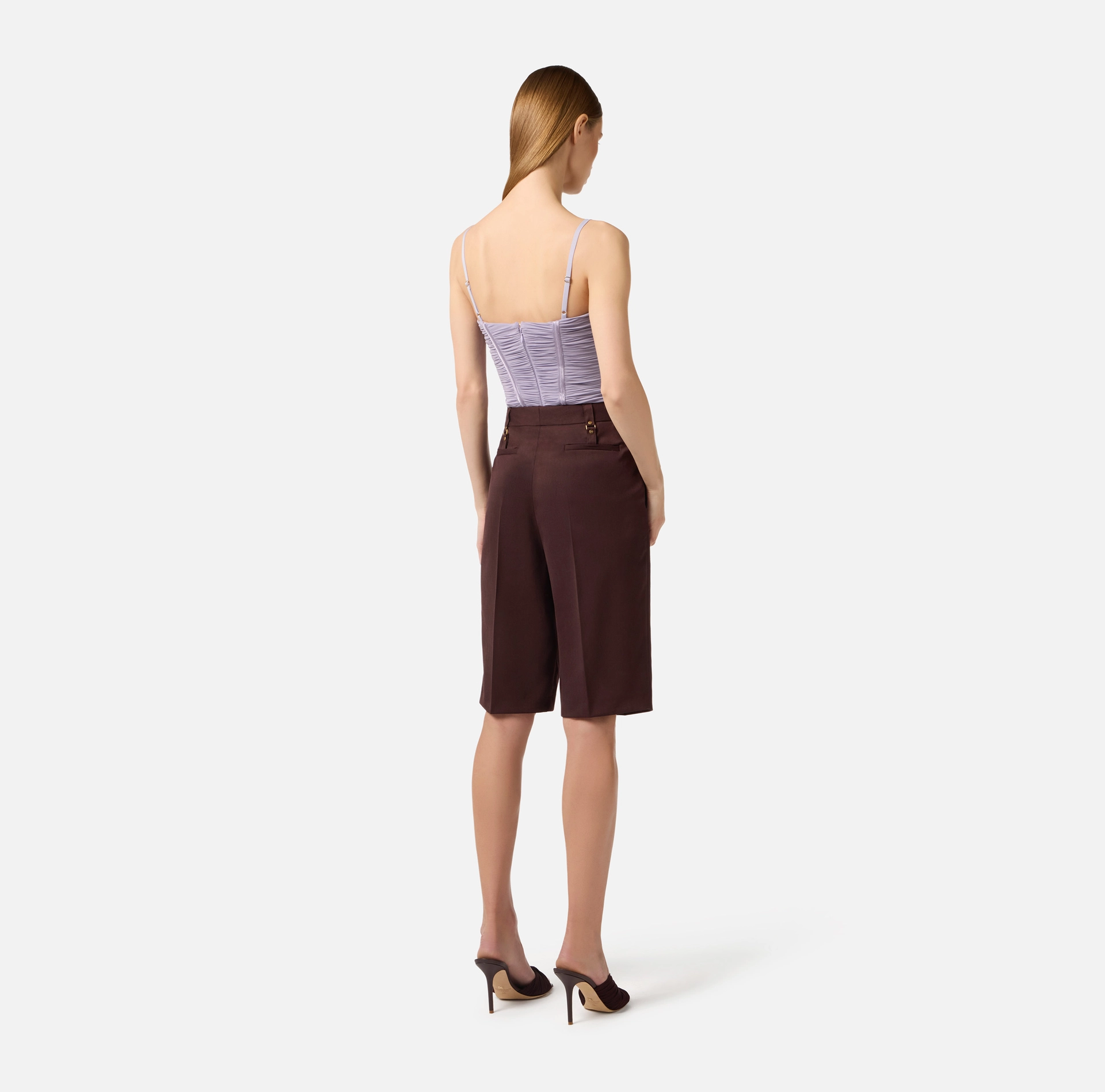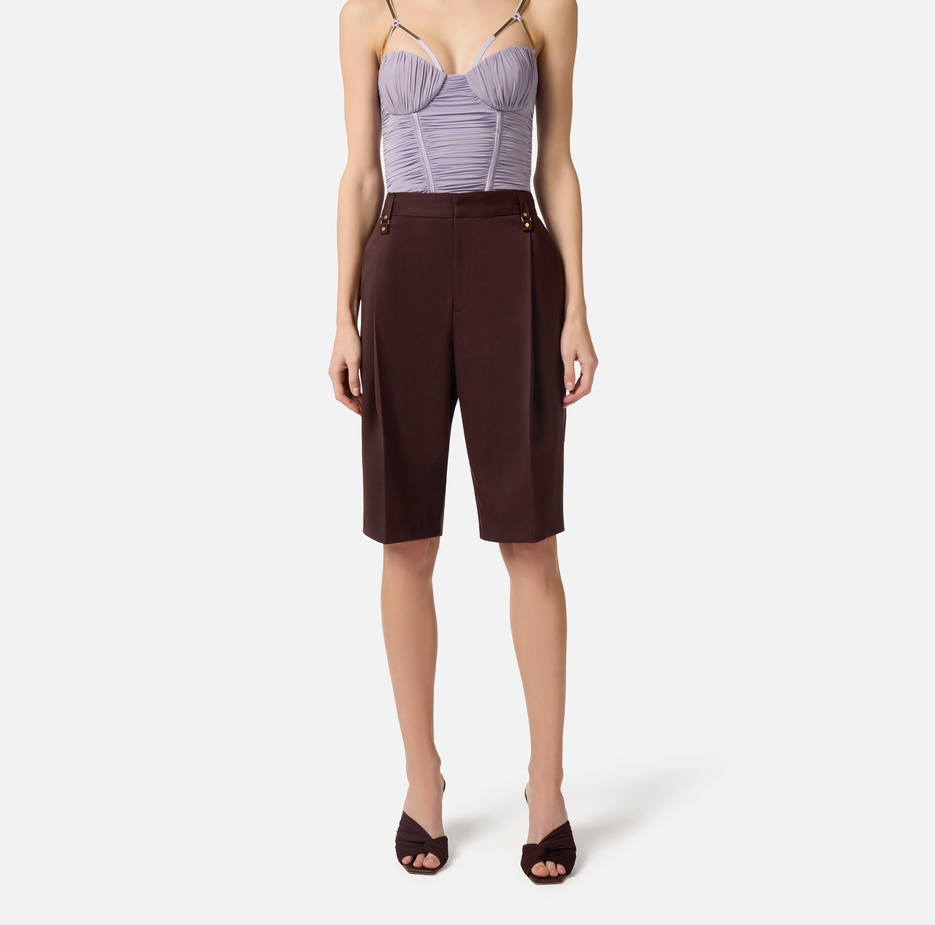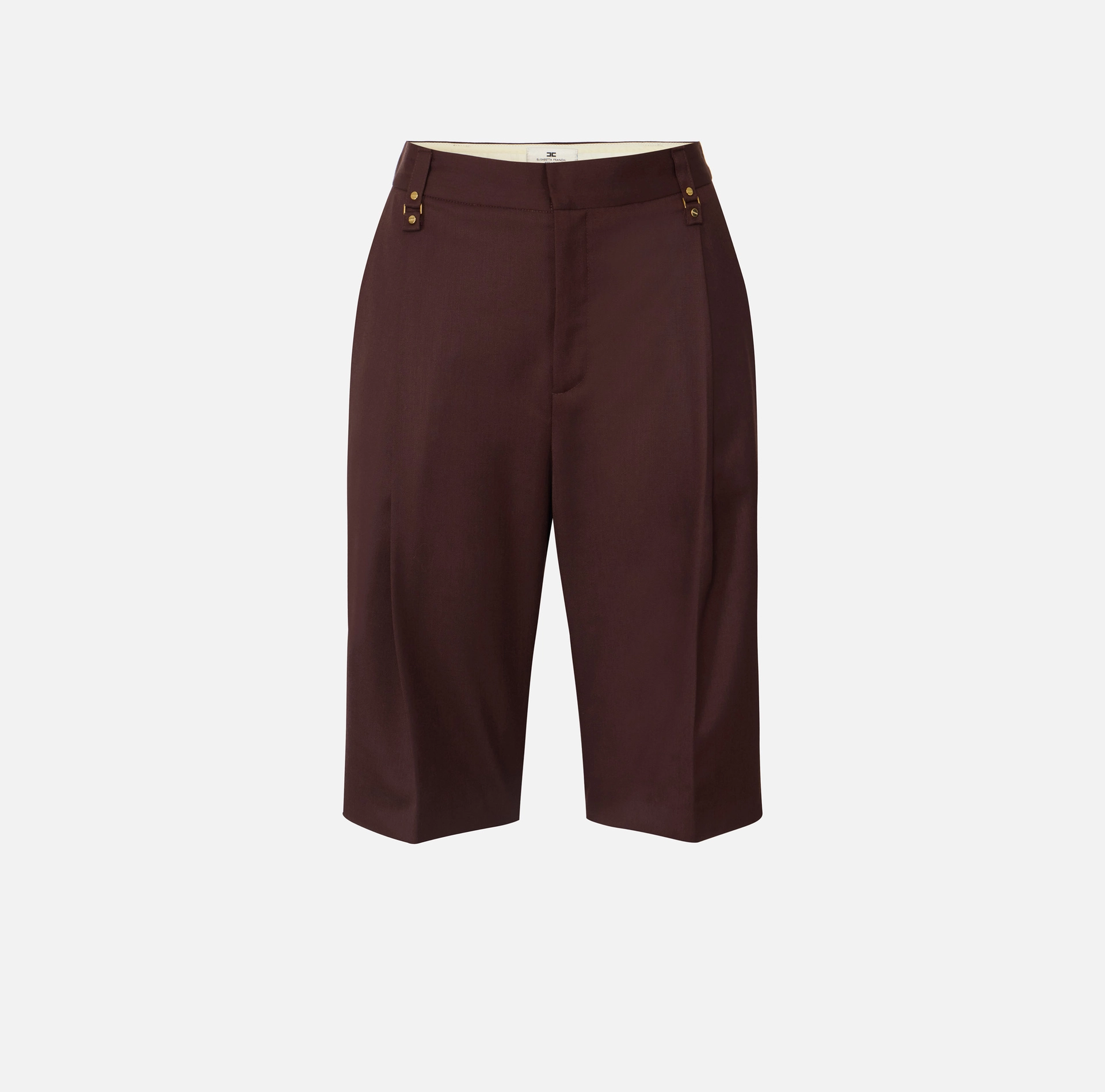 Spodnie bermudy z lekkiej wełny. Szlufki na pasie są ozdobione nitami i pierścieniami, co dodaje spodniom charakteru. Prosty krój.