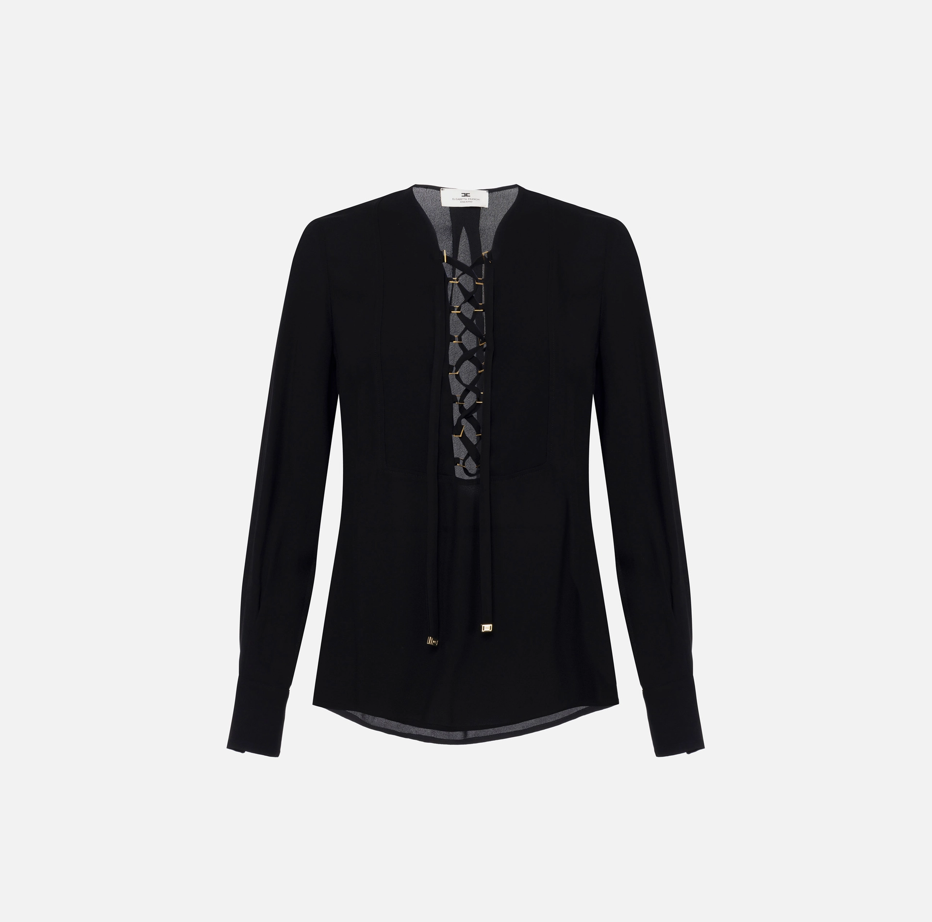 Bluzka z tkaniny żorżetowej o regularnym kroju i luźnej linii. Ubranie ma długie rękawy z szerokimi mankietami, ozdobione podwójnymi złotymi metalowymi guzikami z logo. Dekolt zdobią przeplatane koronki, rozświetlone na końcach kwadratowymi pierścieniami z detalami z logo.