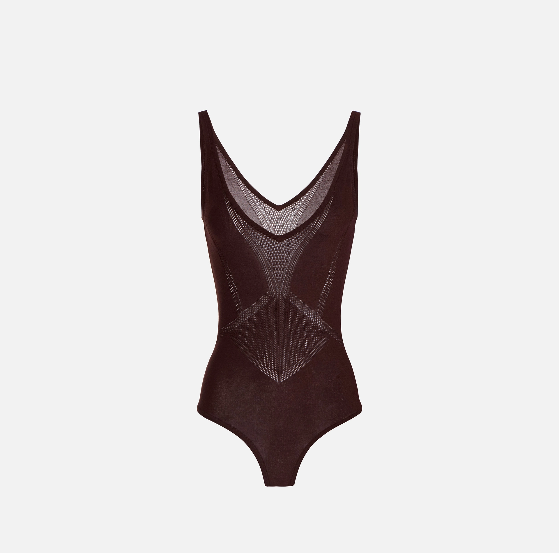 Dzianinowe body na ramiączkach. Ozdobione grą krzyżujących się ażurowych punktów i geometrycznych cięć, rozświetlone blaszką z logo i napisem z tyłu. Krój dopasowany.