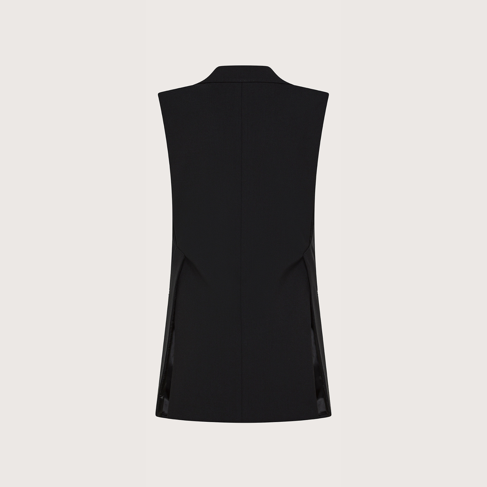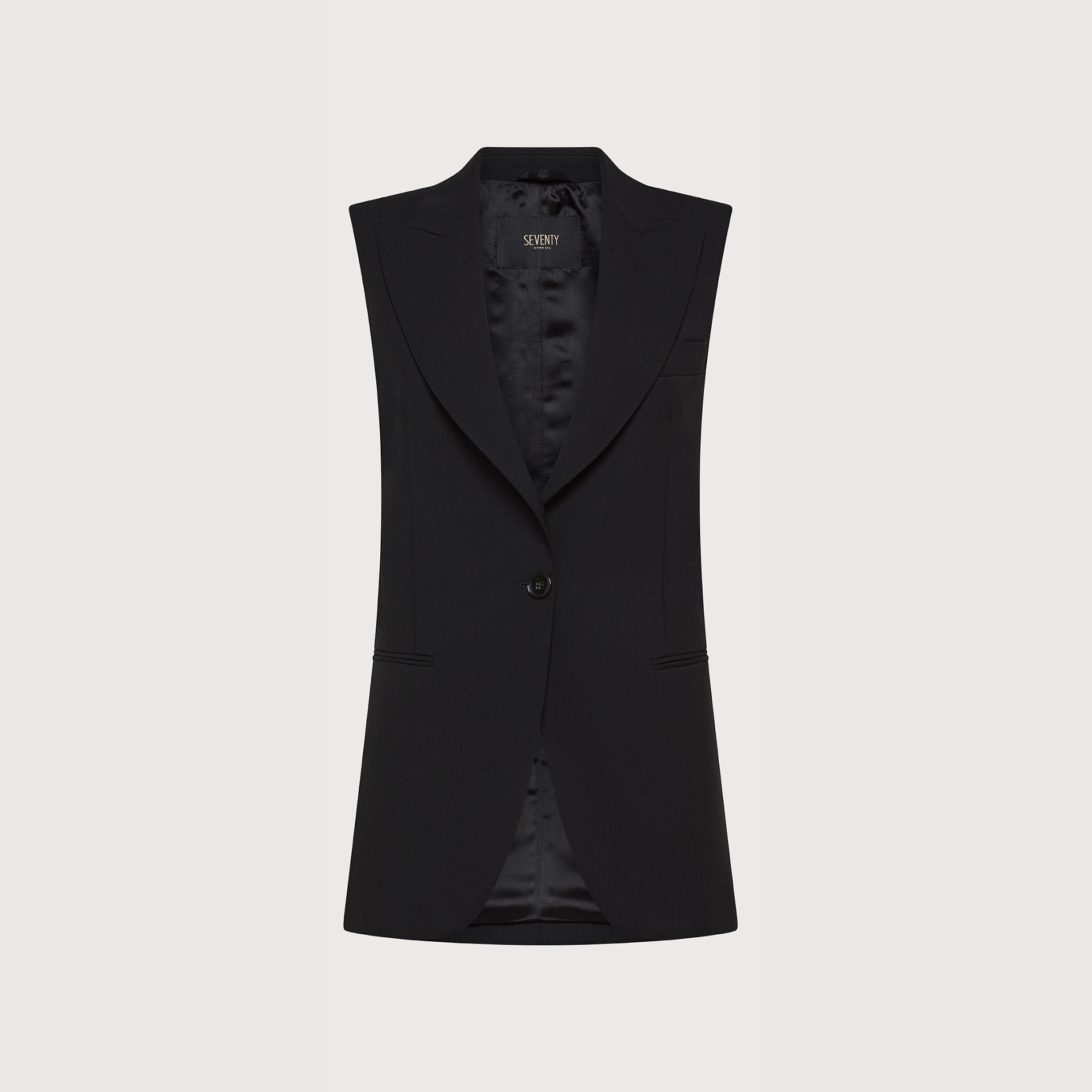 Ta czarna kamizelka garniturowa Seventy to kluczowy element garderoby dla kobiet ceniących wyrafinowany styl i wszechstronność. Długi, smukły krój z lekko taliowanym fasonem podkreśla sylwetkę, a klapy w stylu marynarki nadają jej formalnego charakteru. Wykonana z wysokiej jakości tkaniny z gładką, satynową podszewką, kamizelka jest idealnym dopełnieniem zarówno biurowych, jak i wieczorowych stylizacji.