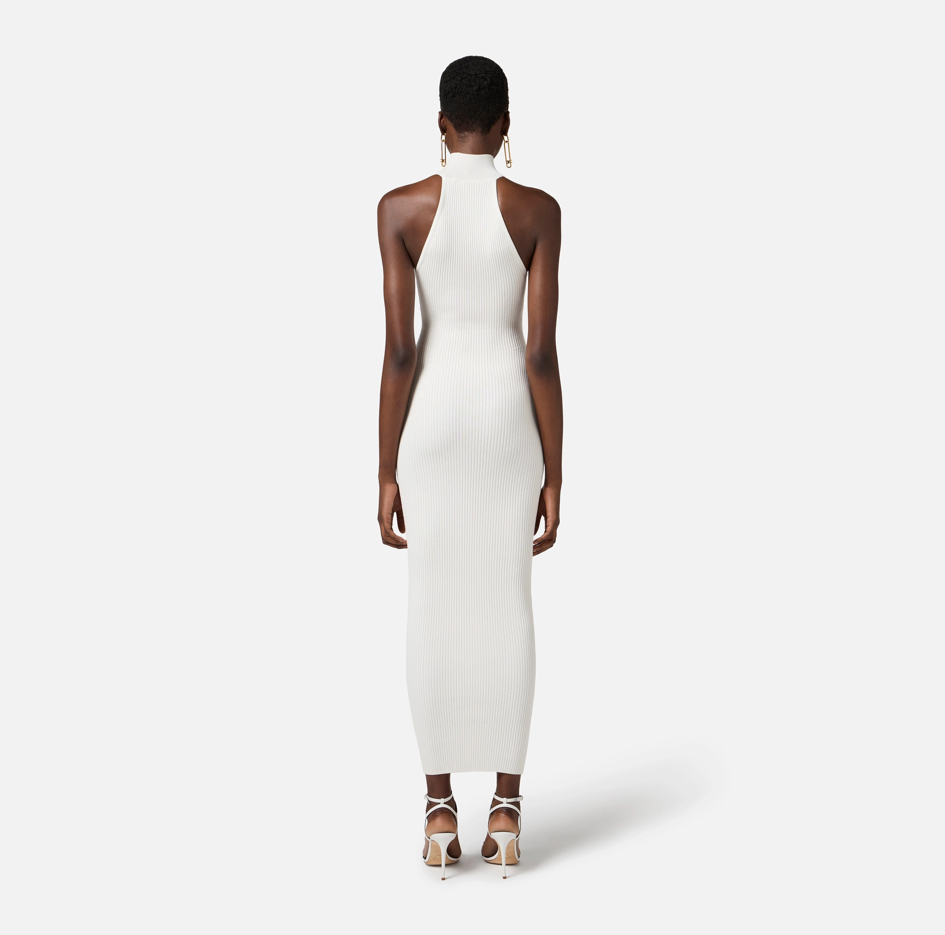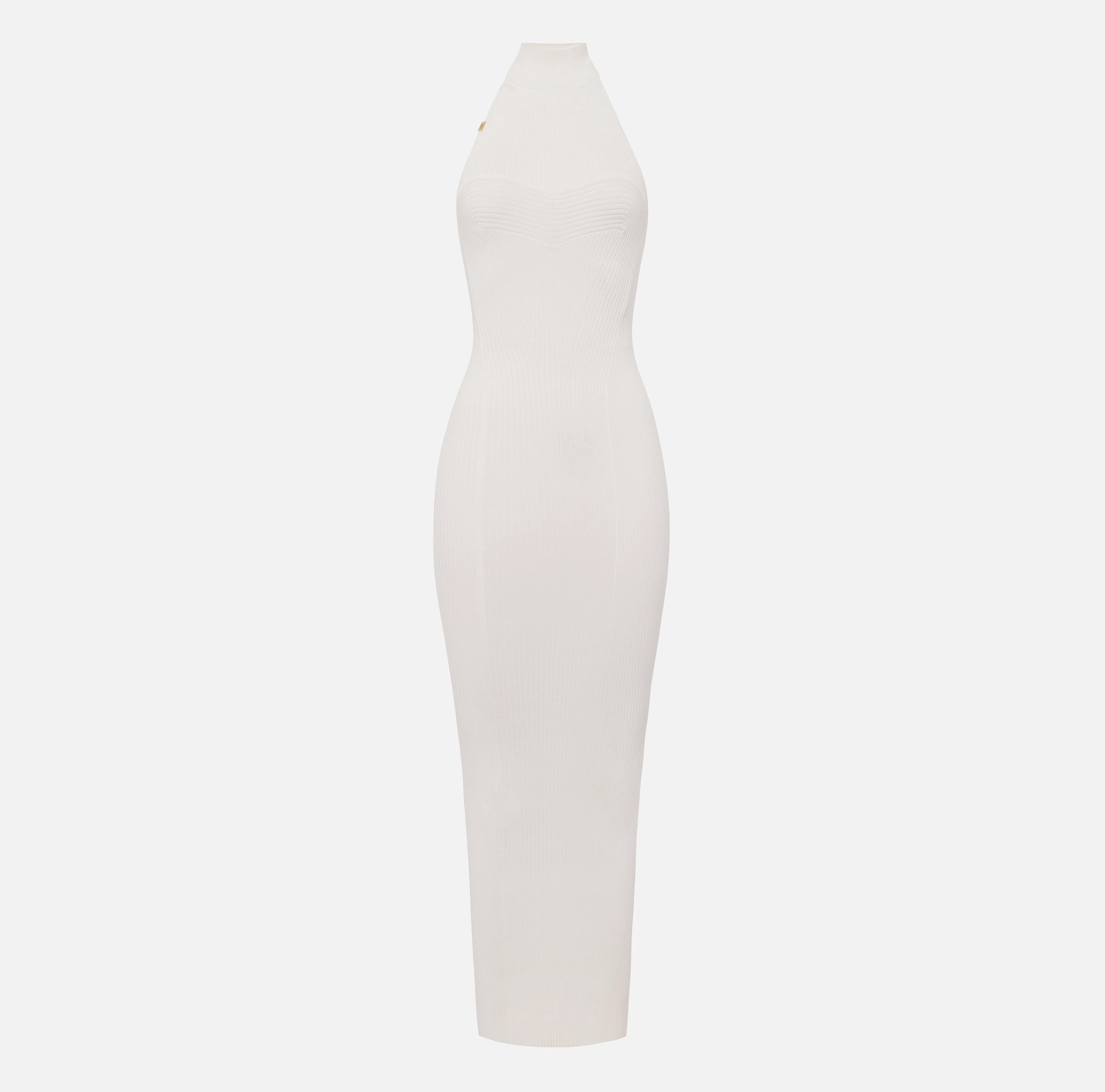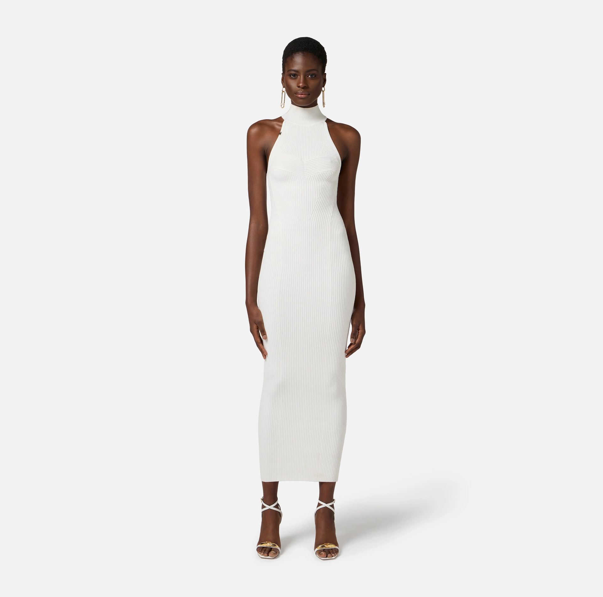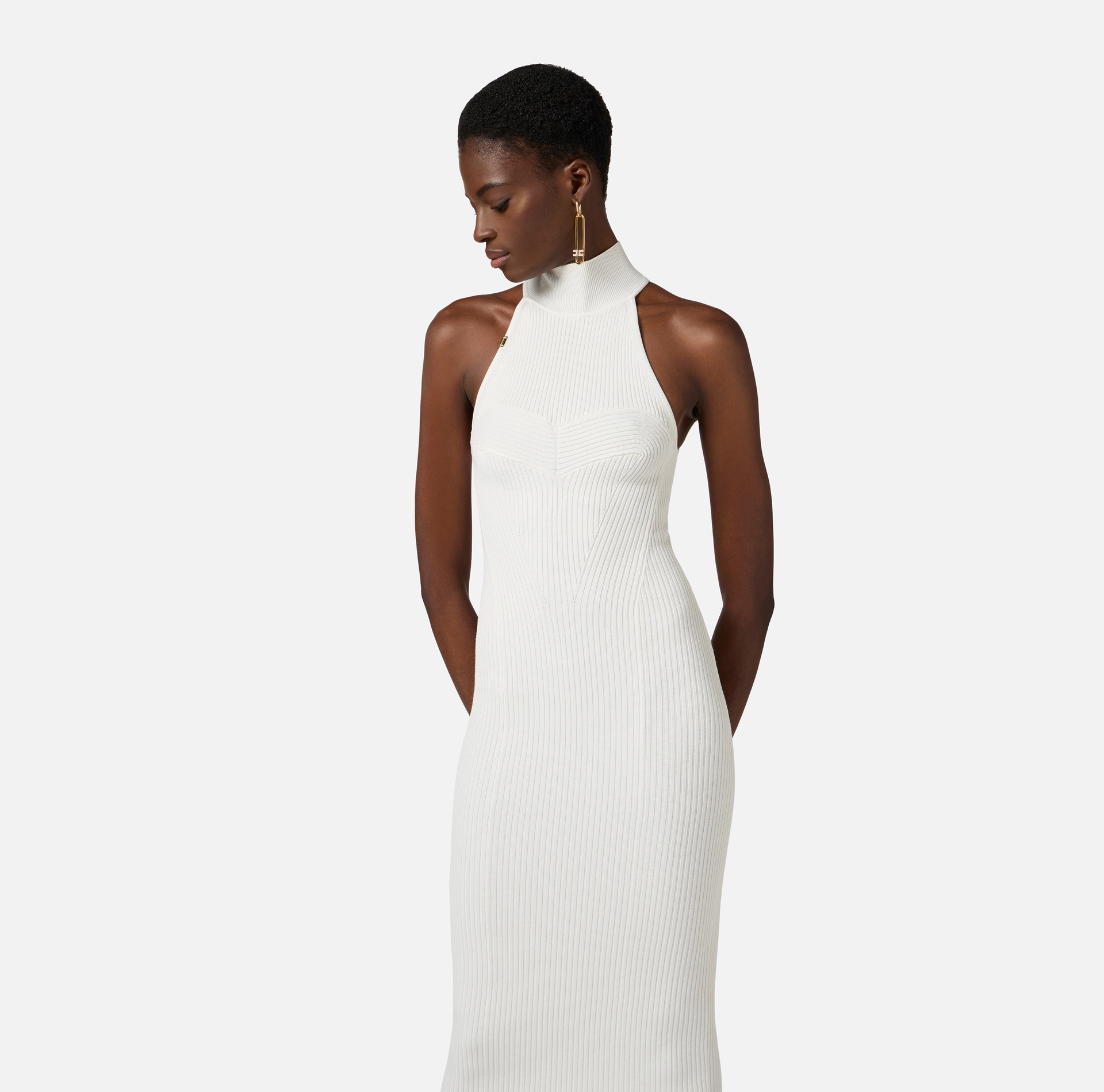 Sukienka z prążkowanej wiskozy z dekoltem halter, golfem i długą spódnicą. Ubranie charakteryzuje się specjalnym wykonaniem z dzianiną w kształcie serca na wysokości piersi. Dopasowany krój.