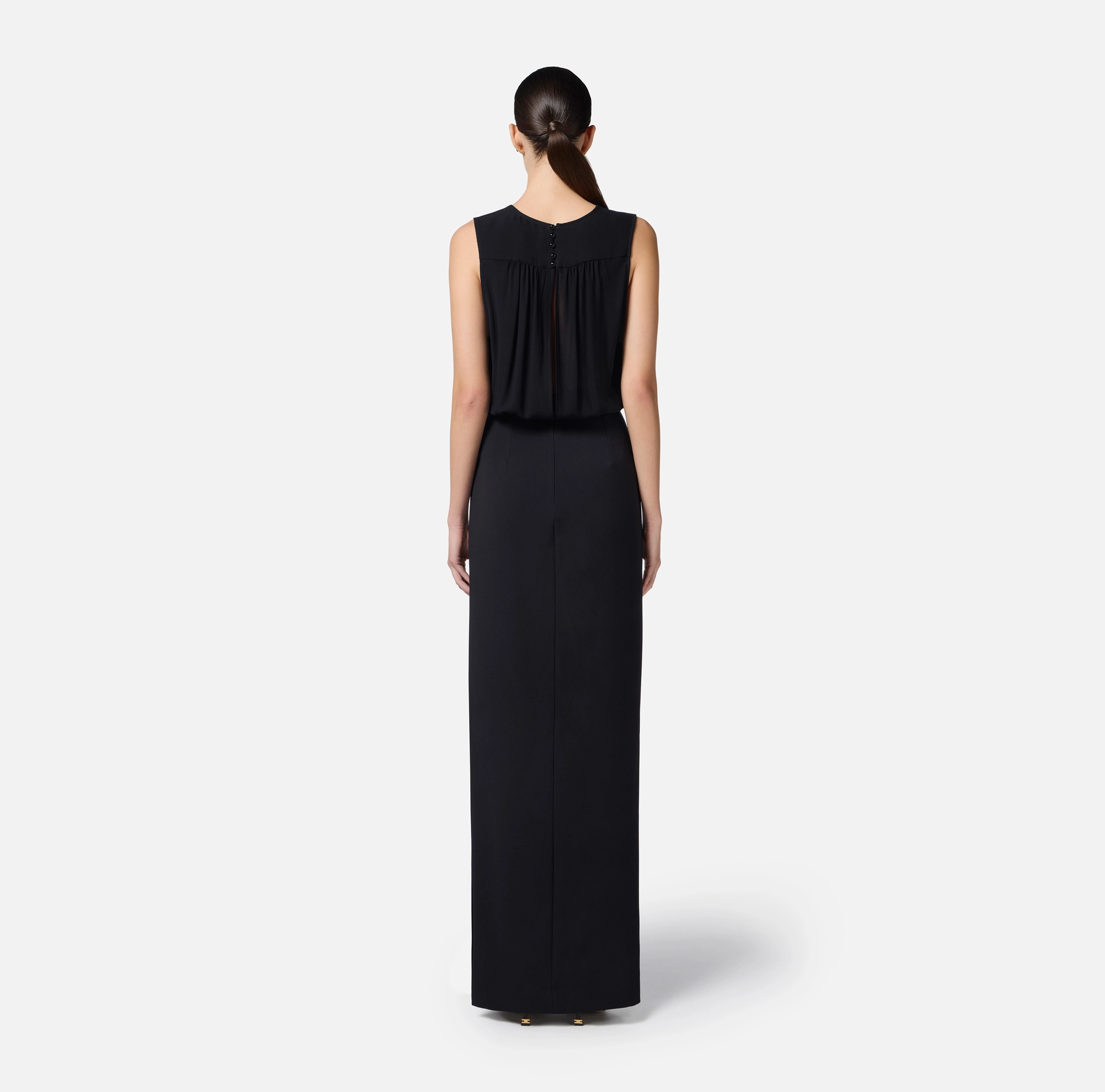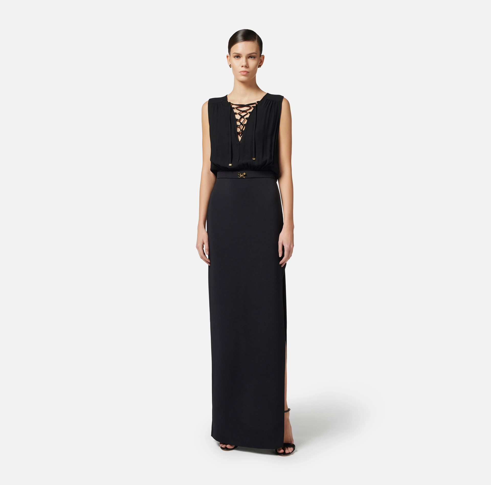 Sukienka bez rękawów z lekkiej dwuwarstwowej krepy z długą spódnicą i rozcięciem z boku. Górna część jest zdejmowana i charakteryzuje się głębokim dekoltem w serek z przeplatanymi koronkami z żorżety i ozdobiona złotymi metalowymi końcówkami z logo. Marszczenia na ramionach dodają ruchu. Ostatnim stylowym detalem jest biżuteryjna kokarda ze złotym metalowym logo w talii. Regularny krój.