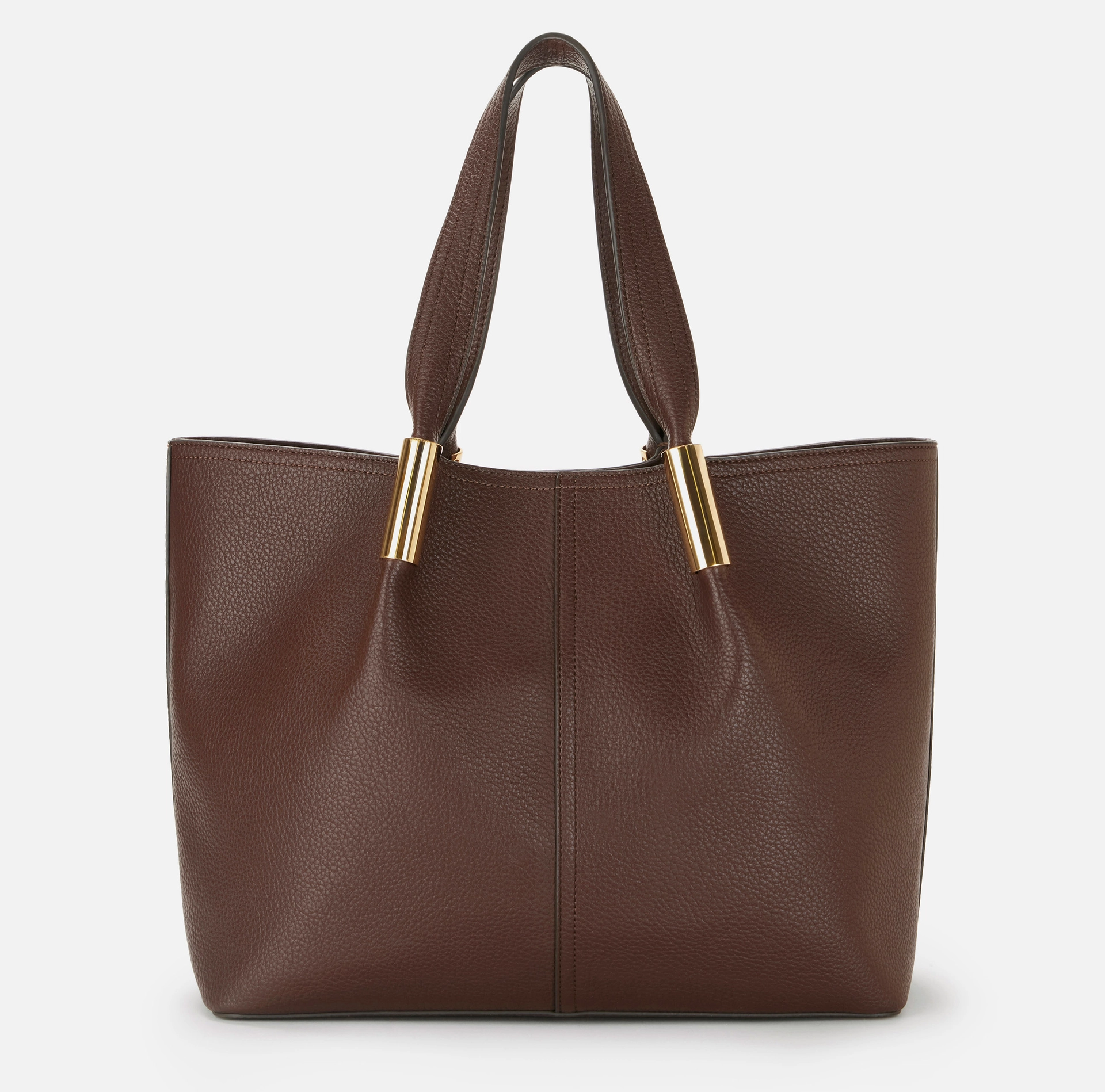 Duża torebka tote wykonana z syntetycznego materiału z efektem skóry. Ma kompaktowy i elegancki kształt, jest ozdobiona elementami z metalu w kolorze złotym z logo. Logo na dole
