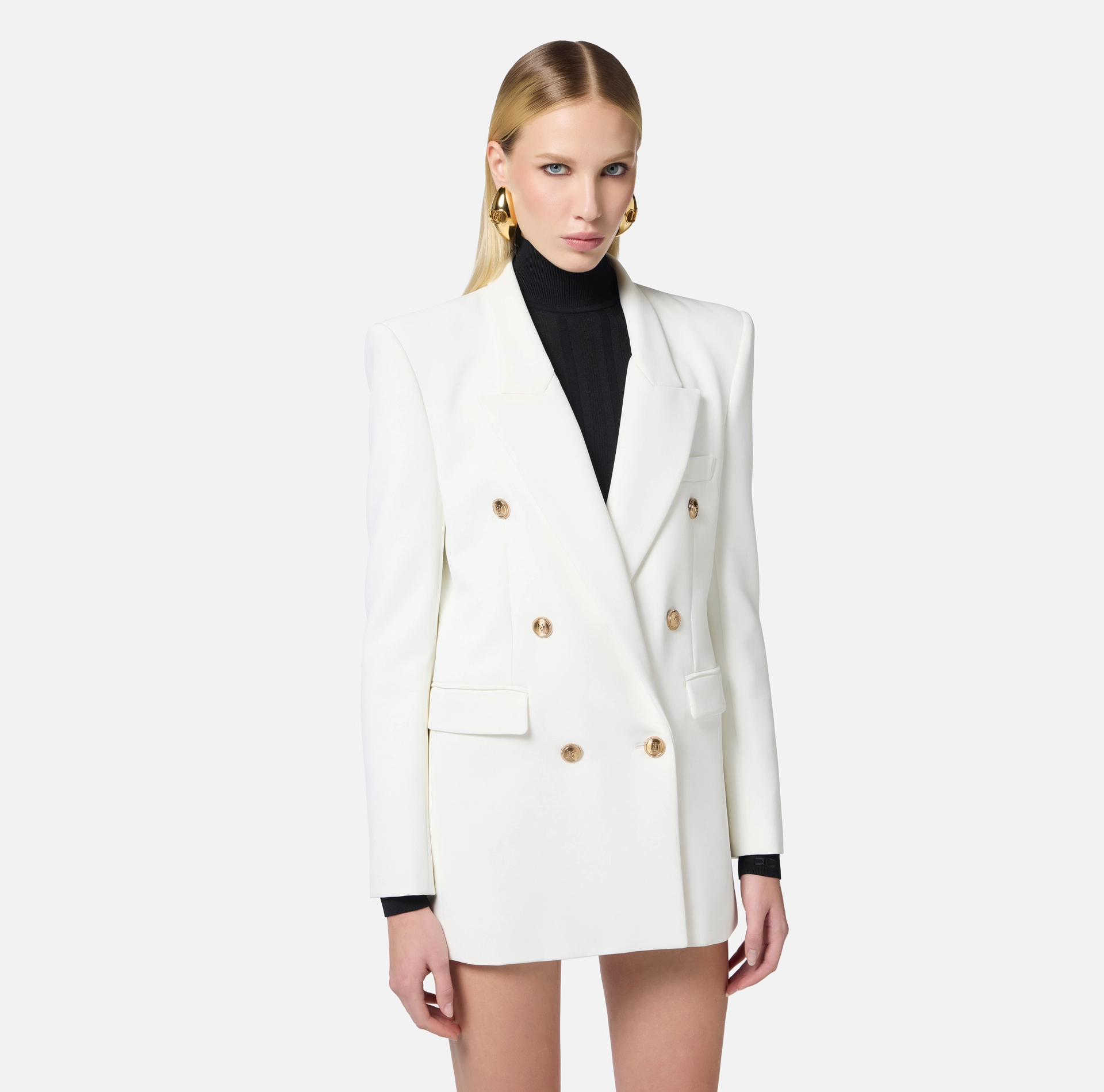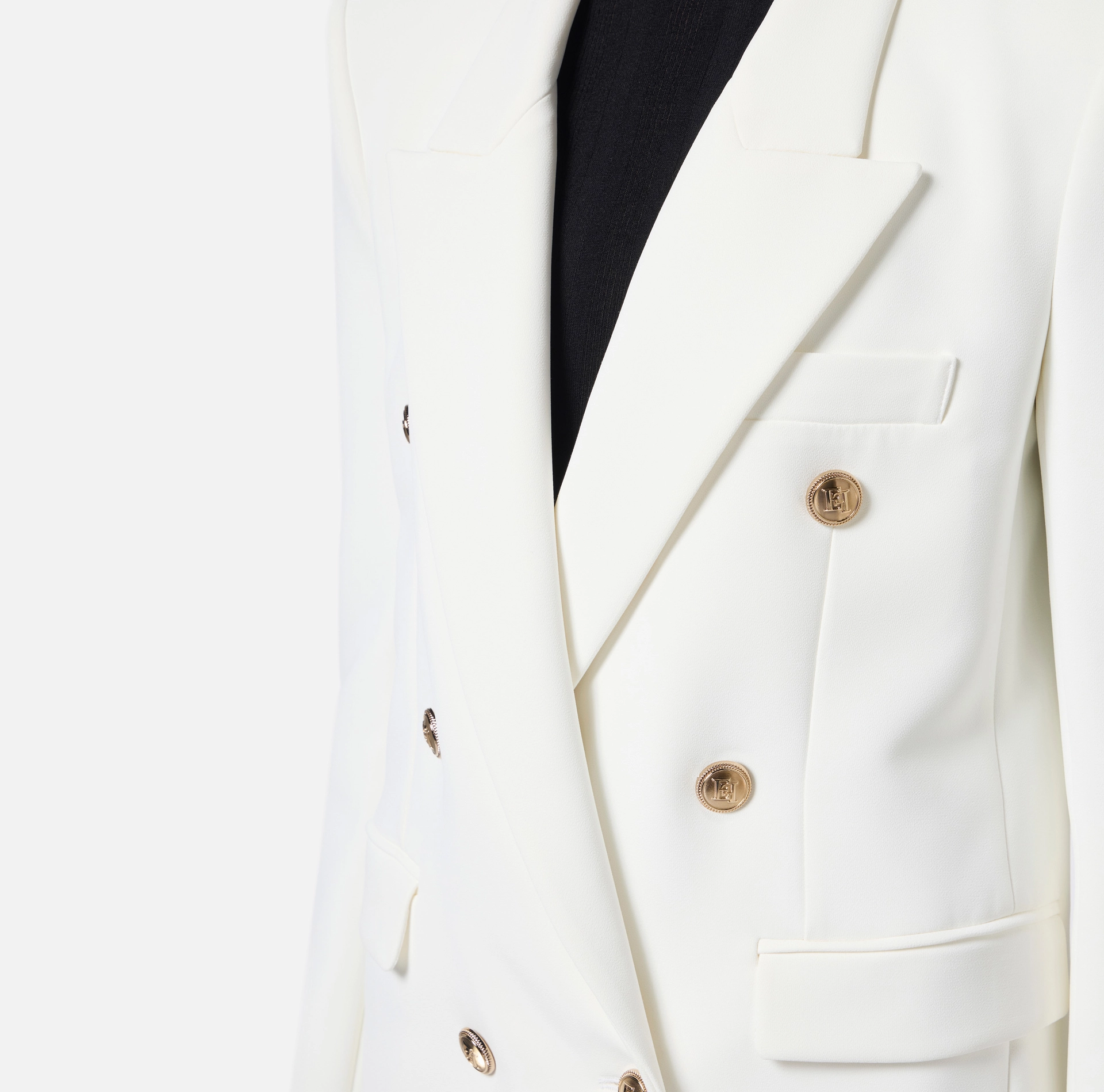Dwurzędowa marynarka z elastycznej krepy. Marynarka ma szpiczaste klapy, długie rękawy i naszywane klapy. Złote metalowe guziki z logo nadają odrobinę lekkości. Luźny krój. Część kolekcji Essential, aby stworzyć idealną garderobę.