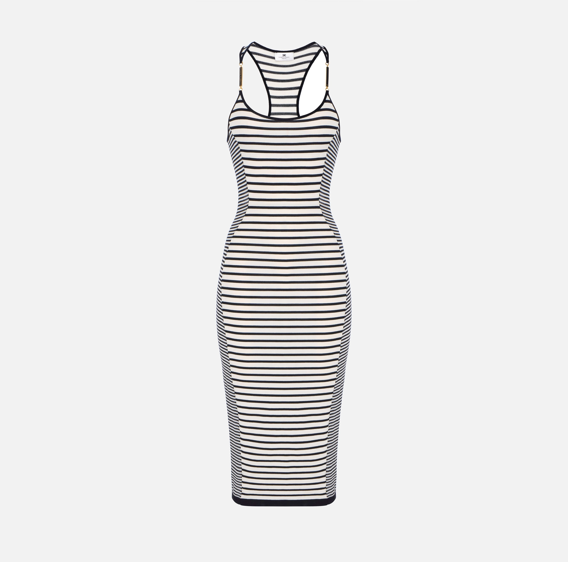 Dzianinowa sukienka o dopasowanym kroju. Model posiada dekolt typu halter ozdobiony klamrami z logo i długość midi. Podwójny wzór w paski wykonany jest z materiałów o różnych teksturach, tworząc optyczne gry przezroczystości wzdłuż boków.