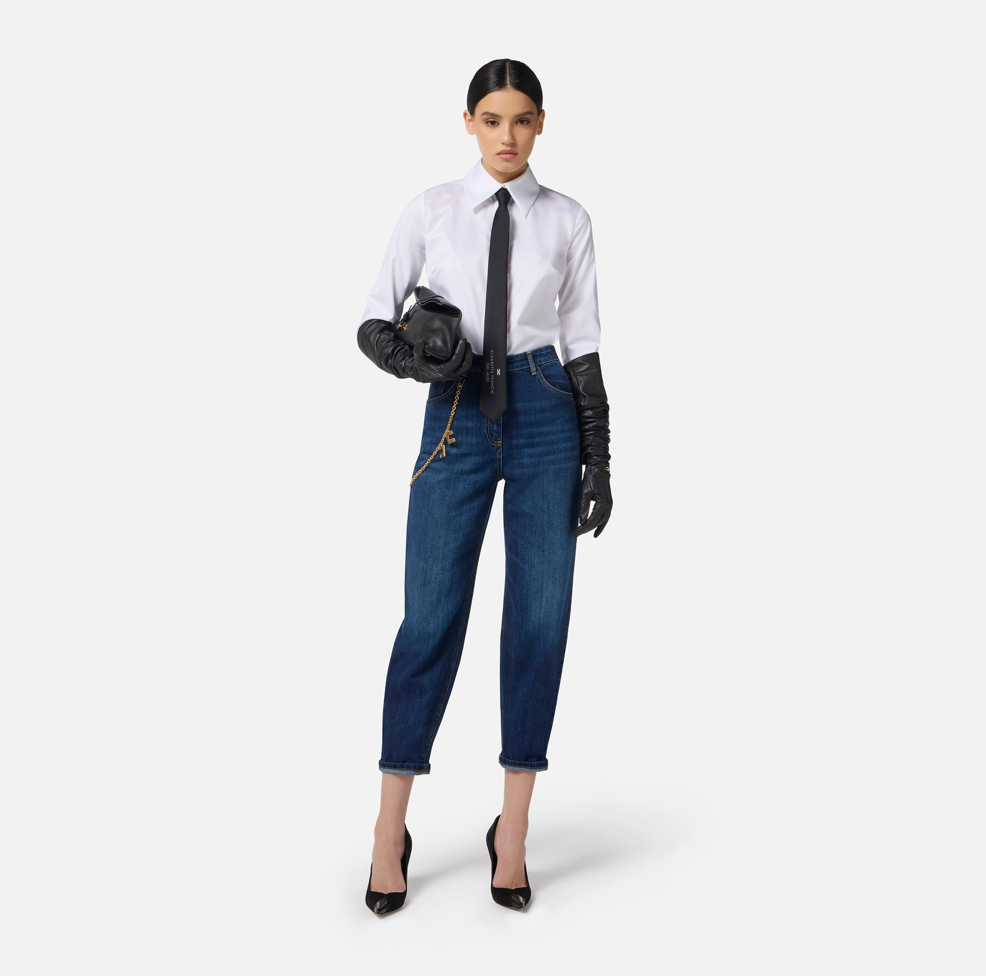 Spodnie z denimu z normalnym stanem i fasonie przypominającym jajko oraz nogawkami wywiniętymi u dołu. Inspirowane ponadczasowym modelem z pięcioma kieszeniami, są ozdobione łańcuszkiem z wiszącym, metalowym logo w kolorze złotym. Z tyłu naszywka z logo. Prosty krój.
