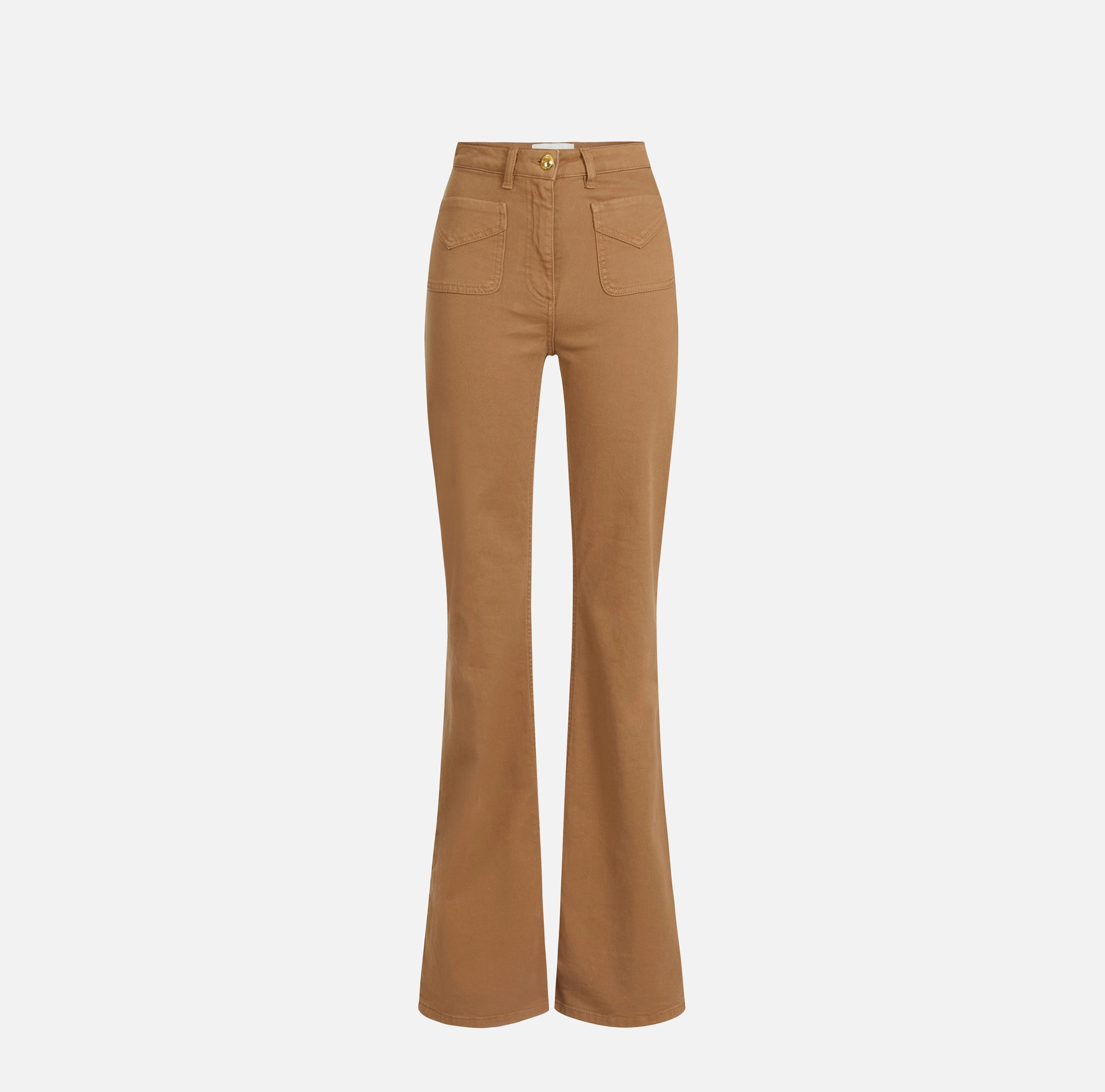 Spodnie z denimu z przedłużanymi nogawkami. Wyróżniają się kieszonkami z patką, rozświetlonymi metalowymi guzikami w kolorze złotym z przodu i blaszką z logo z tyłu. Krój dopasowany.