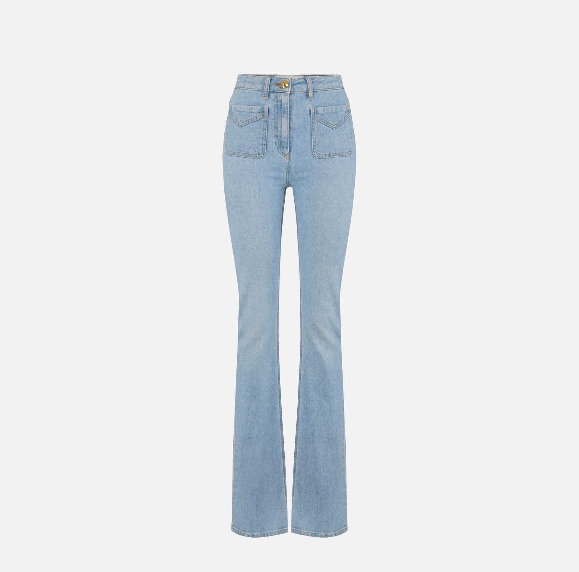 Spodnie z denimu z lekko poszerzanym dołem nogawek. Wyróżniają się kieszonkami z patką, rozświetlonymi metalowymi guzikami w kolorze złotym z przodu i blaszką z logo z tyłu. Krój dopasowany.