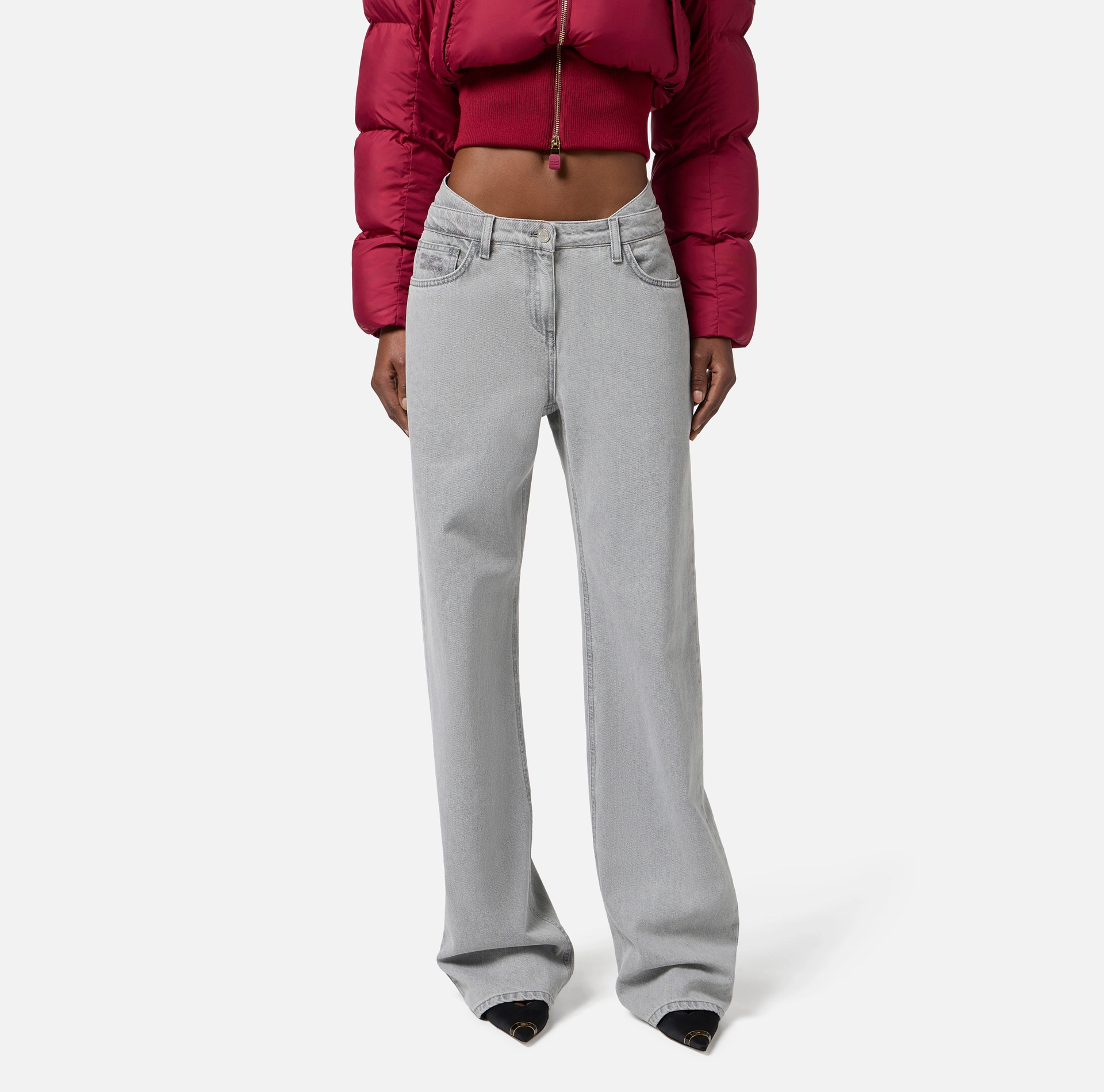 Spodnie z denimu o fasonie z niskim stanem i nogawkami szerokimi u dołu. Wyróżnia je podwójny pasek, który tworzy niecodzienne wycięcia na biodrach i z tyłu. Spodnie, inspirowane ponadczasowym modelem z pięcioma kieszeniami, mają haft z logo na przedniej kieszonce. Naszywka z tyłu. Krój oversize.