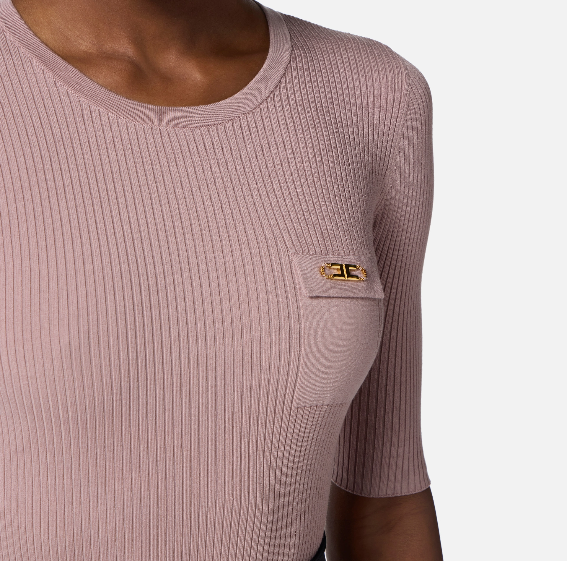 Sweter w prążki, o dopasowanym kroju. Ma okrągły dekolt i rękawy powyżej łokcia, wyróżnia się satynową kieszonką na piersi z elementem z logo, który dodaje ubraniu światła.