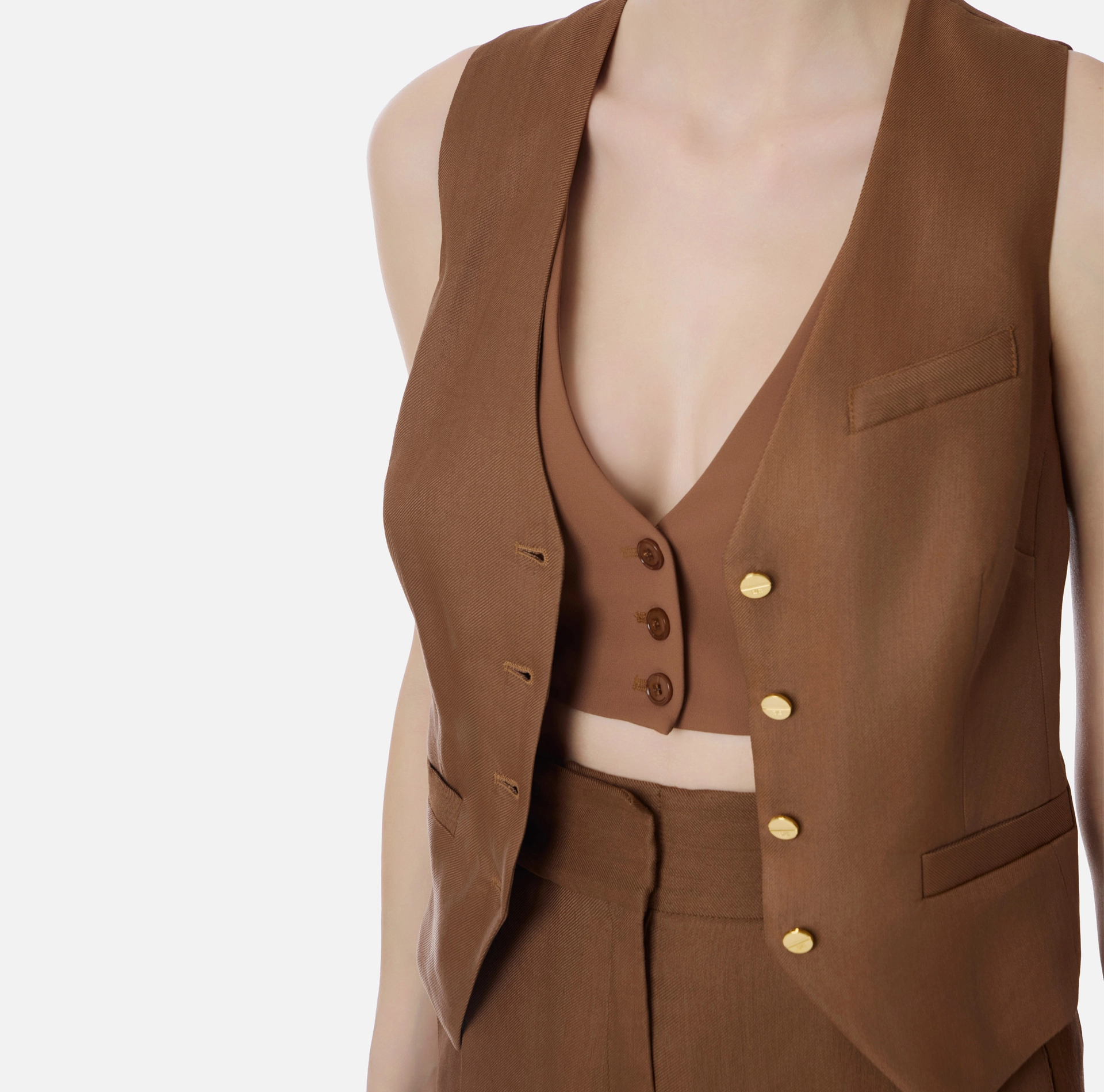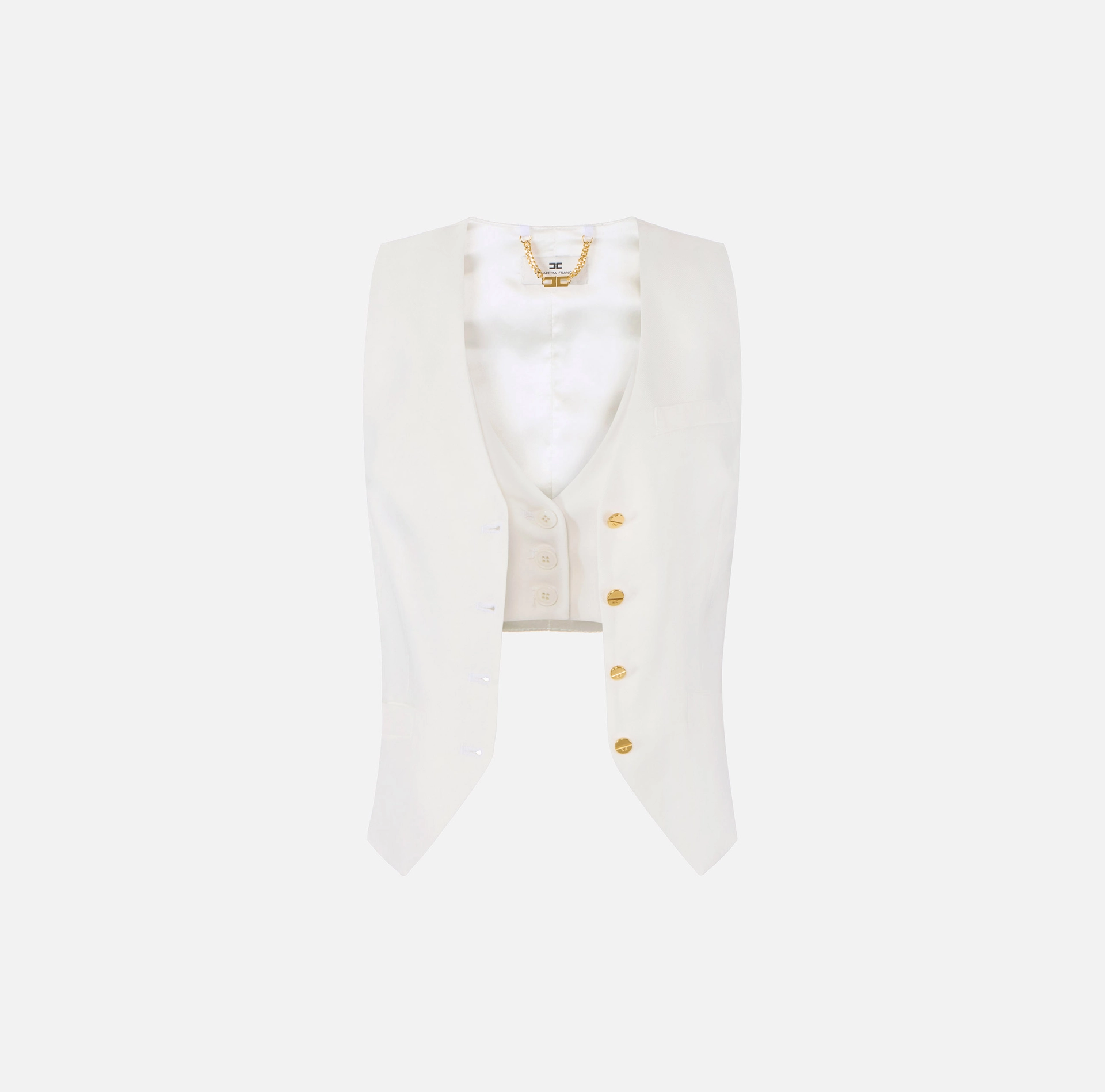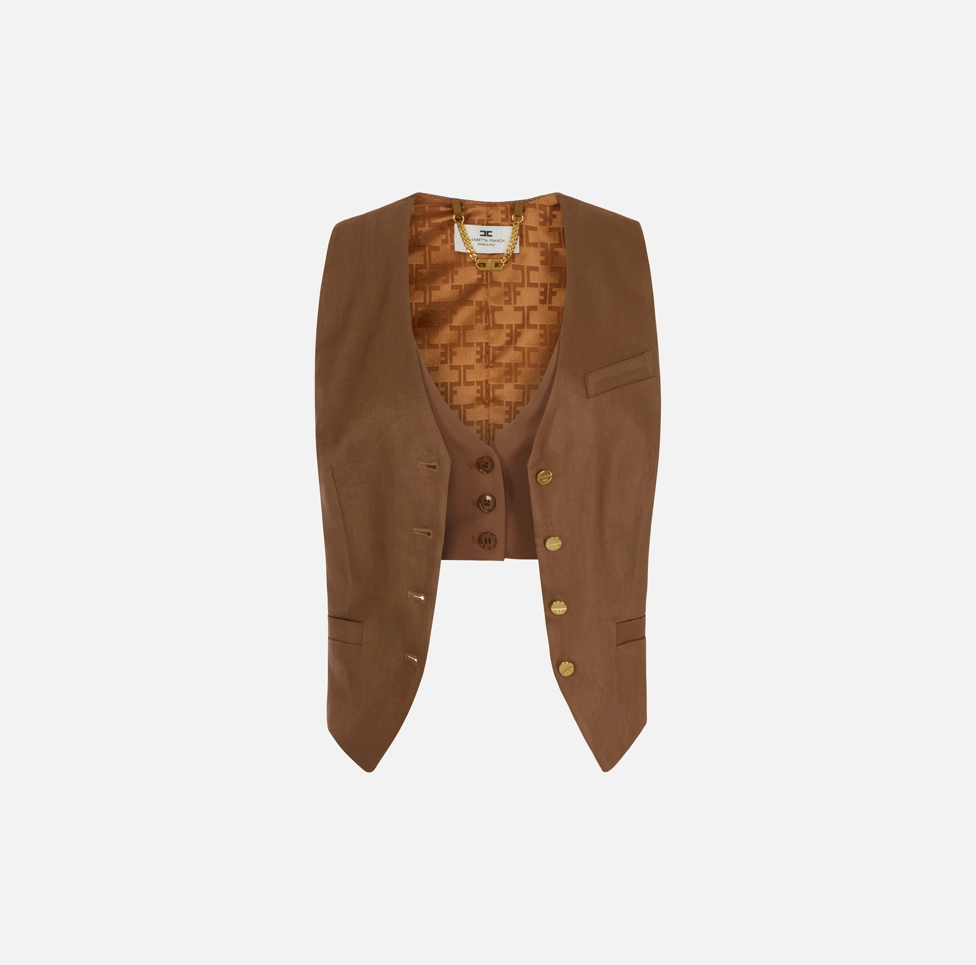 Kamizelka z mieszanki lnu. Wyróżnia się asymetrycznymi cięciami oraz co daje efekt podwójnej kamizelki wykonanej z krepy. Tył ozdobiony jest paseczkami z pierścieniami i złotymi, metalowymi guzikami, które dodają blasku. Prosty krój.