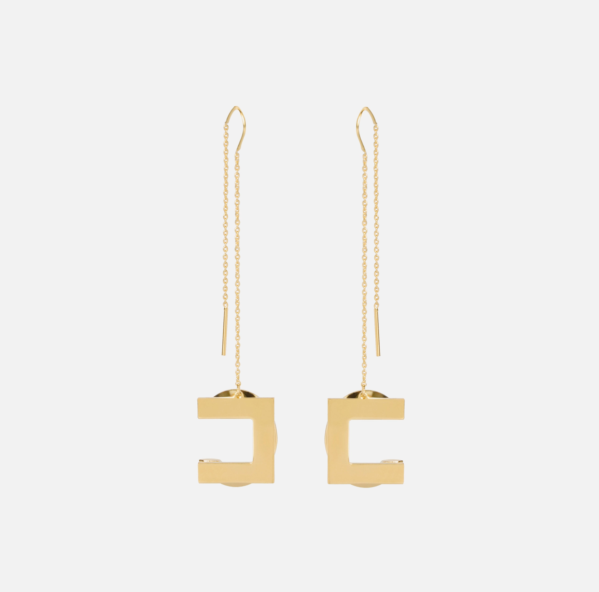 Kolczyki ze zwisającymi łańcuszkami, wykonane z metalu ze złoconym wykończeniem, zakończone detalem z logo na jednym końcu.