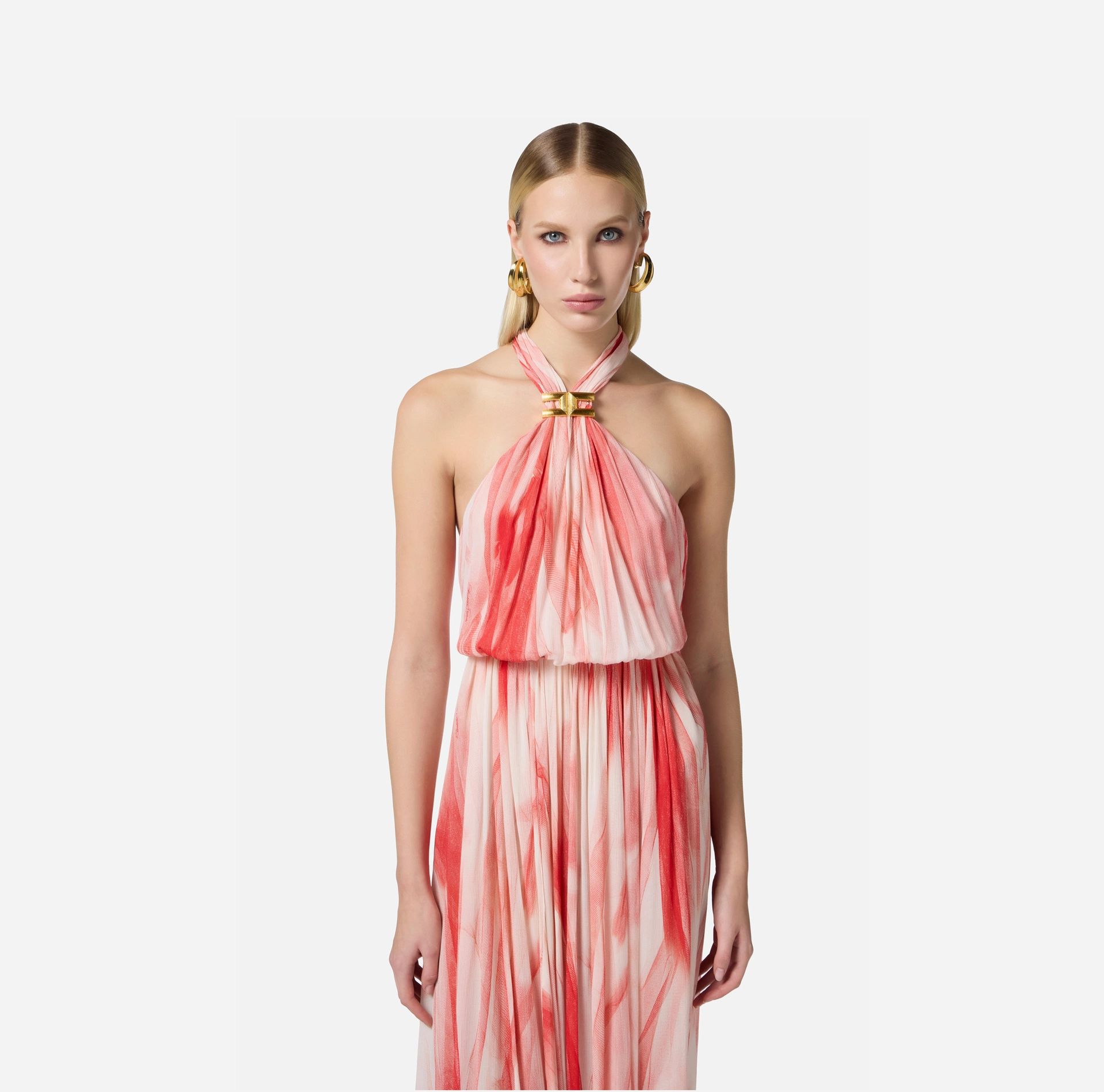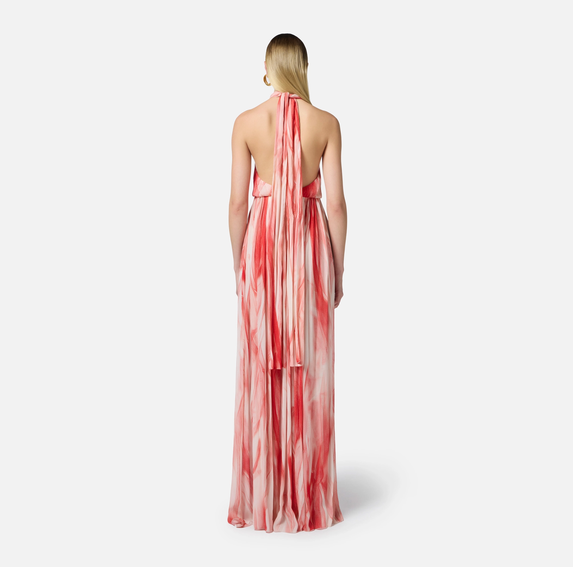 Suknia wieczorowa z wiskozy. Sukienka ma odsłonięte ramiona, zawiązywane szarfą pod szyją i wyróżnia się nadrukiem na całej powierzchni, który przywodzi na myśl zwiewny efekt warstwowego tiulu. Ostatnim akcentem świetlnym jest logo na dekolcie. Regularny krój.