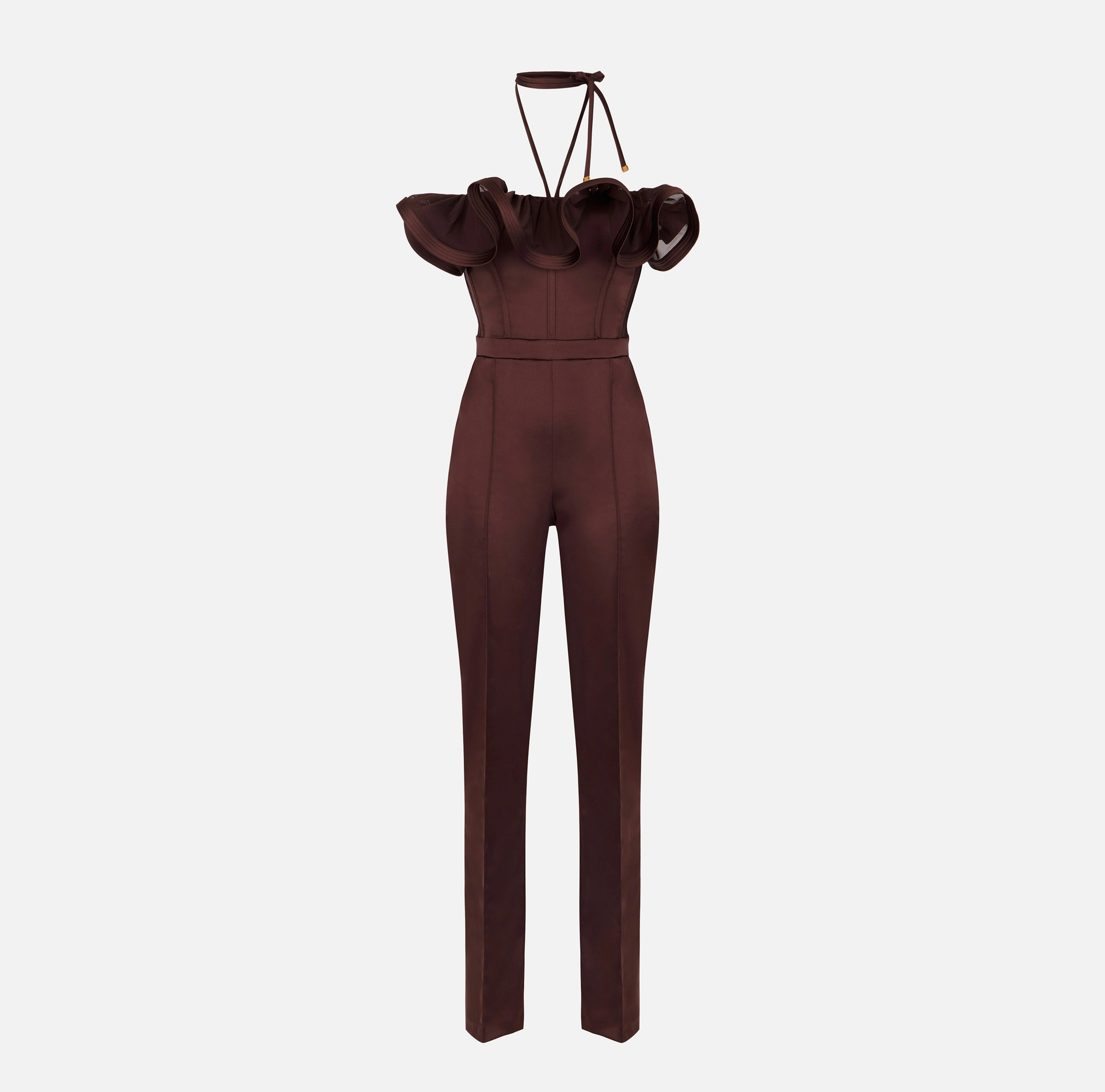 Kombinezon z elastycznej satyny. Model ma odkryte ramiona i długie spodnie. Głównym elementem jest olbrzymia falbana: wykonana z tiulu, tworzy ona subtelny kontrast materiałowy, usztywniona jest wewnętrzną krynoliną pozwalającą uzyskać przyciągającą wzrok objętość, a utrzymywana jest tasiemką w stylu chokera. Prosty krój.