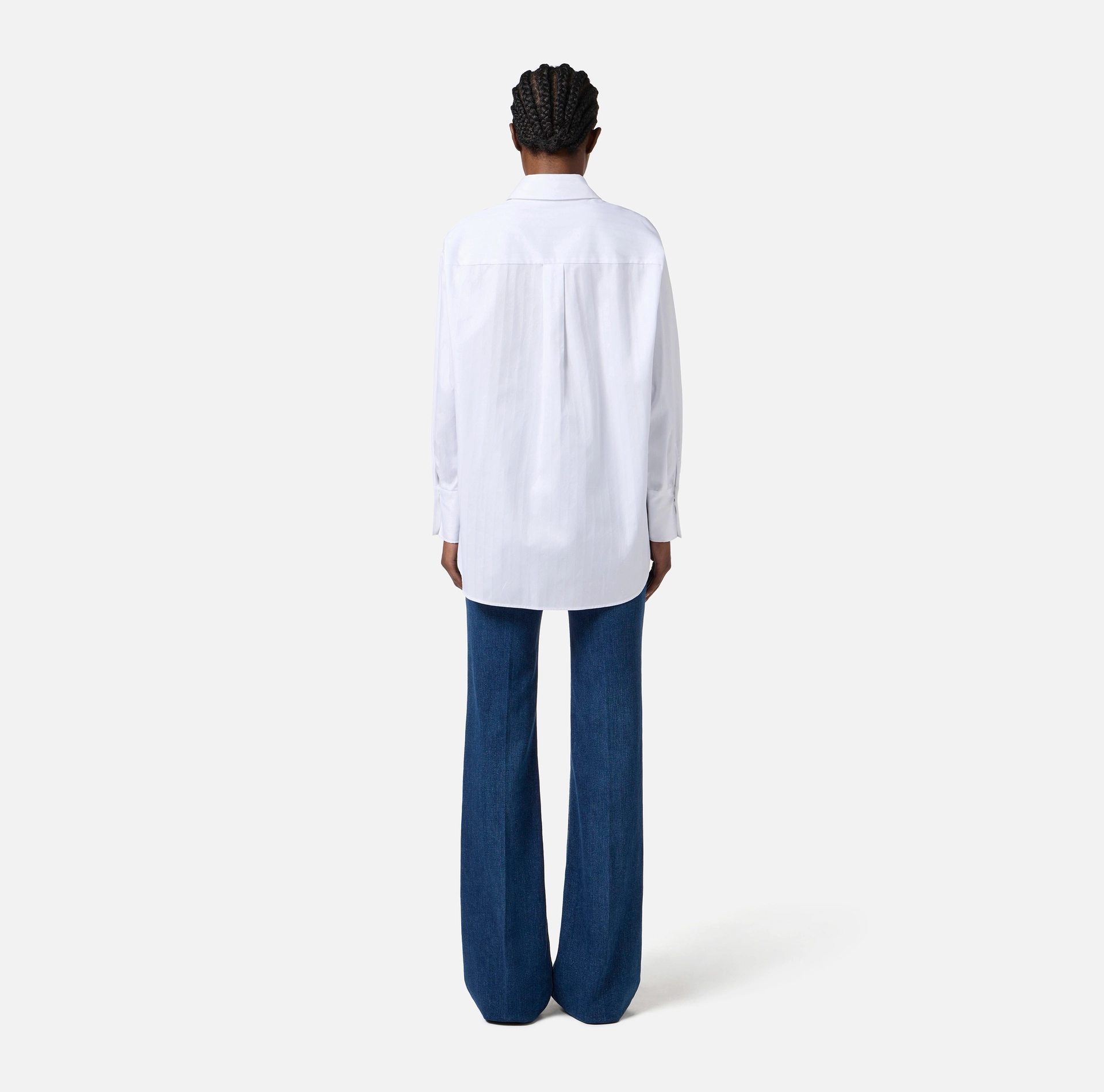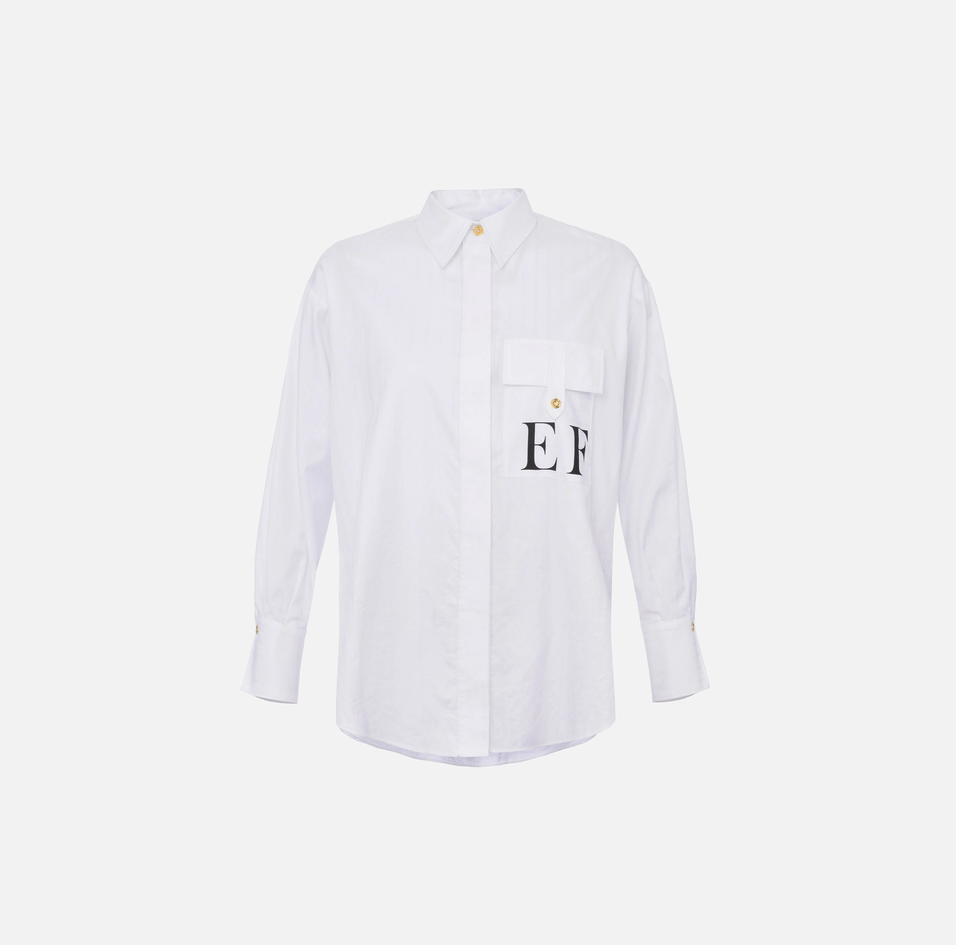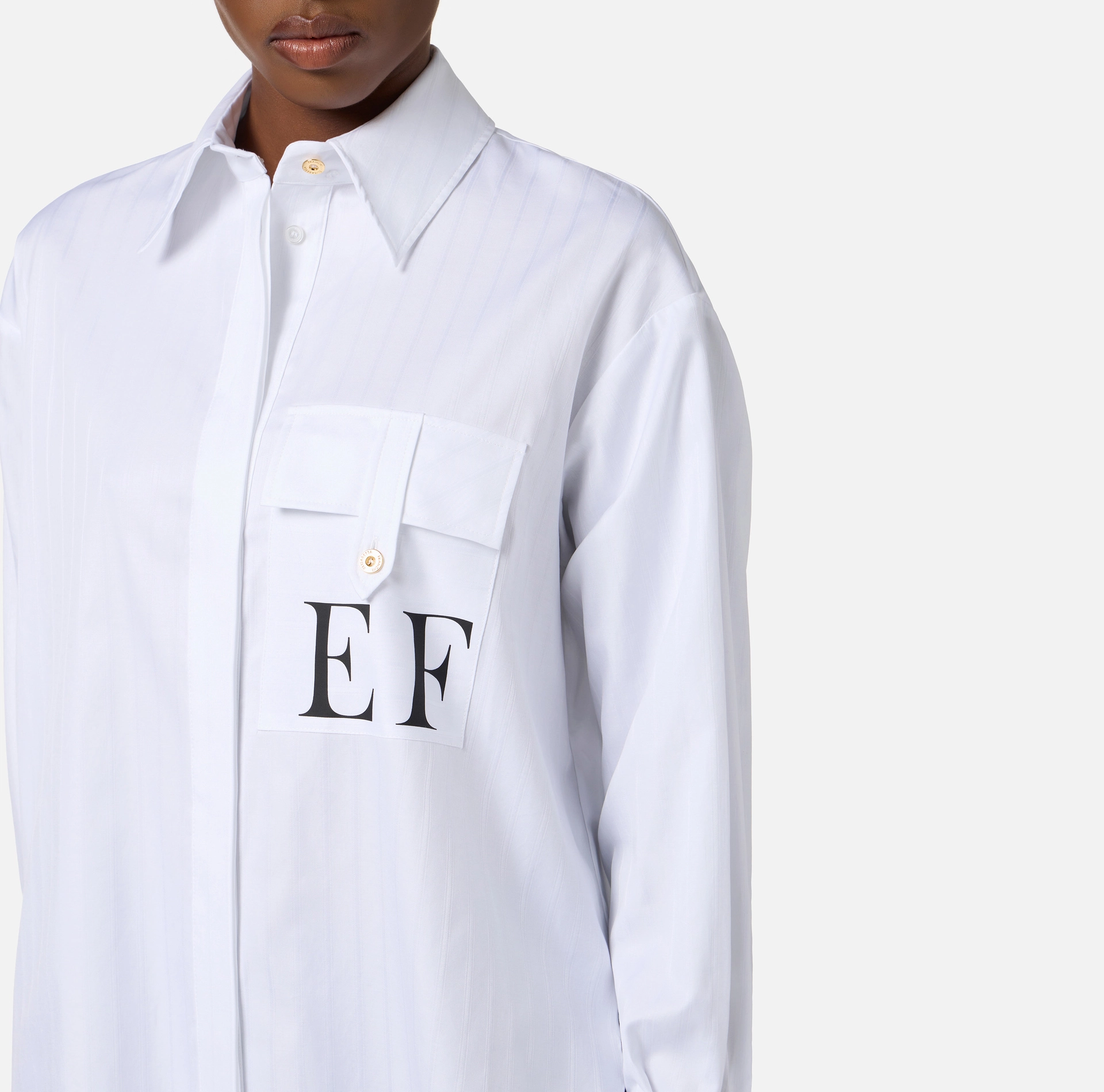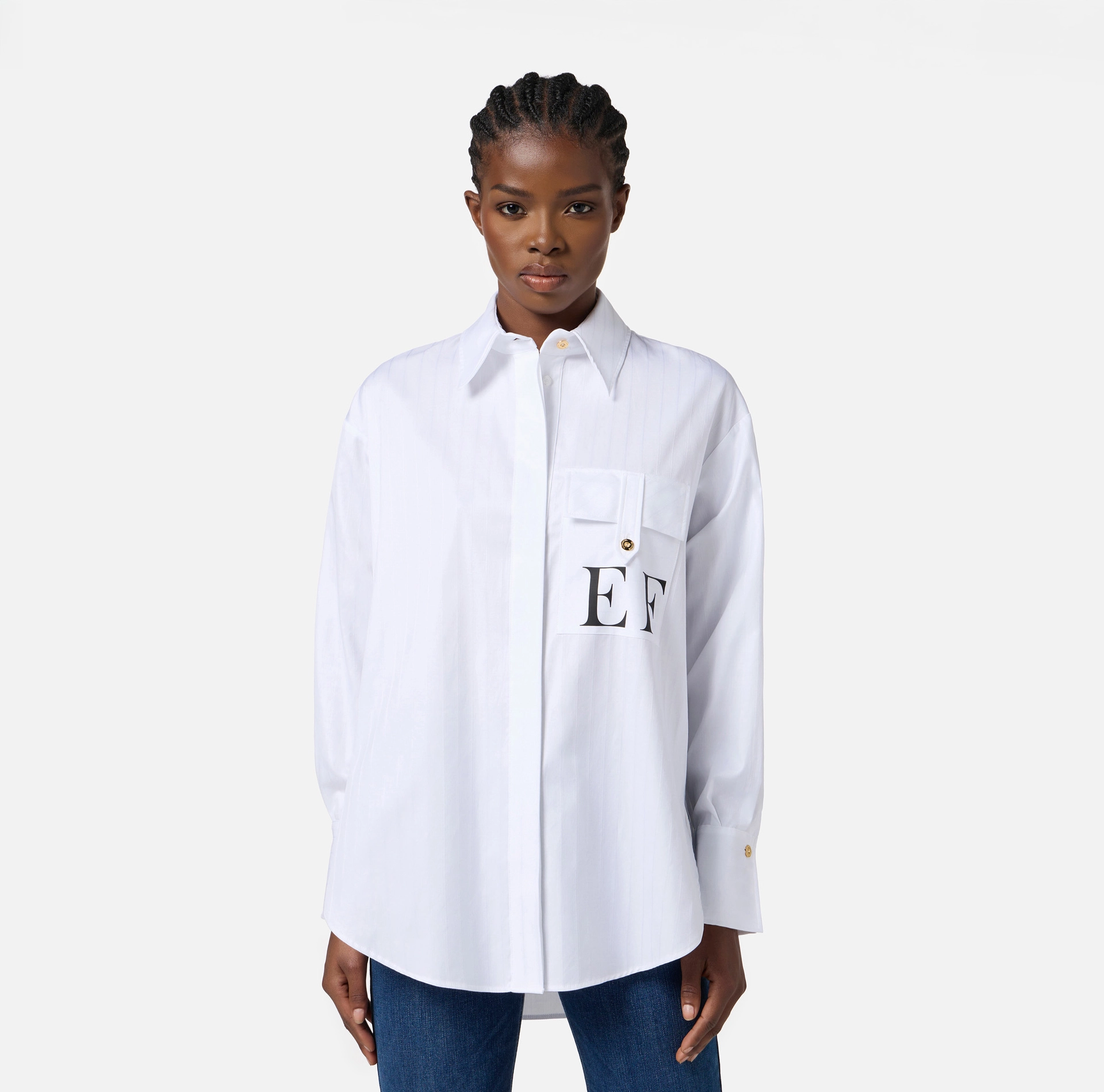 Koszula z bawełnianej popeliny, o luźnym kroju. Z klasycznym kołnierzykiem i długimi rękawami z wysokimi mankietami, ma kieszonkę na piersi i dziurkę z dopasowanym guziczkiem z metalu w kolorze złotym, z nadrukowanym logo w kontrastującym kolorze. Wzór w paski w tym samym odcieniu nadaje wyrafinowanej lekkości.