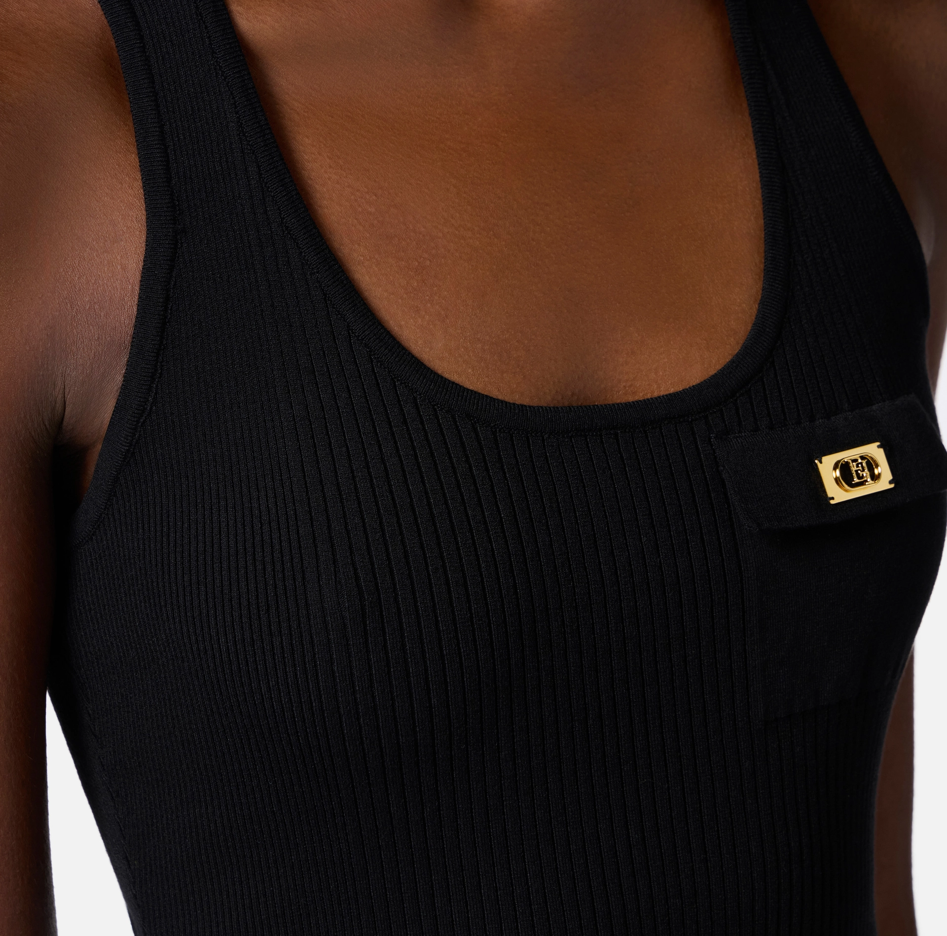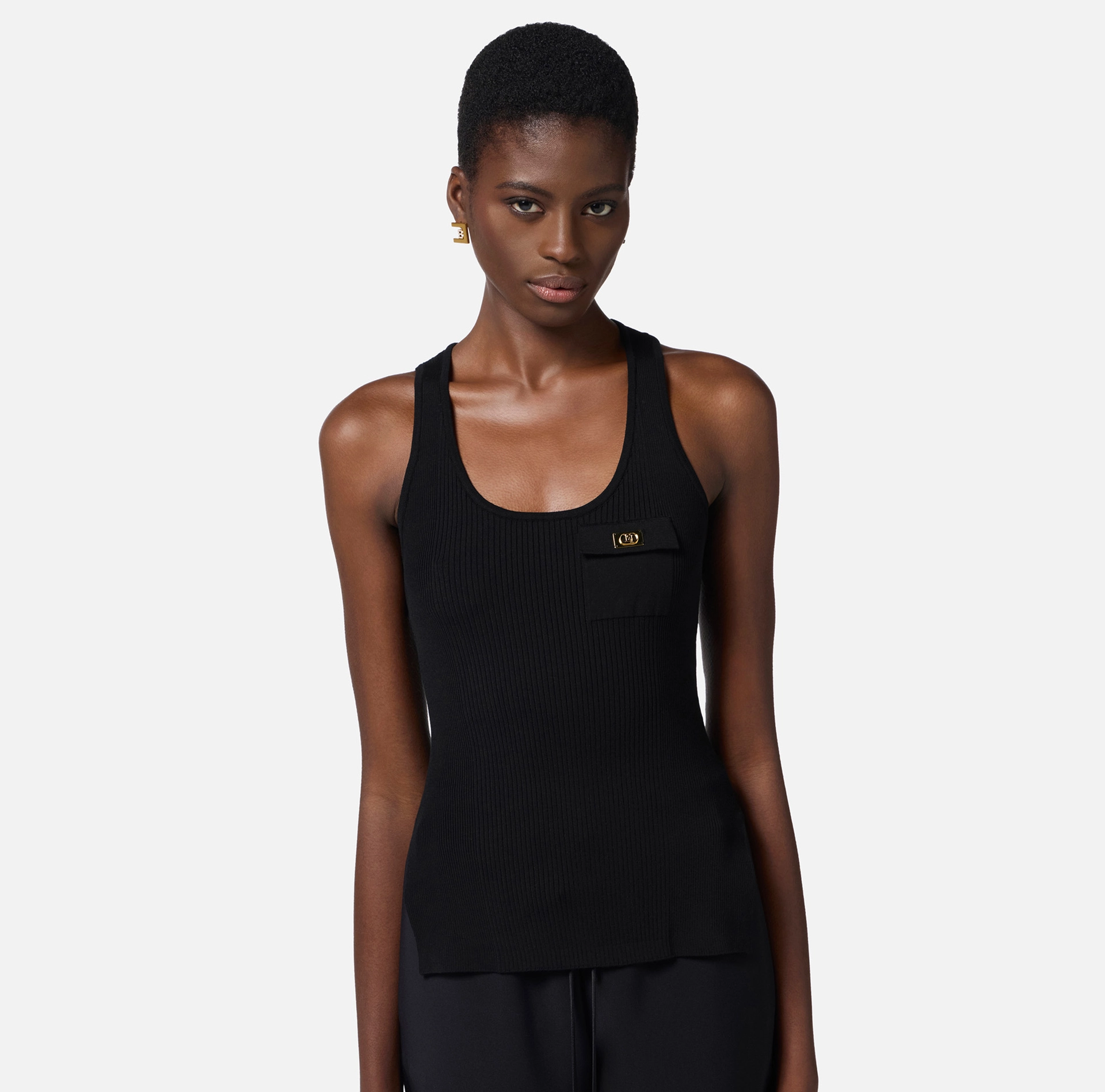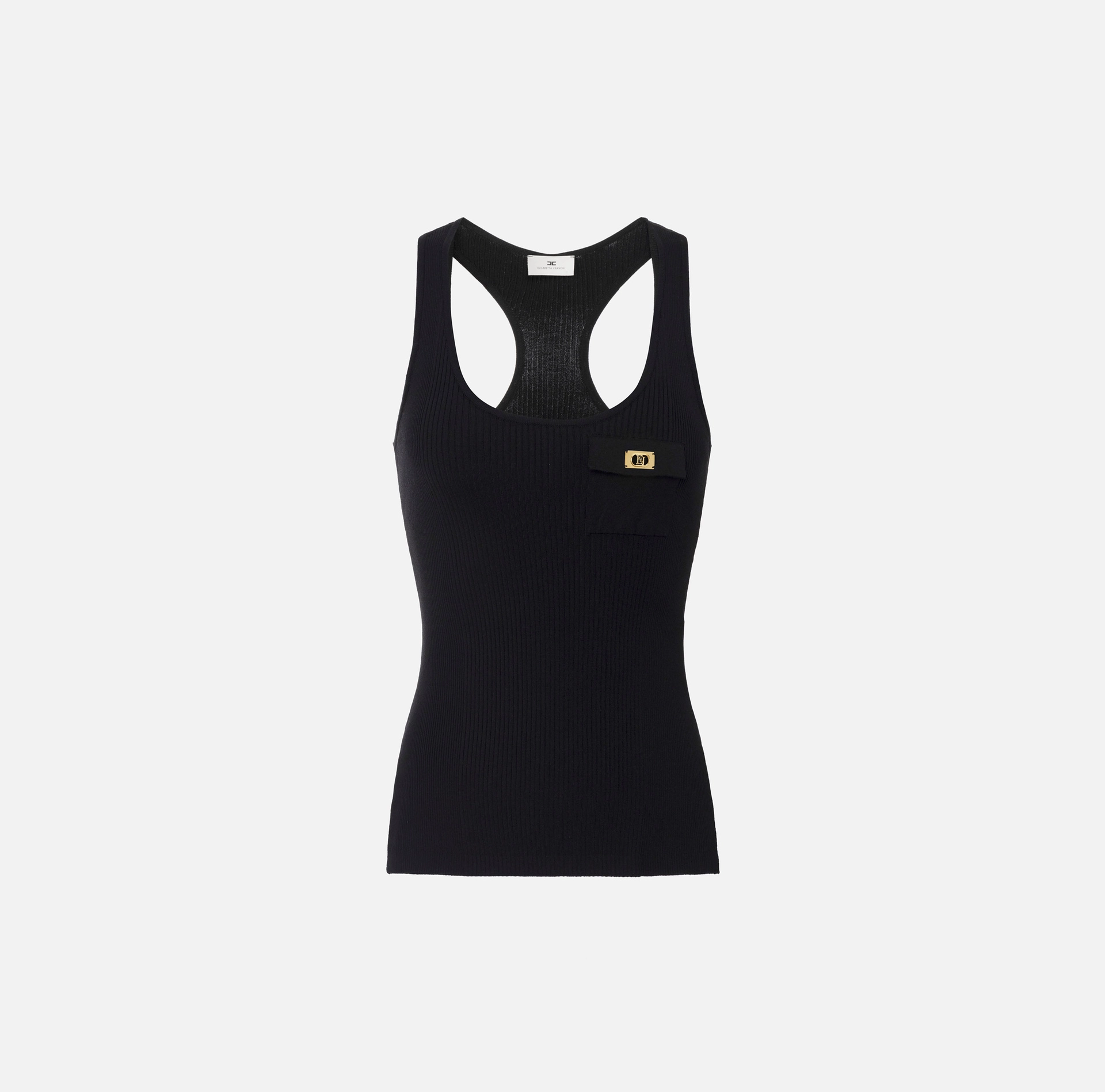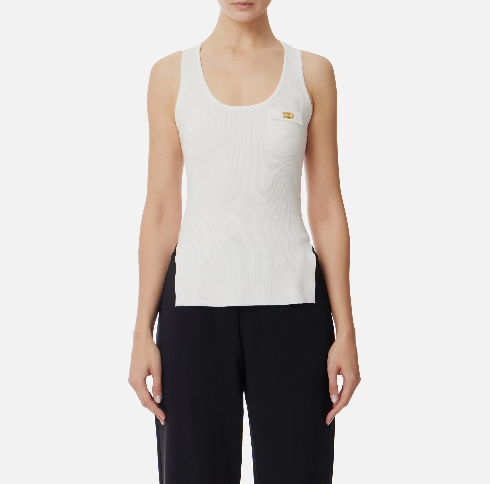 Koszulka bez rękawów z mieszanki lyocellu i jedwabiu, z mikro prążkowaniem i sportowym tyłem. Kieszonkę rozświetla mała blaszka ze złoconego metalu z logo. Krój dopasowany.