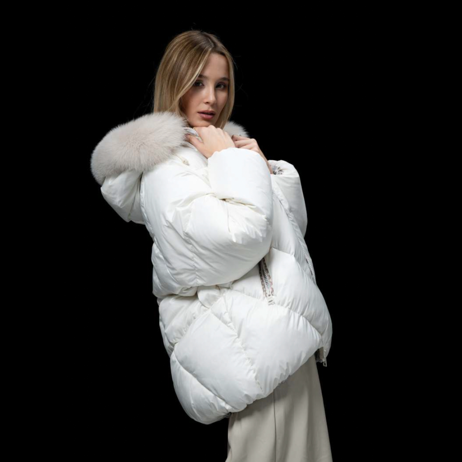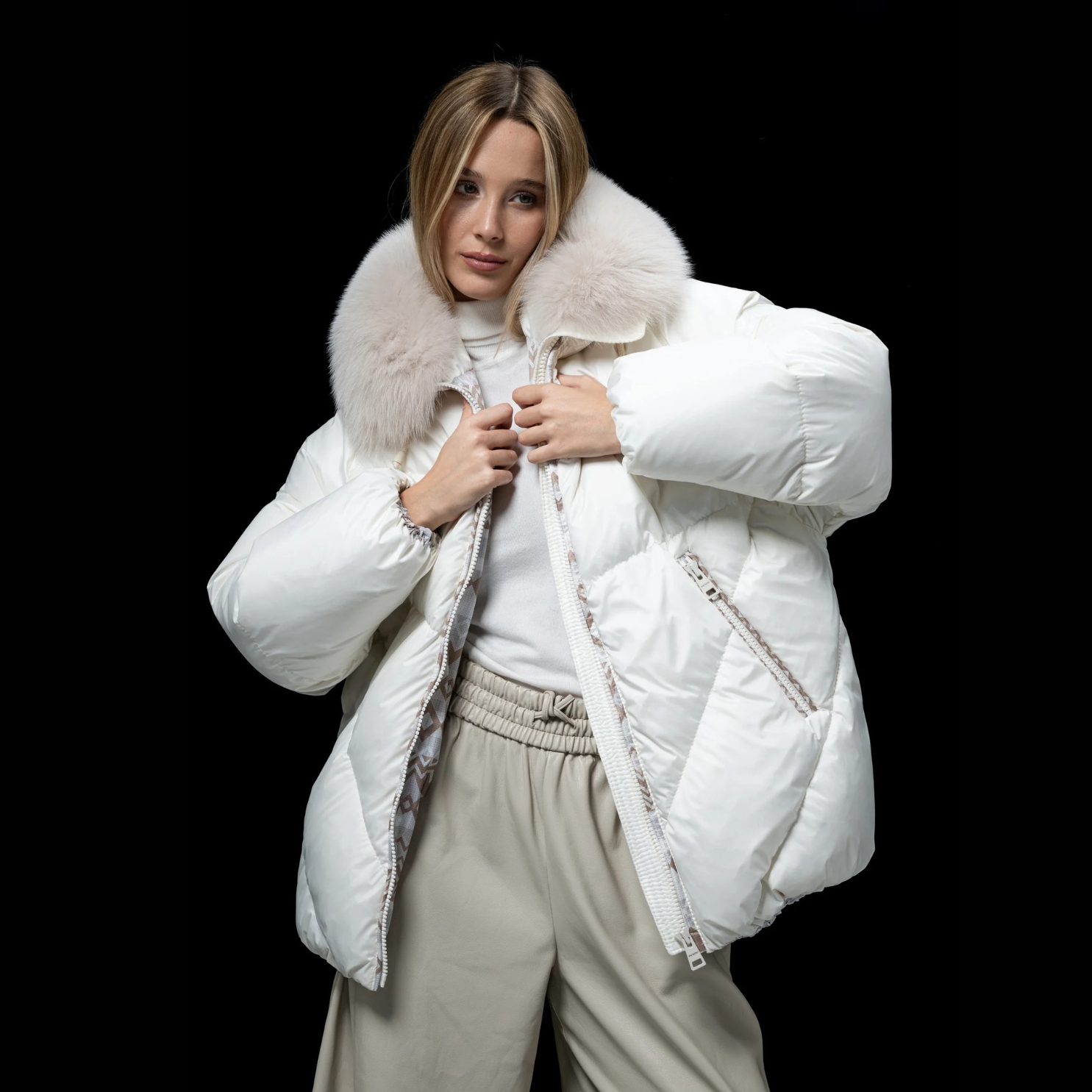 Obszerny kaptur i kołnierz obszyty naturalnym futrem z lisa dodaje całości szykownego charakteru i zapewnia ochronę przed zimnem. Wyjątkowe detale wykończenia, subtelny połysk materiału oraz perfekcyjne włoskie krawiectwo sprawiają, że ta kurtka wyróżnia się wśród modeli premium.