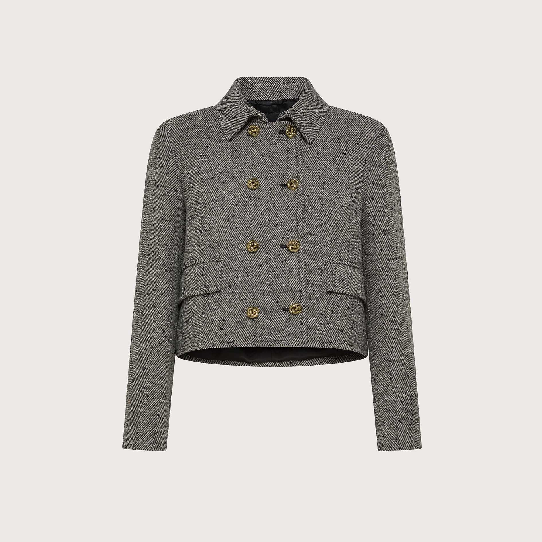 Żakiet wyróżnia się krótkim, lekko pudełkowym fasonem, który subtelnie podkreśla sylwetkę. Dwurzędowe zapięcie na złote guziki nadaje całości szyku, a charakterystyczny wzór jodełki w odcieniach szarości dodaje mu klasycznego, eleganckiego charakteru.