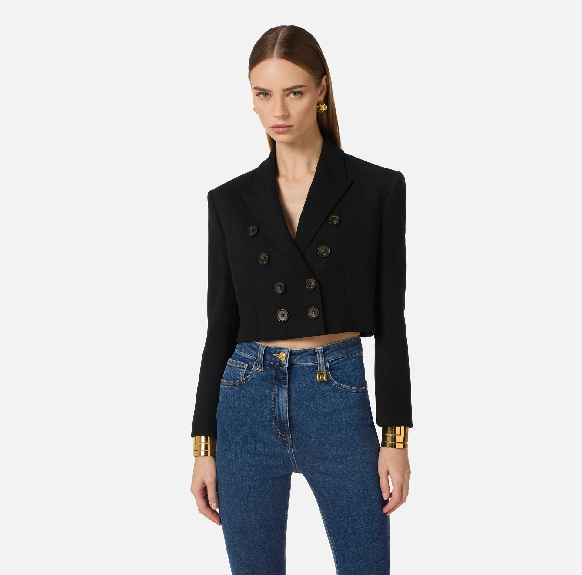 Żakiet z gabardyny z rękawami 7/8. Wyprofilowane ramiona i długość cropped zapewniają wyrazisty, geometryczny fason, podkreślony szerokim wykładanym kołnierzem tworzącym szpic i dwurzędowym zapięciem.
