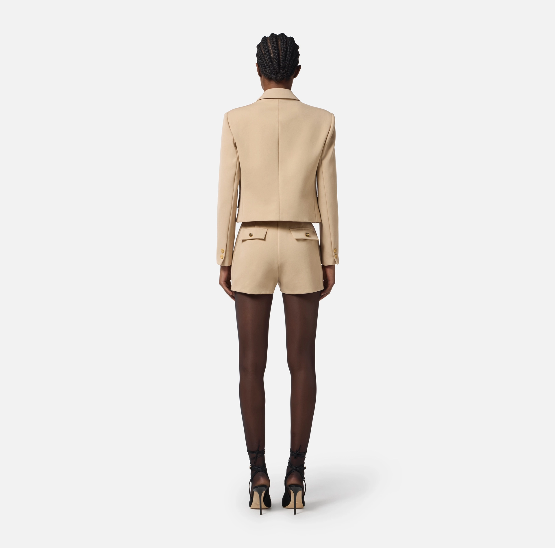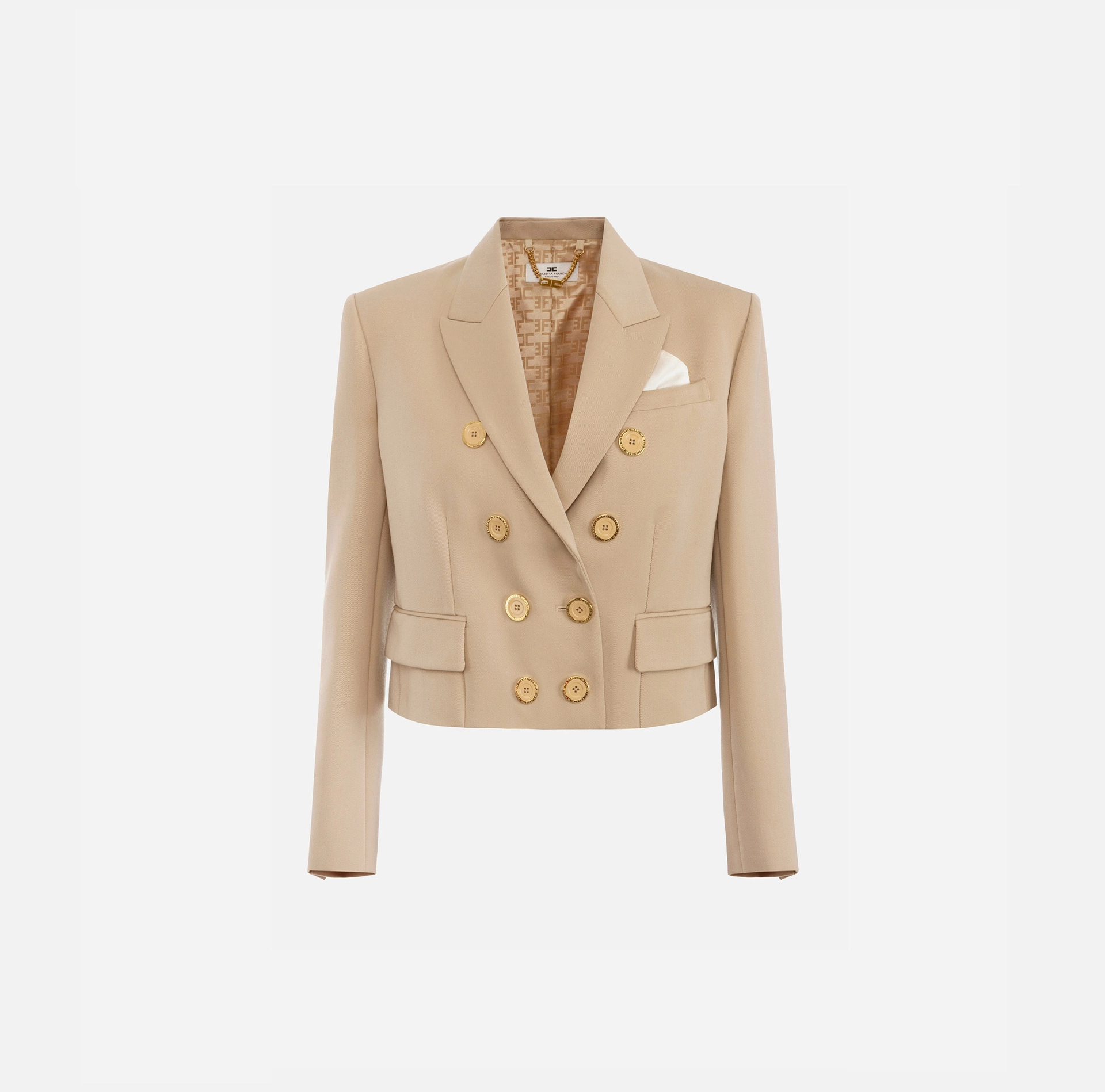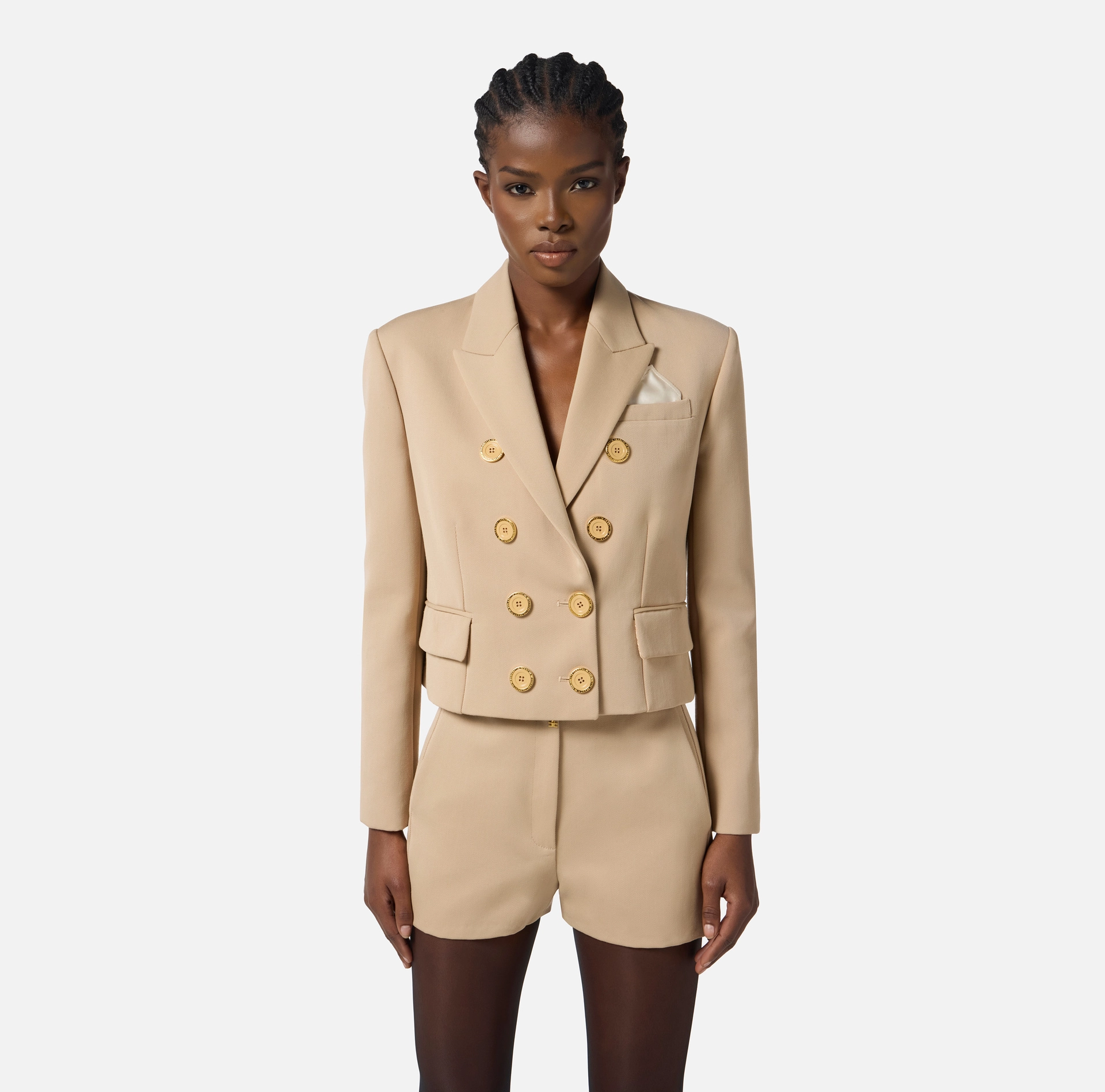 Krótka marynarka z gabardyny z domieszką wełny o regularnym kroju. Marynarka ma usztywnione ramiona, klapy w szpic i aplikacje z patkami. Stylowym detalem jest kieszeń na piersi z poszetką z jedwabnej satyny.
