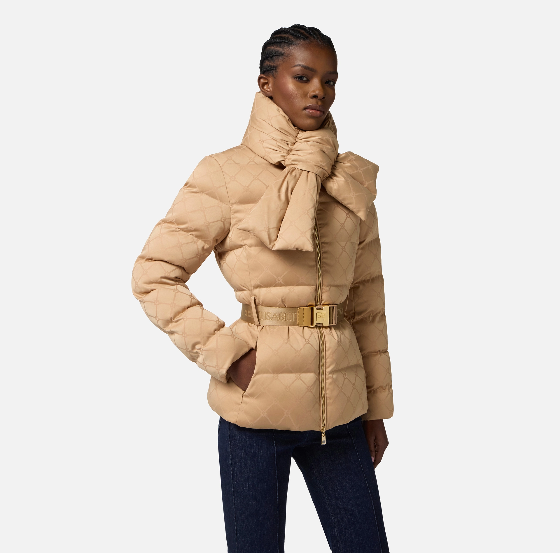 Kurtka puchowa z tkaniny żaglowej, o prostym kroju. Posiada odpinany, wyściełany kołnierz szalowy i kieszenie z niewidocznym zamkiem błyskawicznym. Żakardowy wzór w romby na całej powierzchni dodaje teksturze szlachetności. Pasek z klamrą podkreśla talię.