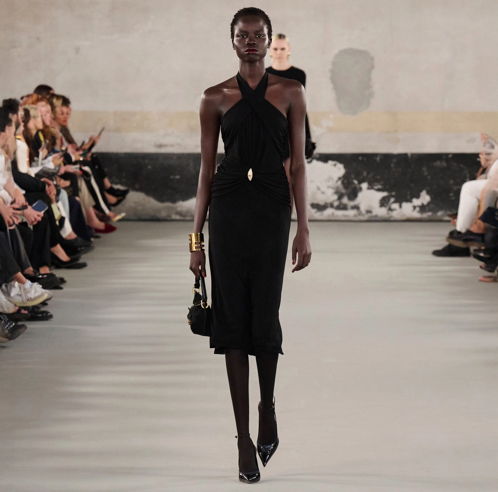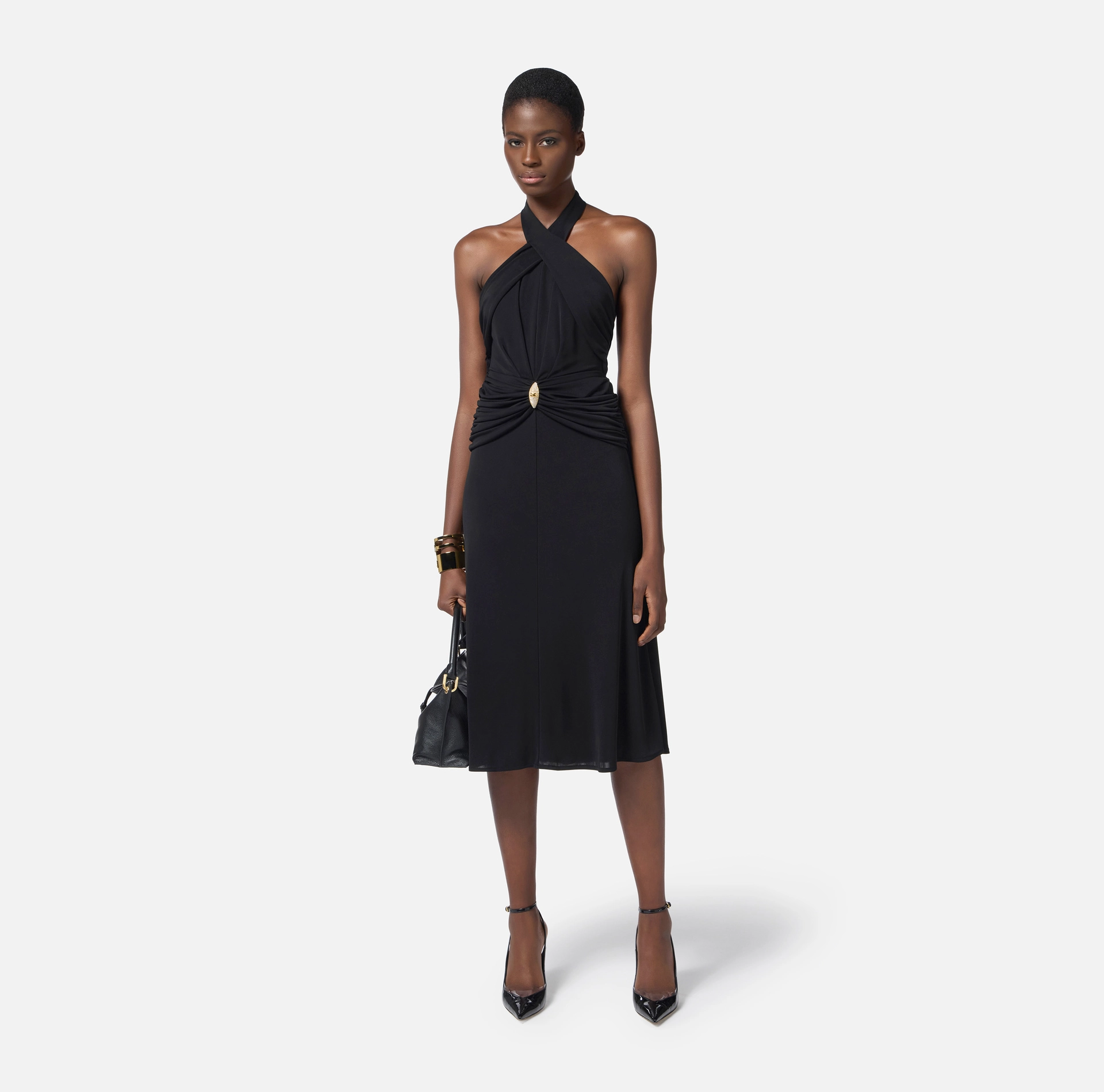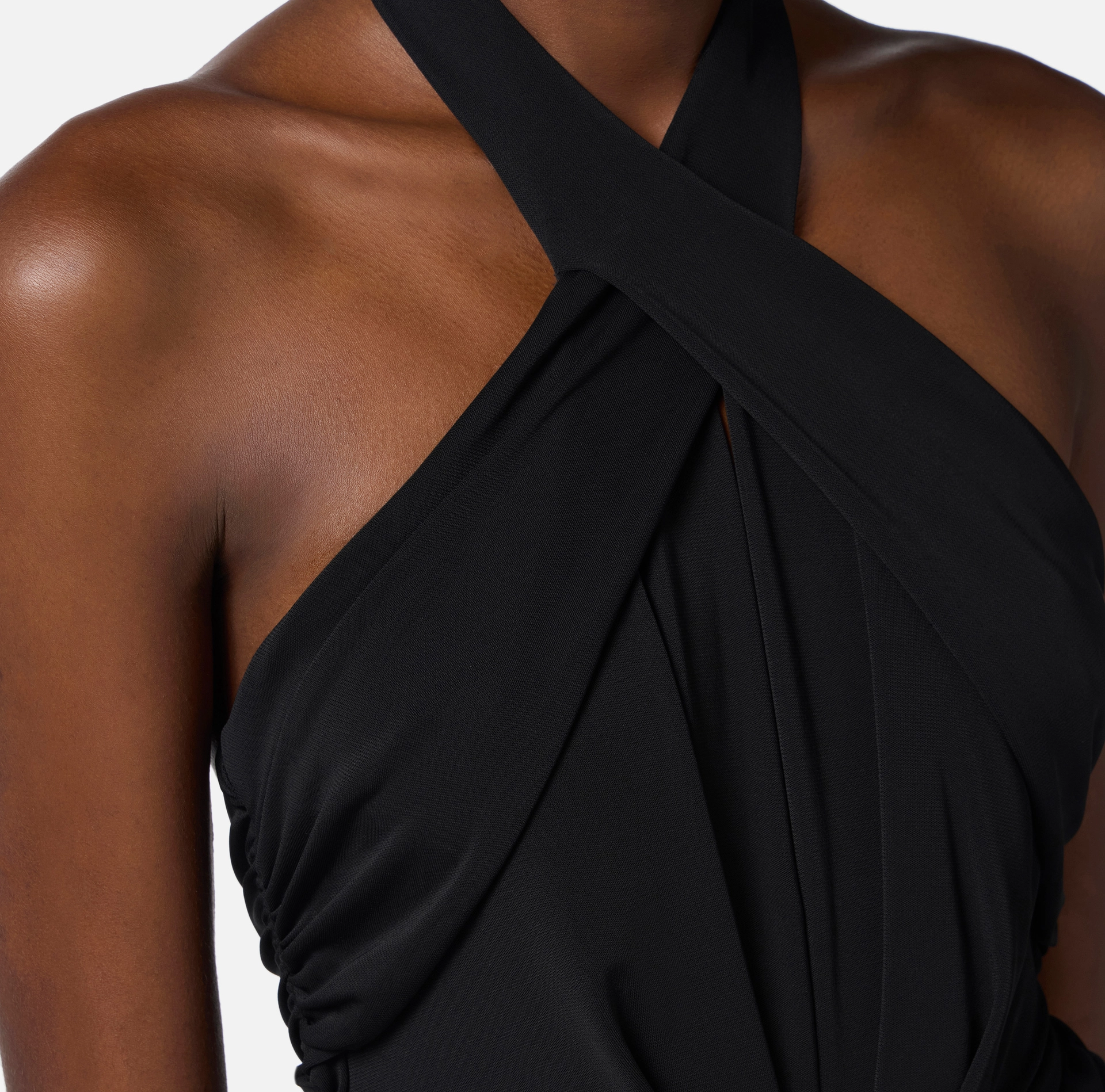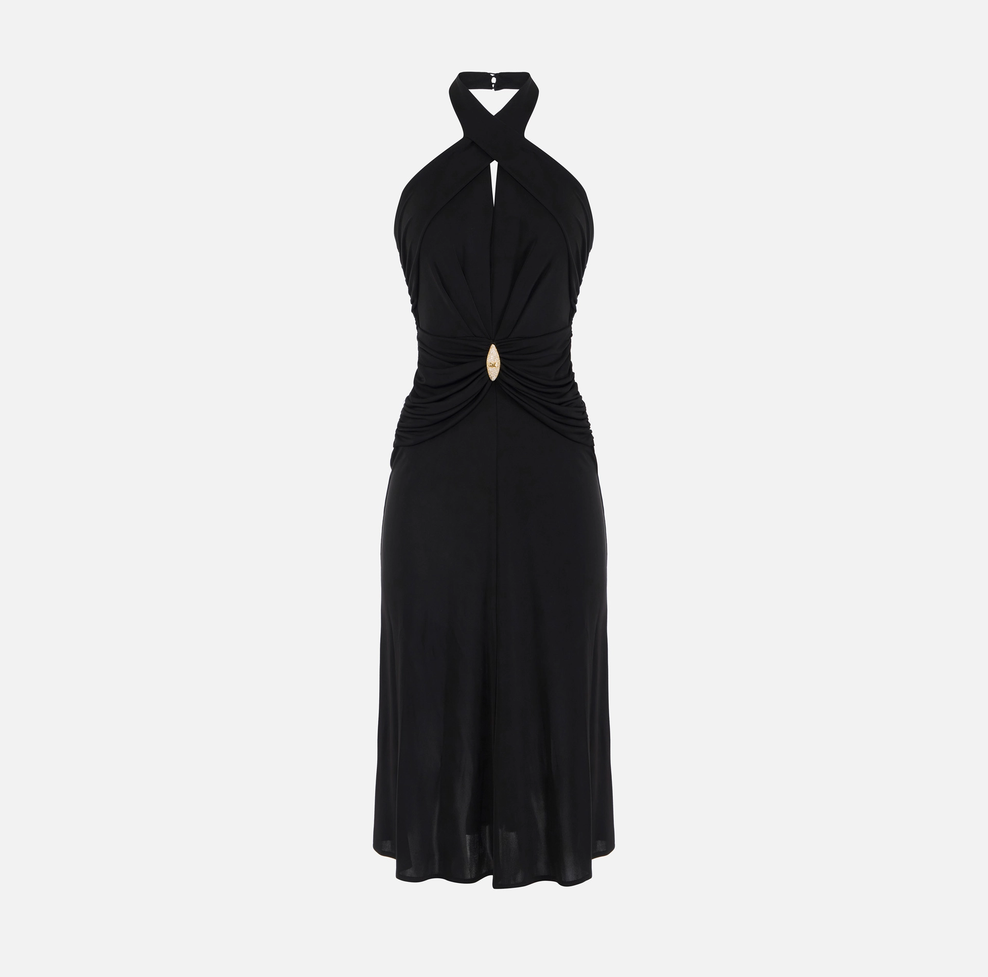 Sukienka z lekkiego dżerseju. Model posiada odsłonięte ramiona i charakteryzuje się krzyżującym się dekoltem, tworzącym głębokie i zmysłowe rozcięcie na piersiach. Nutę światła wnosi biżuteryjny dodatek w talii, ozdobionym kryształkami i logo. Krój dopasowany.