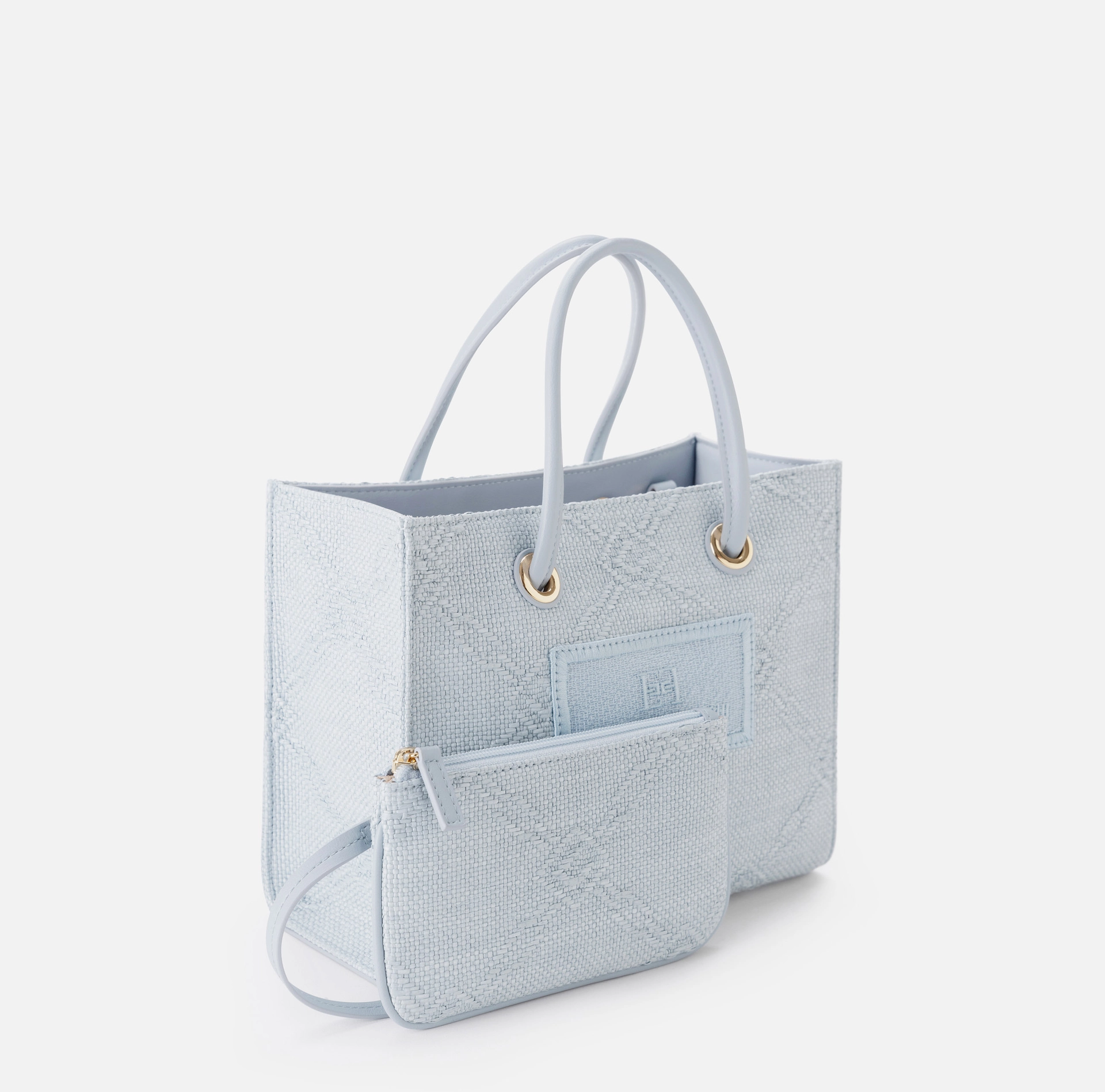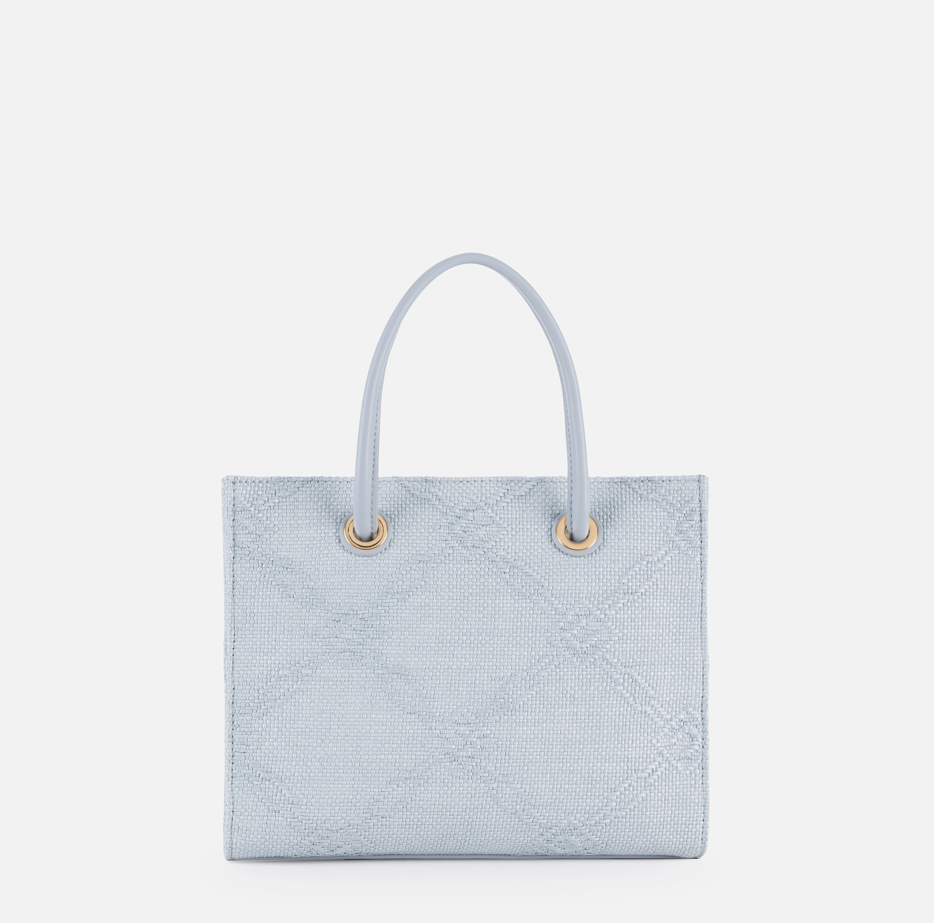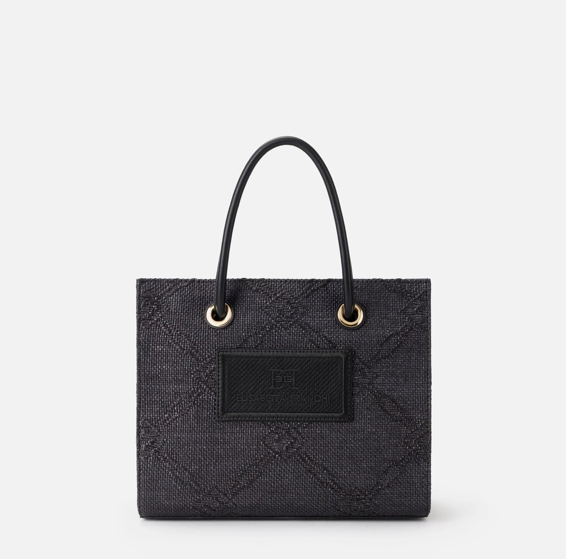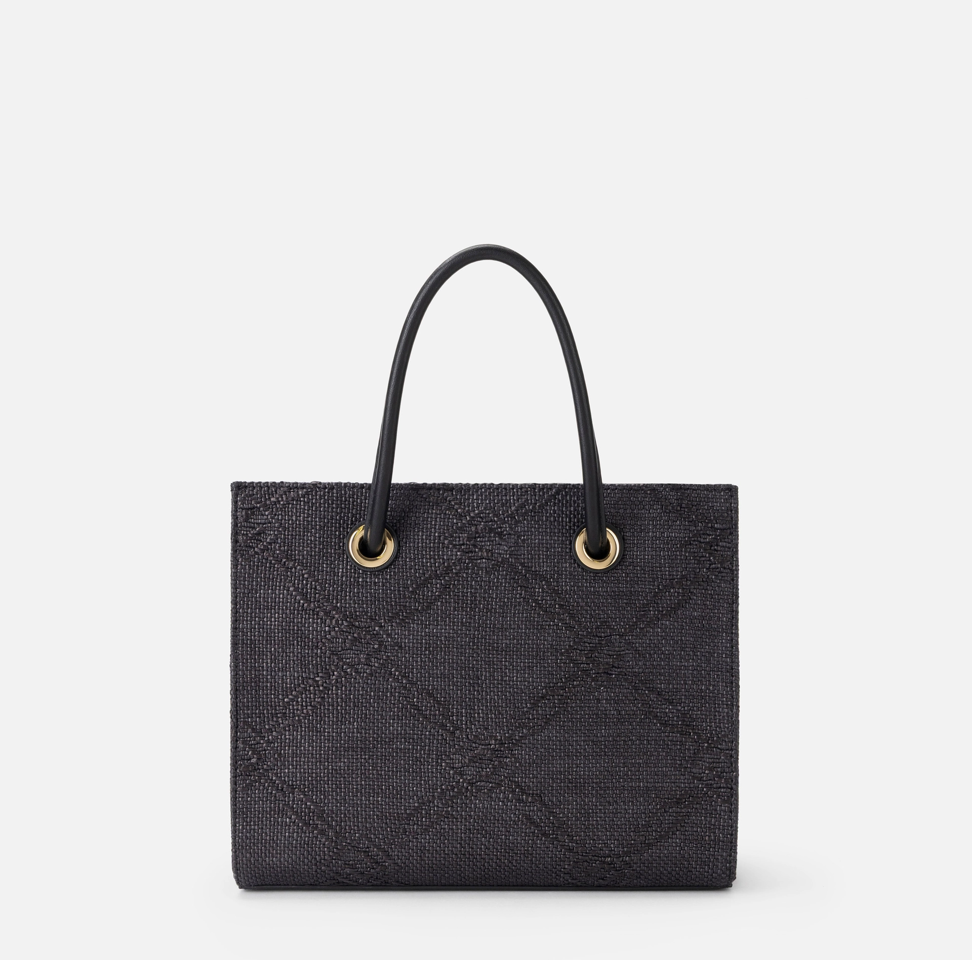 Mała torba tote wykonana z żakardowej rafii, z motywem rombów, ozdobiona detalami ze złoconego metalu, wnoszącymi nutę blasku. Naszywka z wyszywanym logo uzupełnia całość.