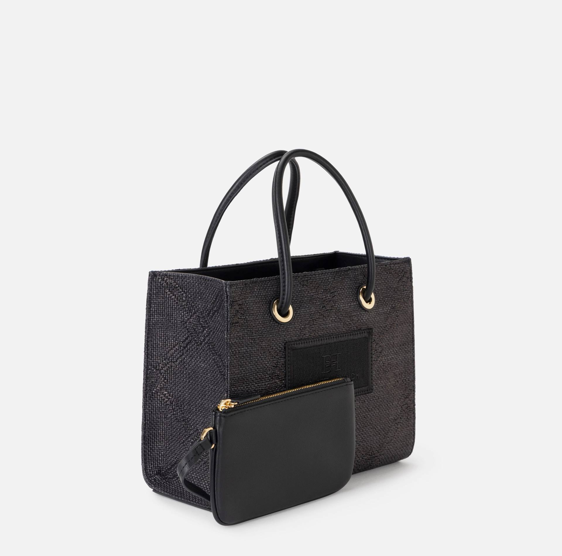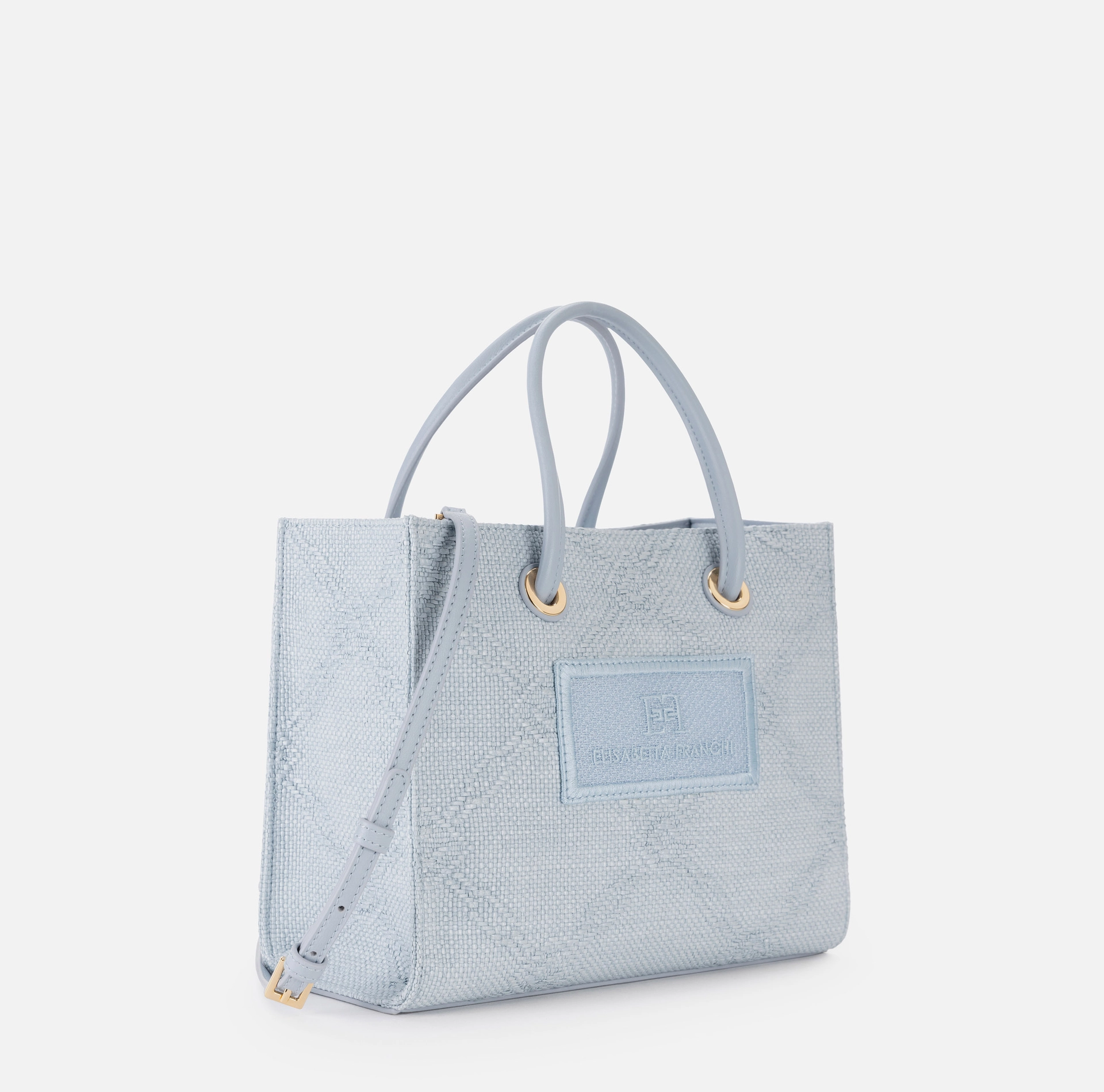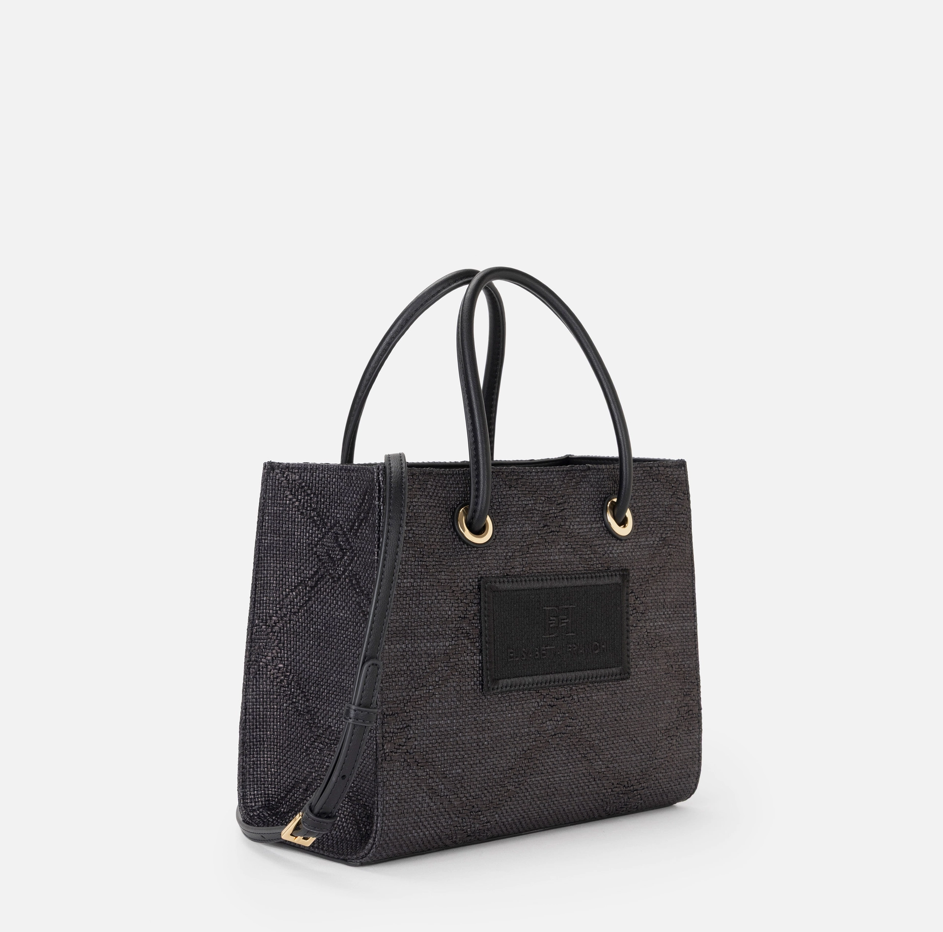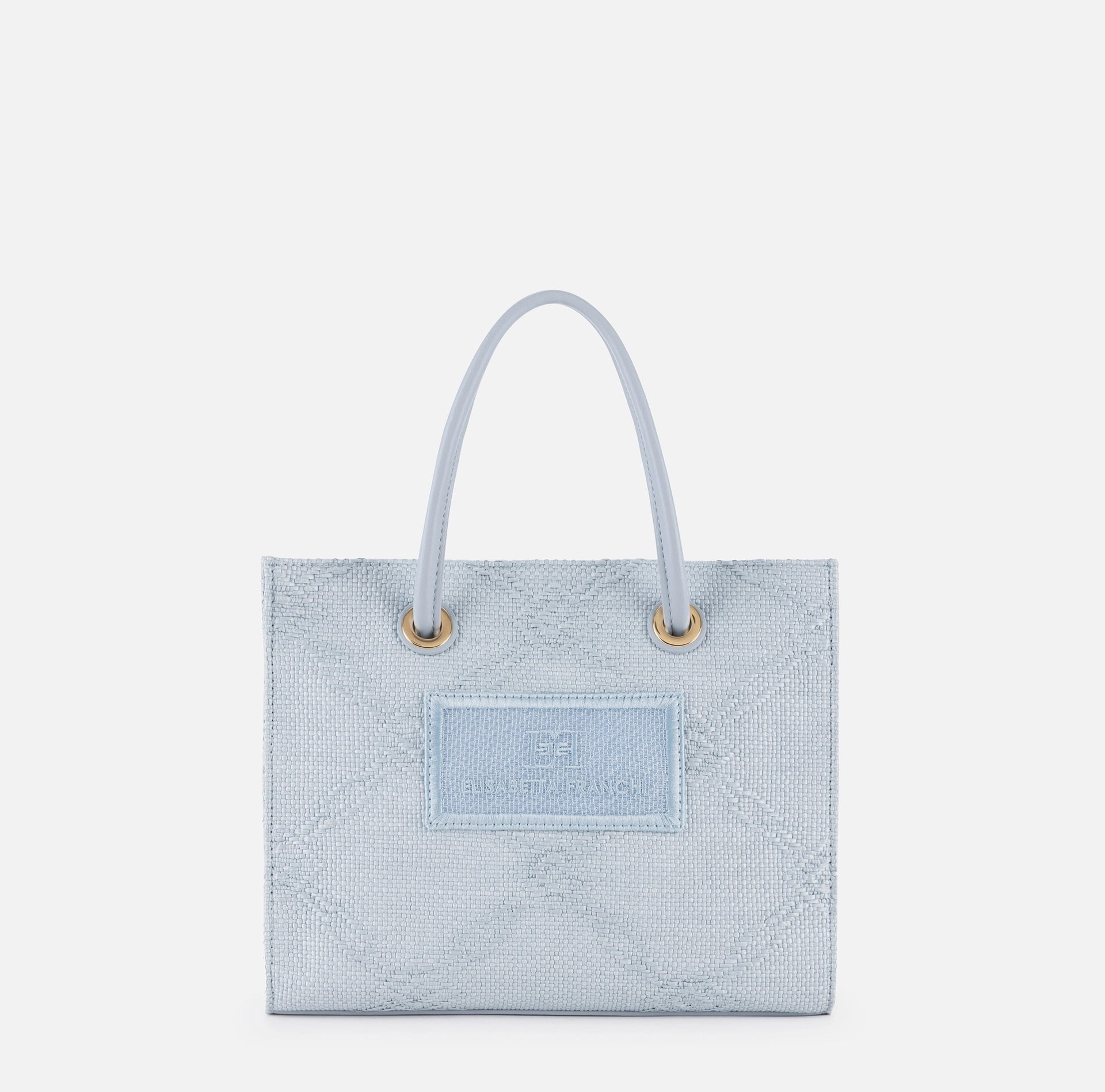Mała torba tote wykonana z żakardowej rafii, z motywem rombów, ozdobiona detalami ze złoconego metalu, wnoszącymi nutę blasku. Naszywka z wyszywanym logo uzupełnia całość.
