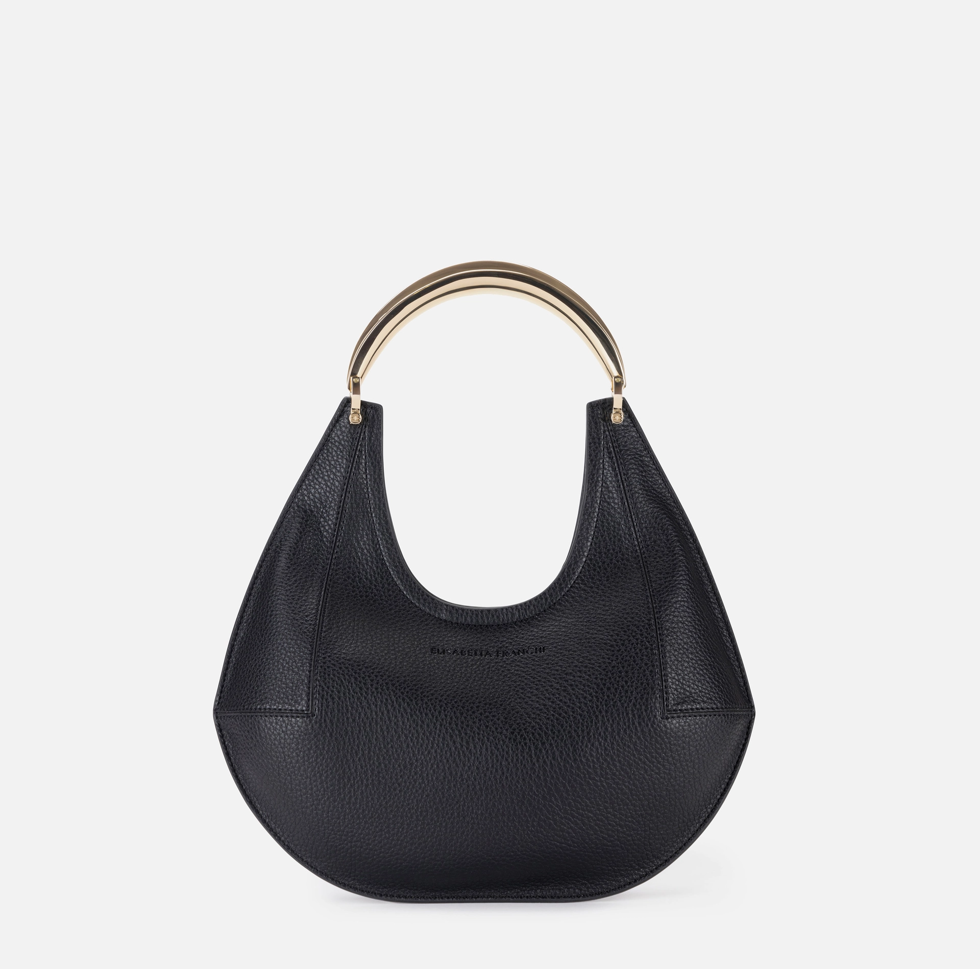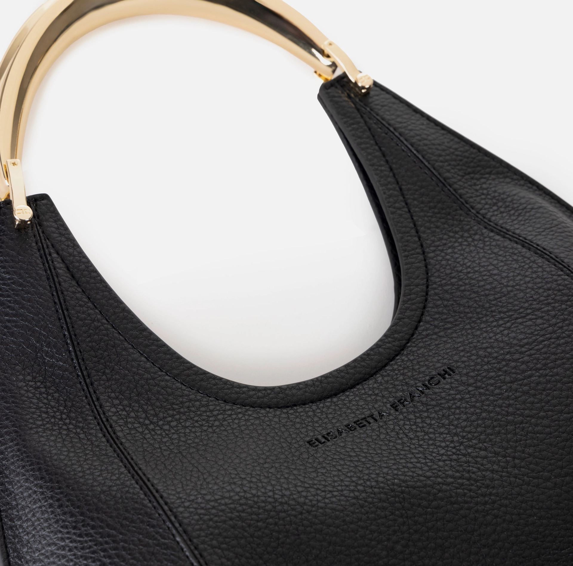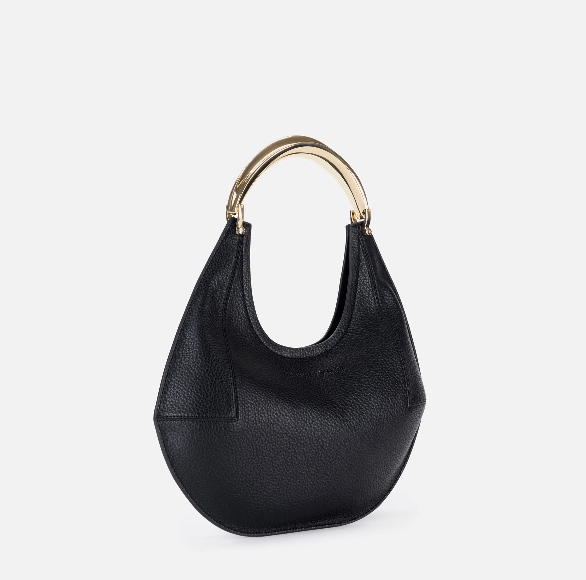 Mała torba typu hobo z syntetycznego materiału imitującego skórę. Wyróżnia się złotą metalową rączką w kształcie klejnotu z fakturą przypominającą liść, która dodaje odrobinę światła.