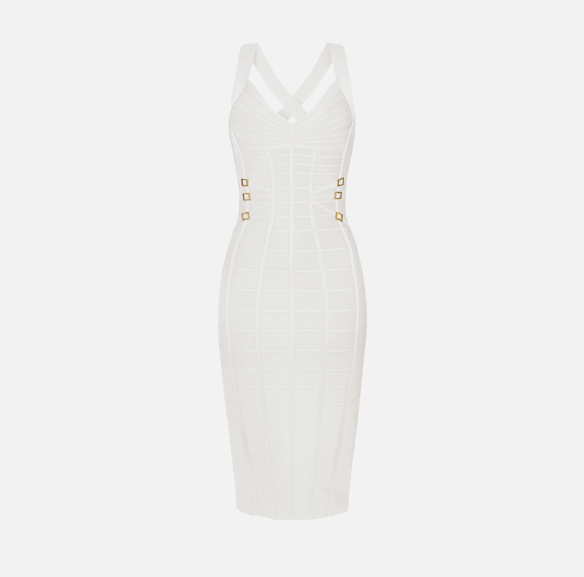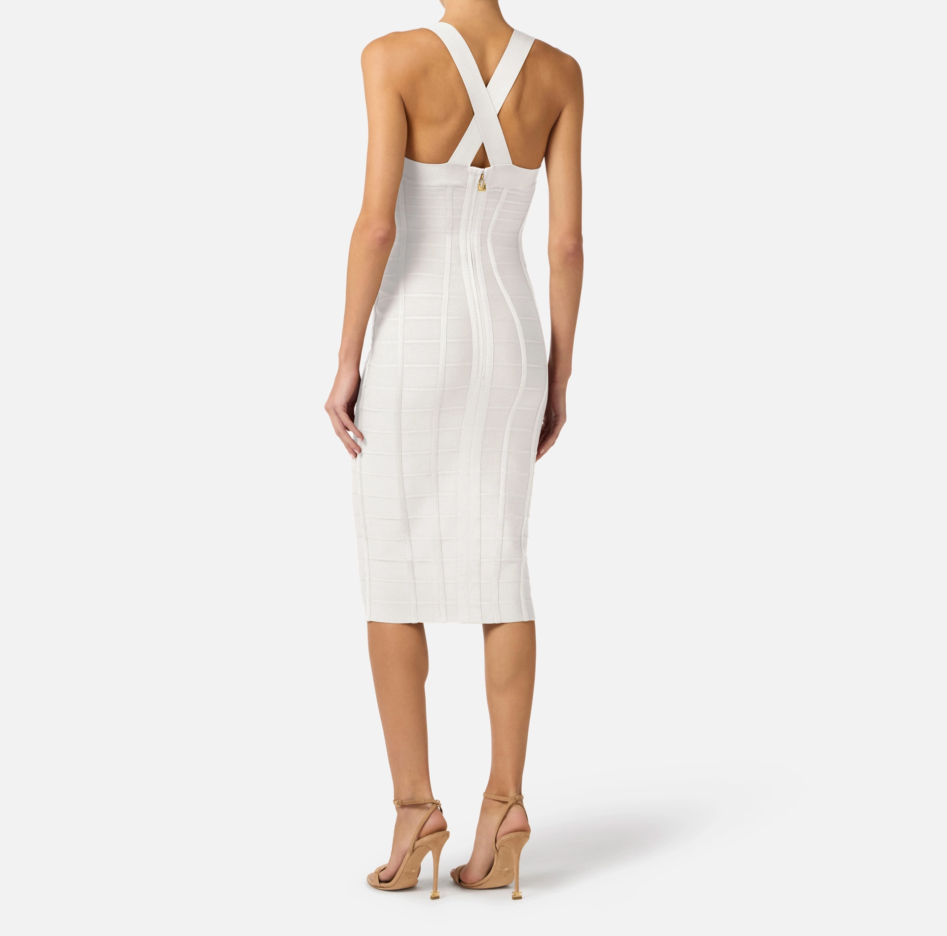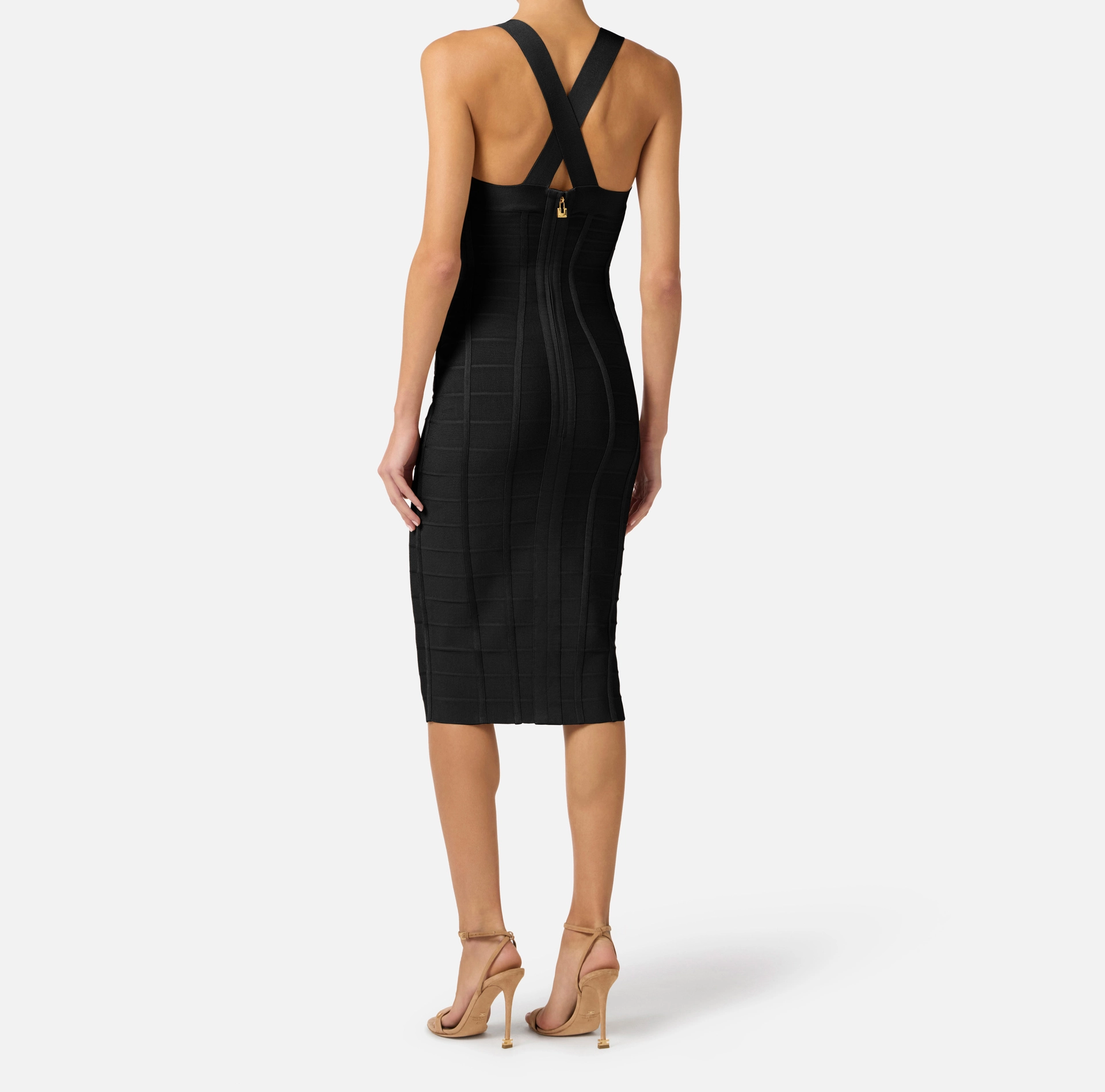 Ołówkowa sukienka z dzianiny. Wyróżnia się misternym splotem tworzącym efekt 3D – poziome prążki i tasiemki podkreślają biust i biodra geometrycznymi wzorami. Metalowe pierścienie w kolorze złotym oraz suwak zakończony biżuteryjną kłódką dodają modelowi blasku. Krój dopasowany.