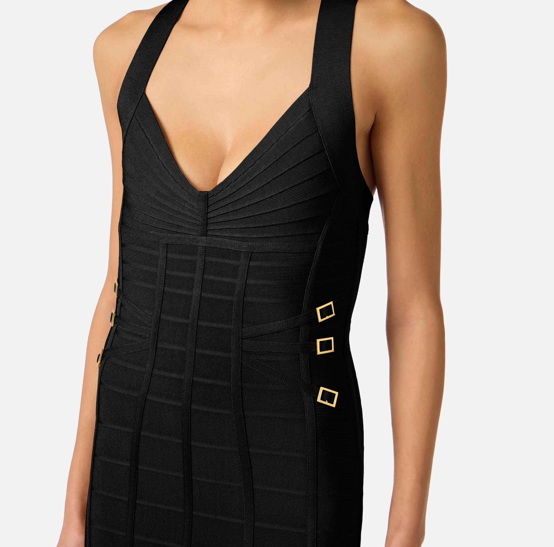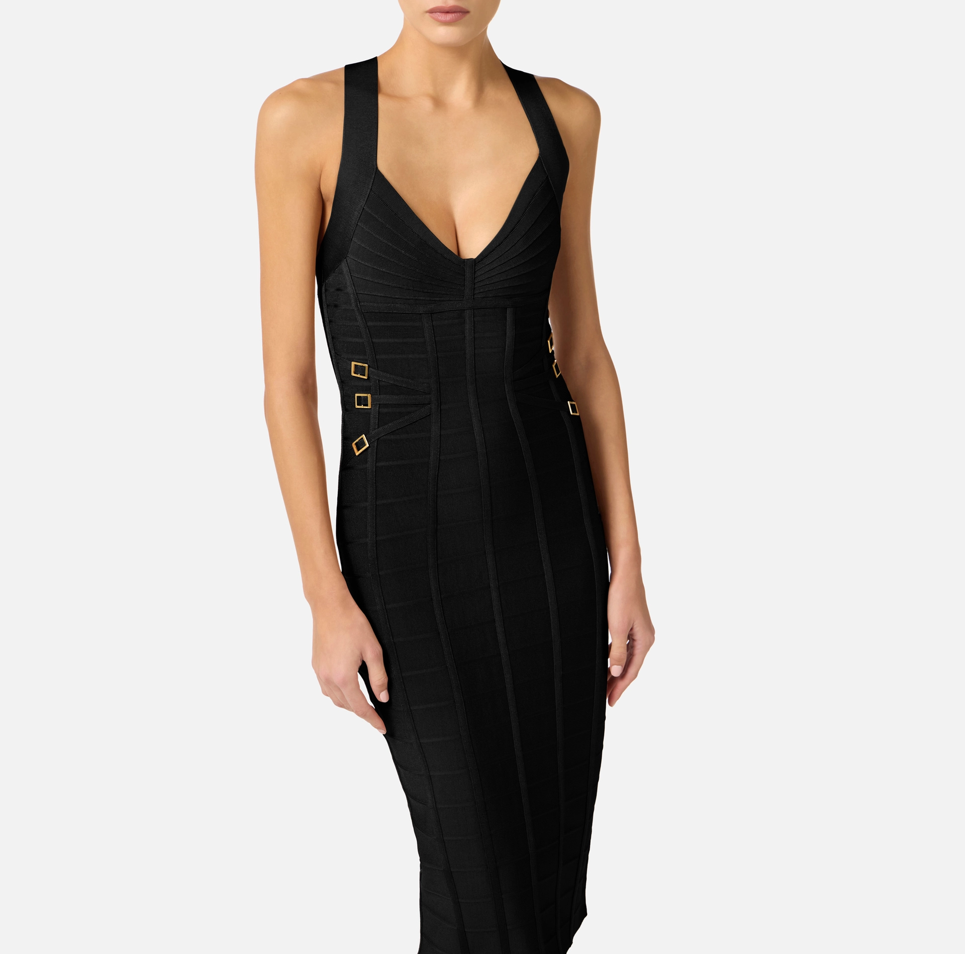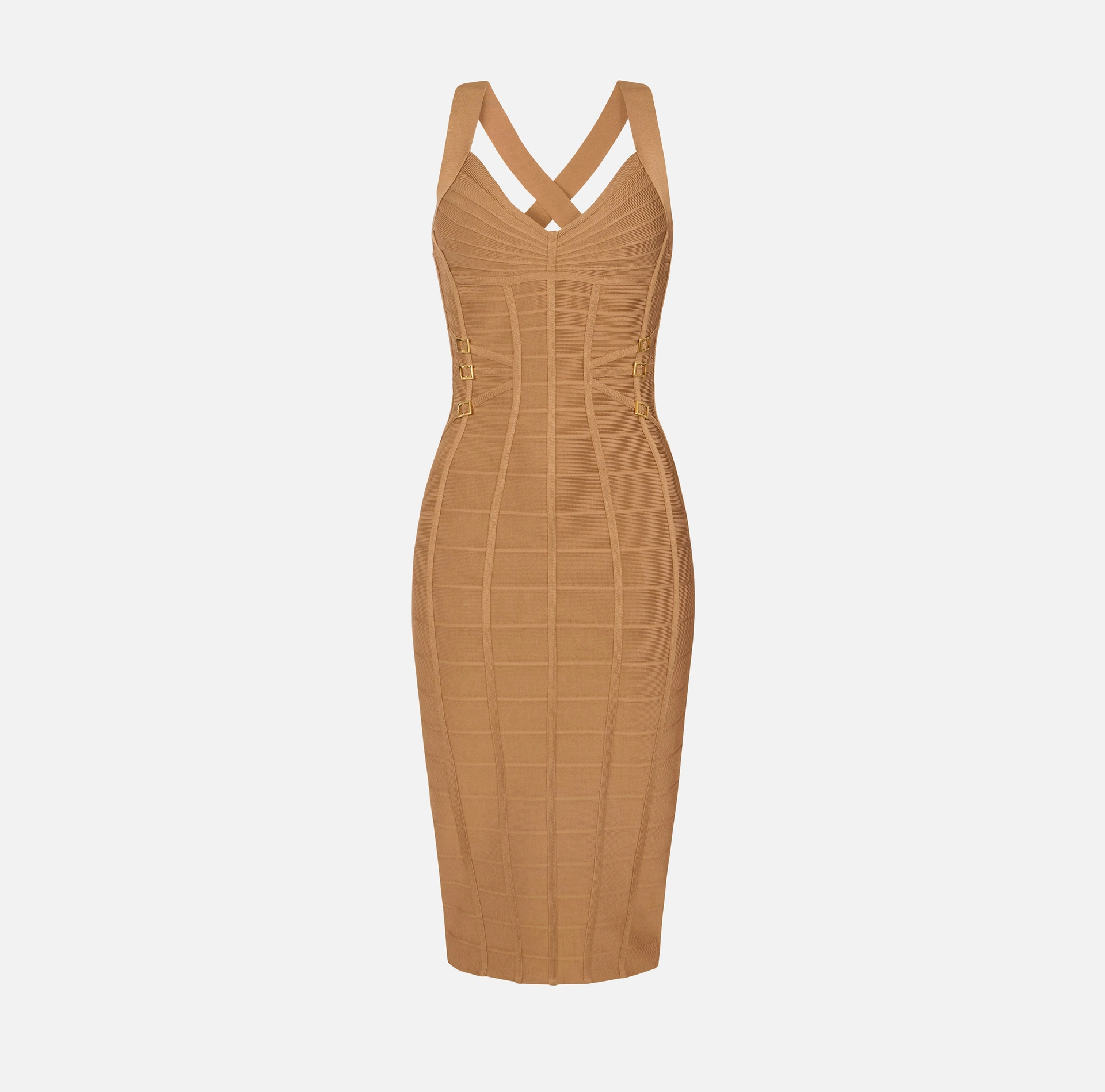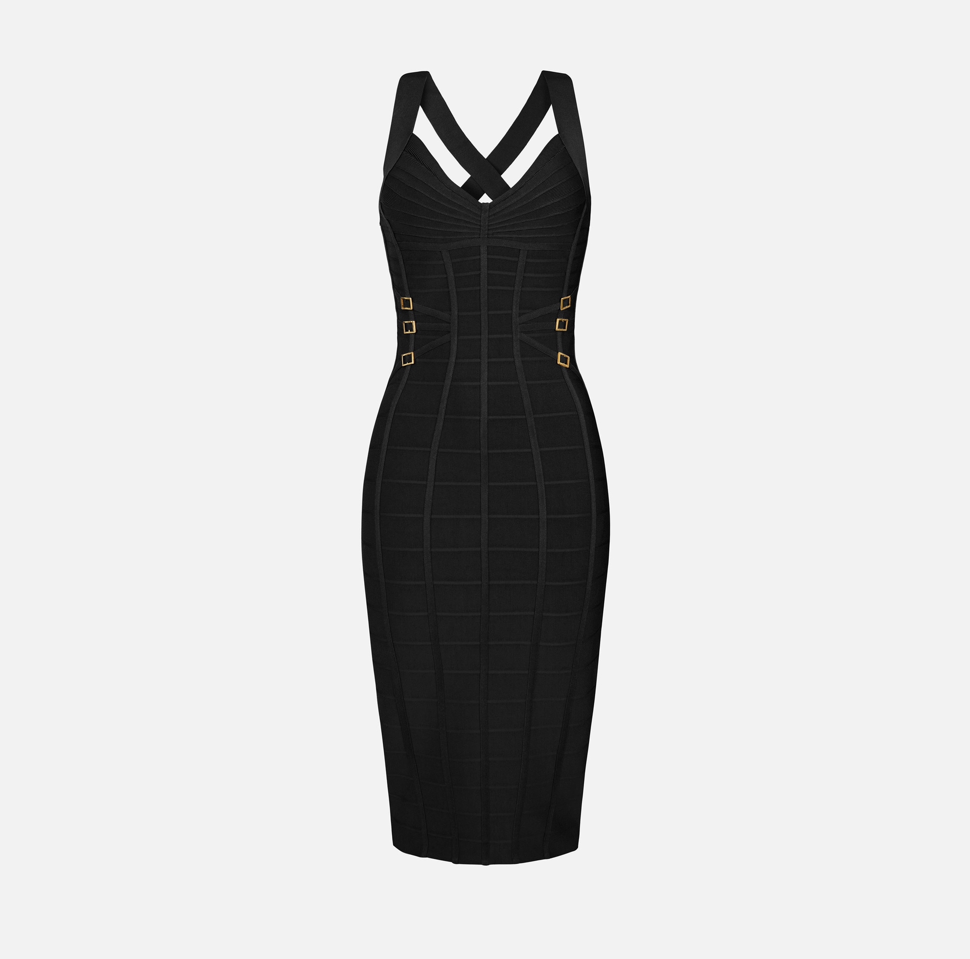 Ołówkowa sukienka z dzianiny. Wyróżnia się misternym splotem tworzącym efekt 3D – poziome prążki i tasiemki podkreślają biust i biodra geometrycznymi wzorami. Metalowe pierścienie w kolorze złotym oraz suwak zakończony biżuteryjną kłódką dodają modelowi blasku. Krój dopasowany.
