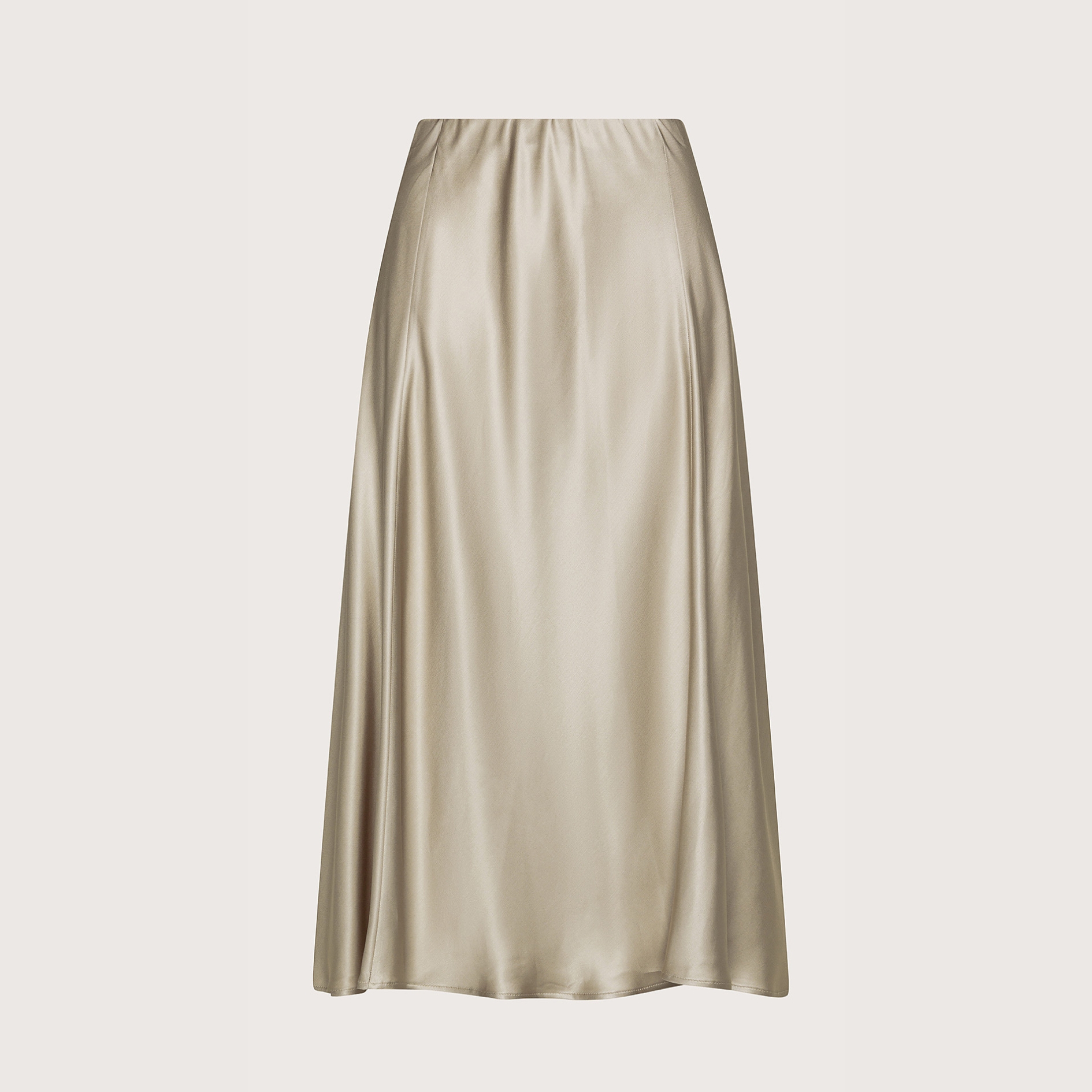 Ta satynowa spódnica midi marki Seventy to kwintesencja prostoty i wyrafinowania. Wykonana z lekkiej, miękko układającej się tkaniny o delikatnym połysku, dodaje stylizacjom klasy i subtelnego blasku. Jej gładka faktura i neutralny beżowy odcień sprawiają, że doskonale komponuje się zarówno z eleganckimi, jak i casualowymi elementami garderoby.