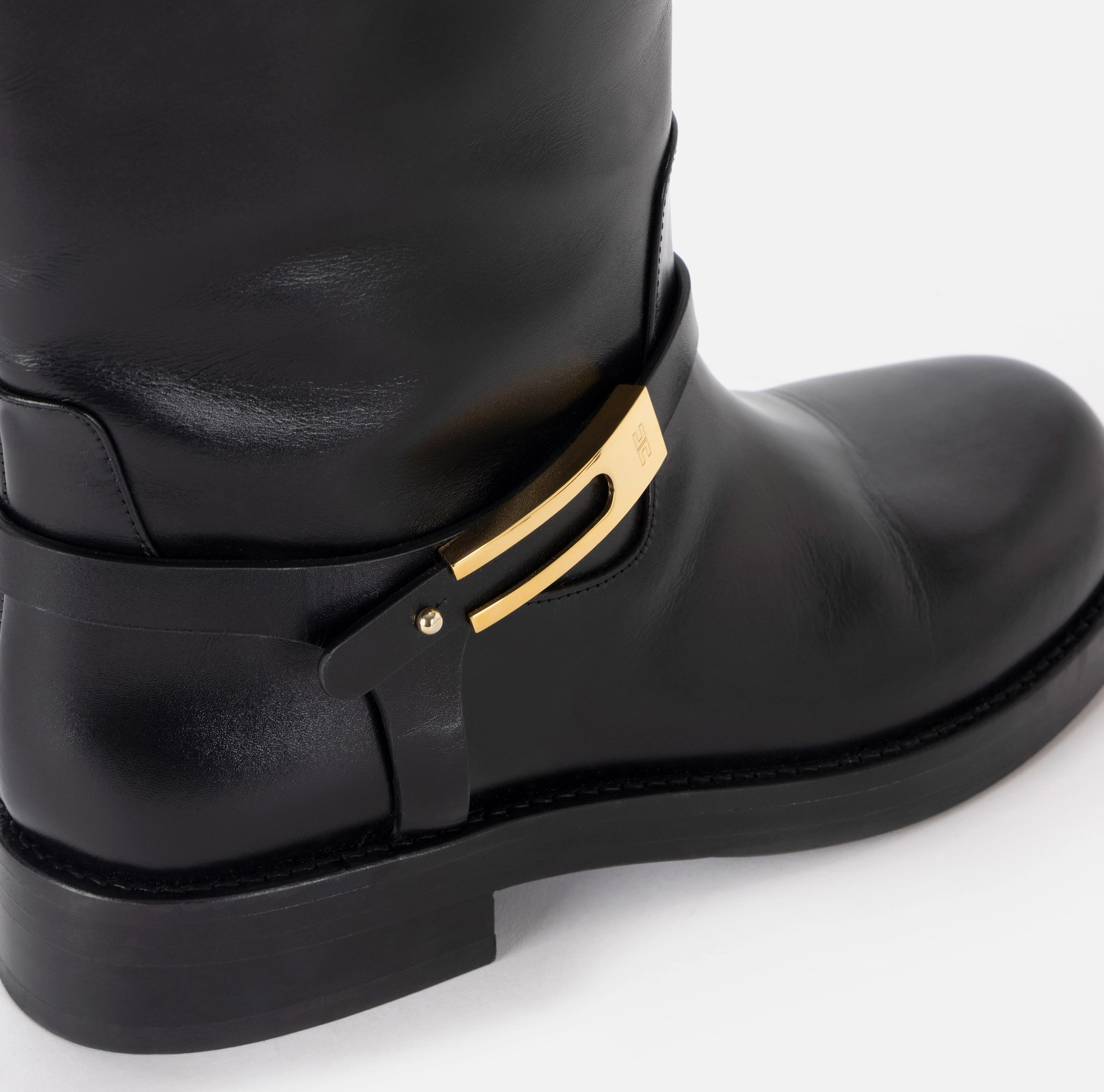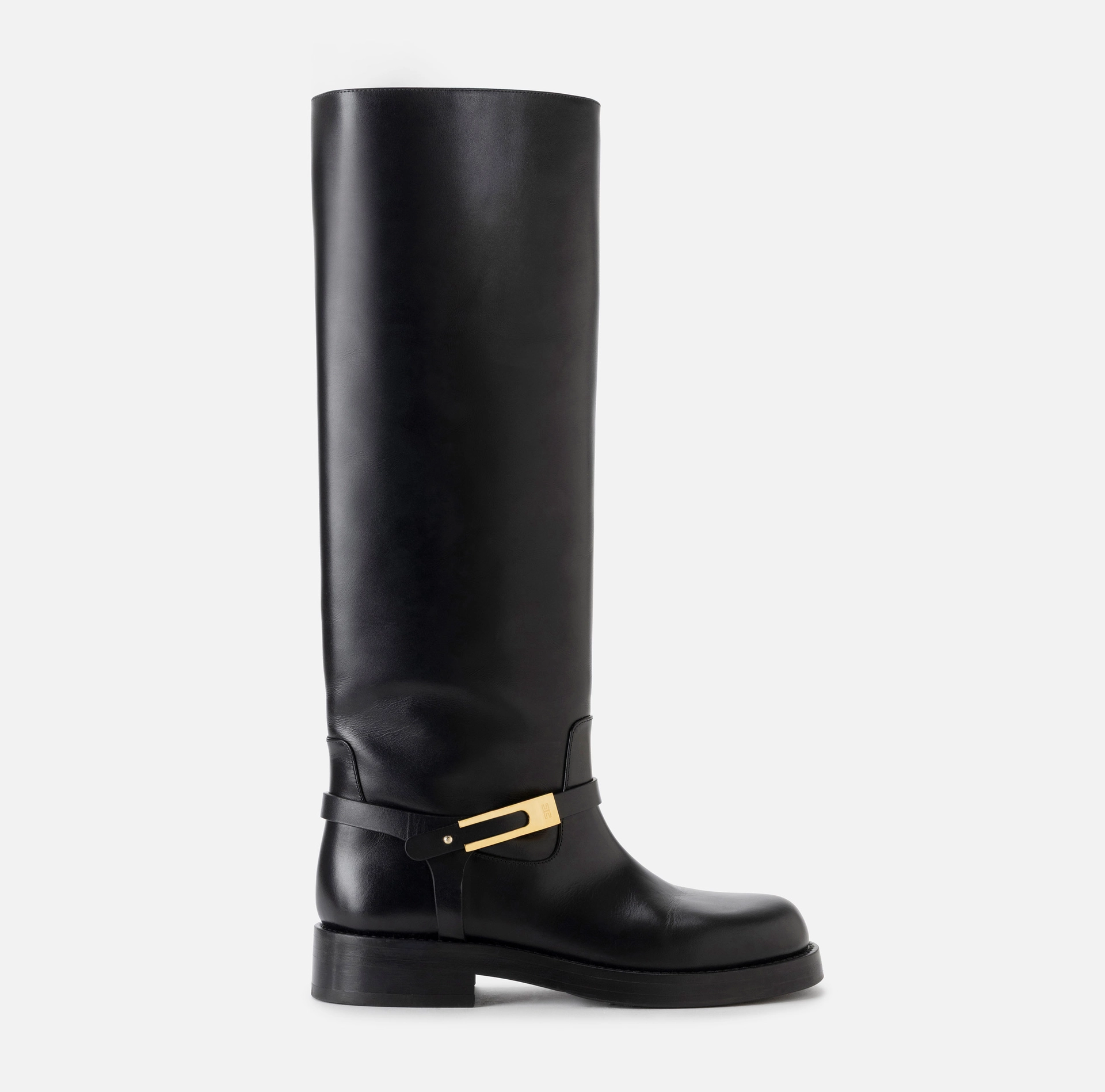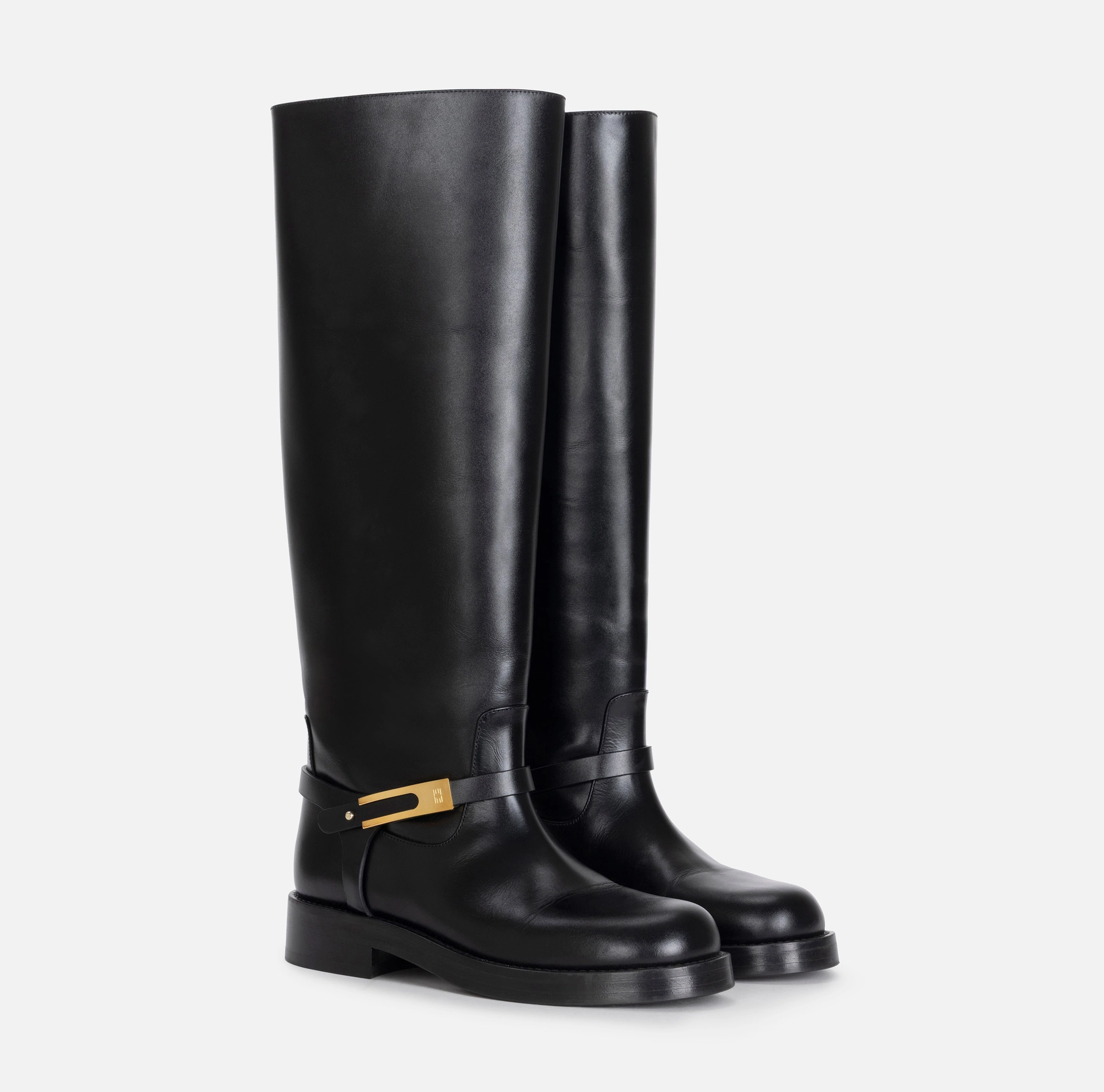 Skórzane kozaki z cholewką w kształcie walca. Są ozdobione paseczkami z metalową klamrą w kolorze złotym z logo, które otaczają kostkę. Podeszwa gumowa.