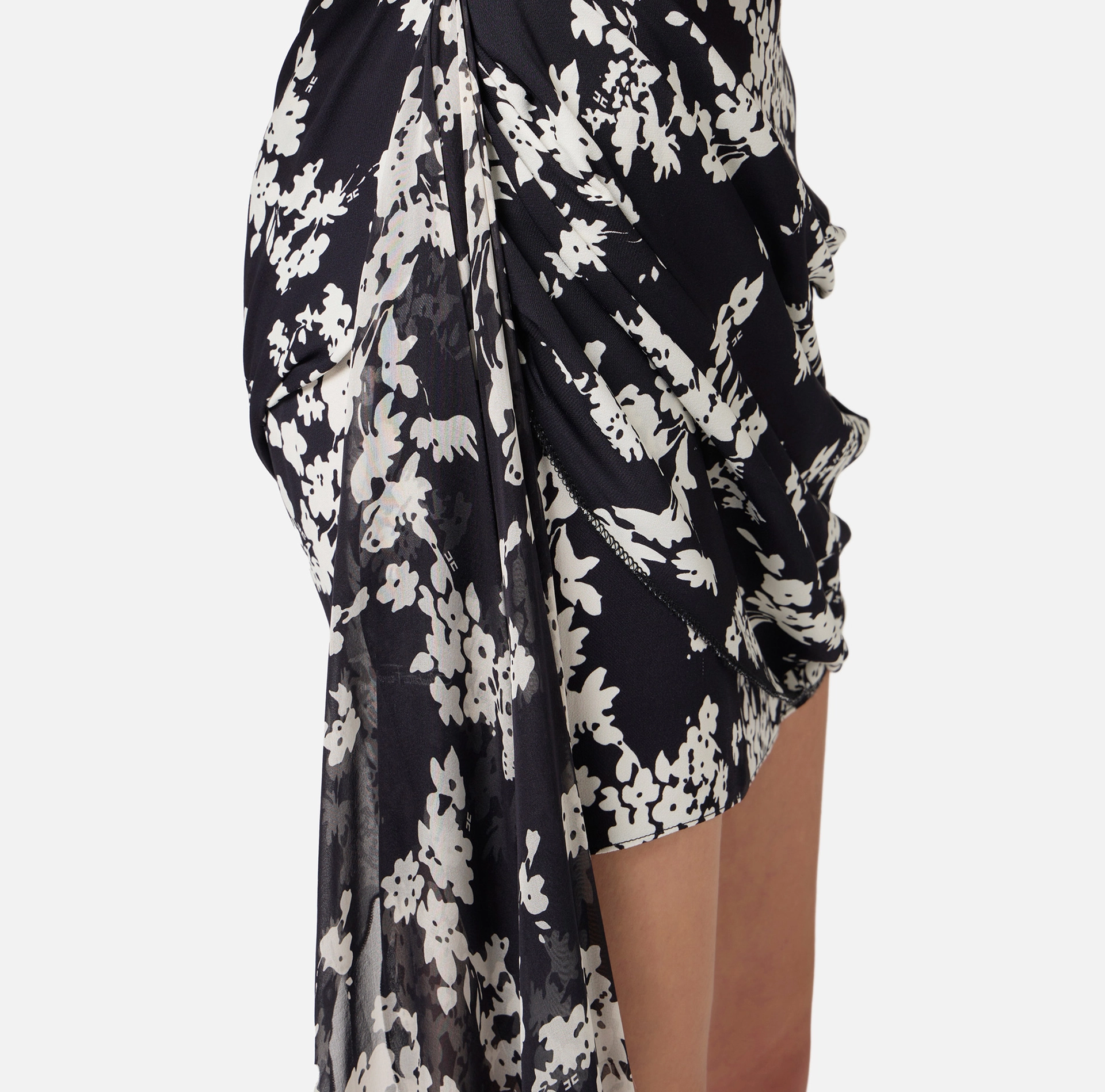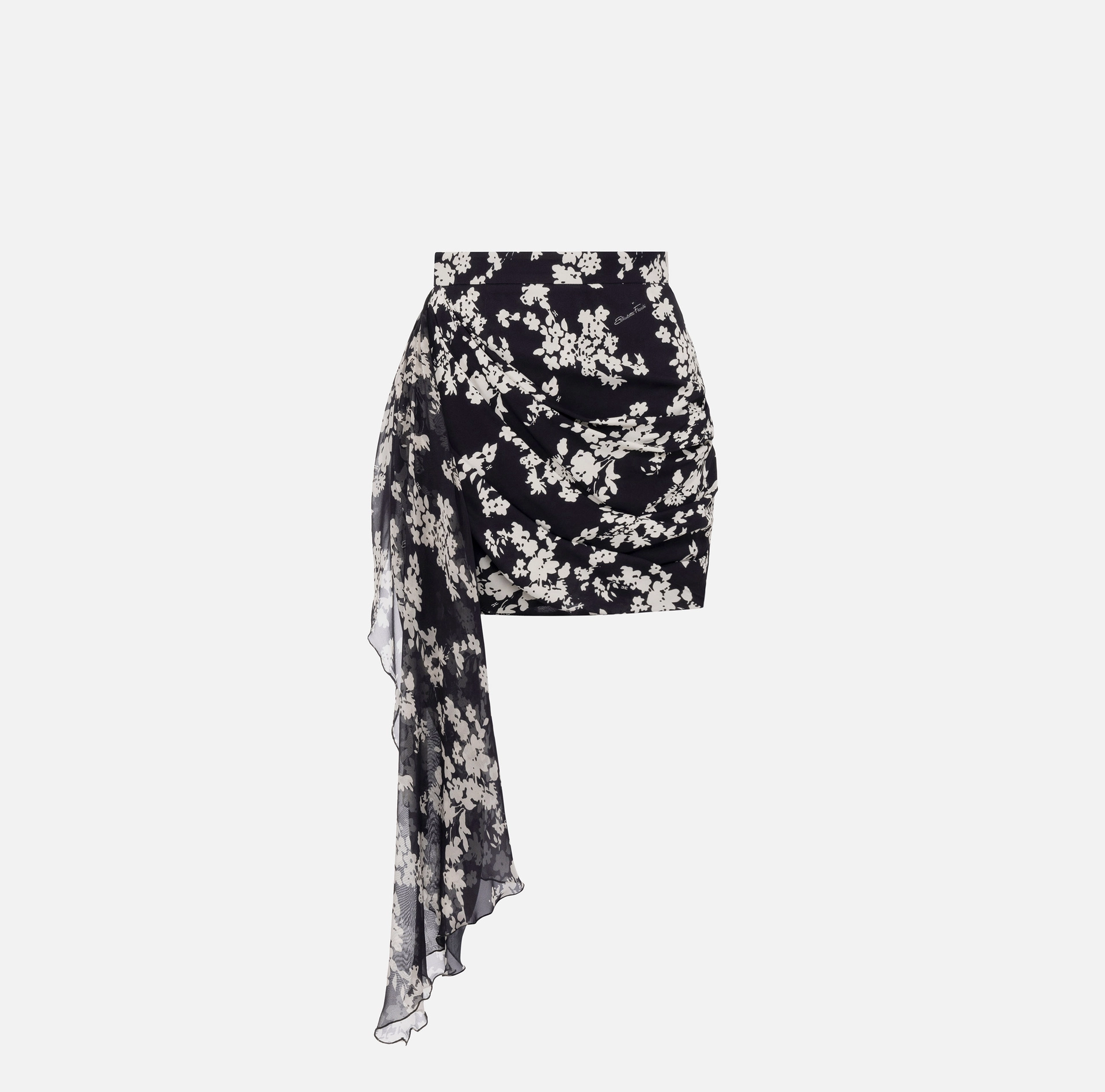 Spódnica z wiskozy żorżety z kwiatowym nadrukiem. Jest delikatnie drapowana i charakteryzuje się asymetrycznym paskiem z woalu, który zapewnia dodatkową lekkość. Dopasowany krój.