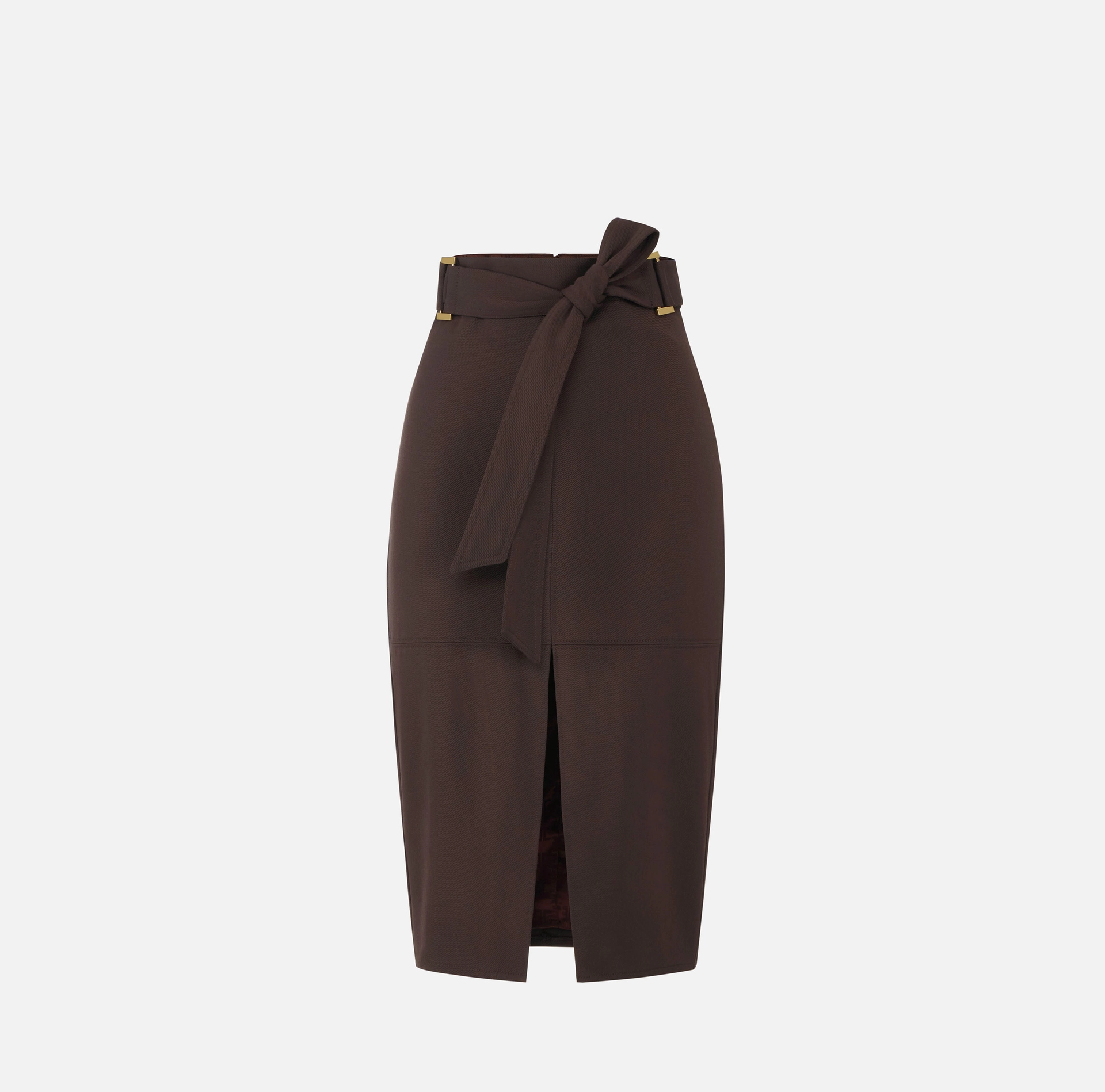 Spódnica mini z gabardyny. Posiada wszytą z tyłu szarfę do wiązania w talii i jest ozdobiona szlufkami ze złoconego metalu. Wycięcia i przeszycia zwiększają wyrazistość i otwierają się na wycięcie z przodu, tworzące śmiały fason. Krój dopasowany.