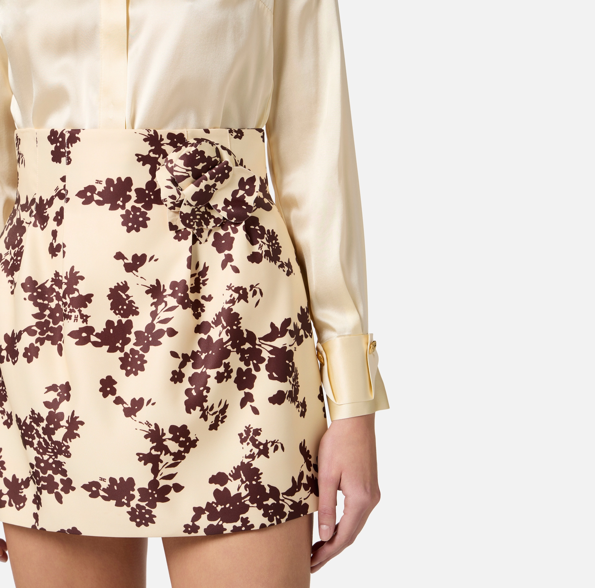 Spódnica z nadrukiem z satyny duchess z kwiatowym nadrukiem. Posiada zaszewki w talii, które tworzą amforę na dole. Ostatnim stylowym detalem jest pasujący kwiat na biodrze. Dopasowany krój.