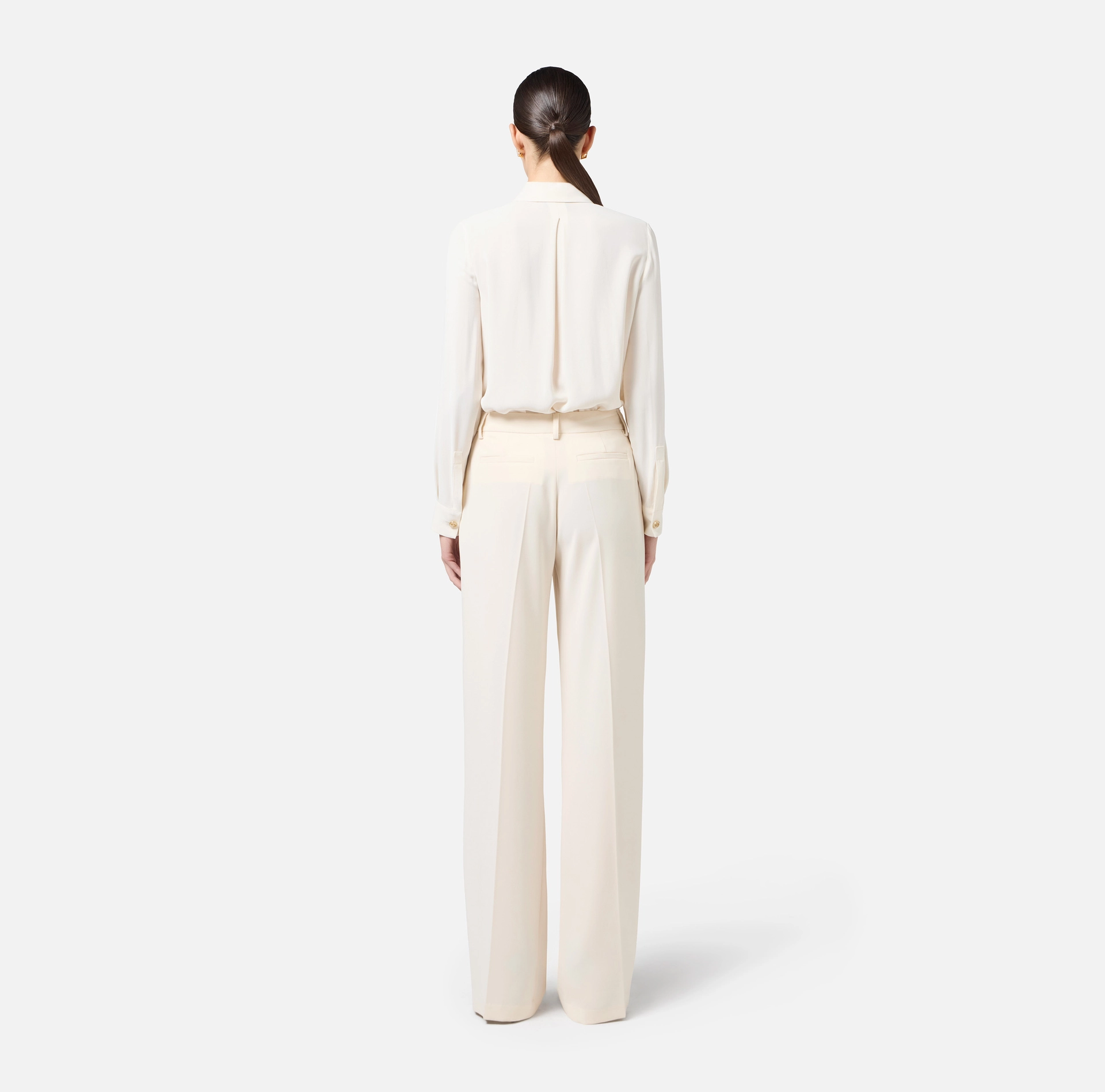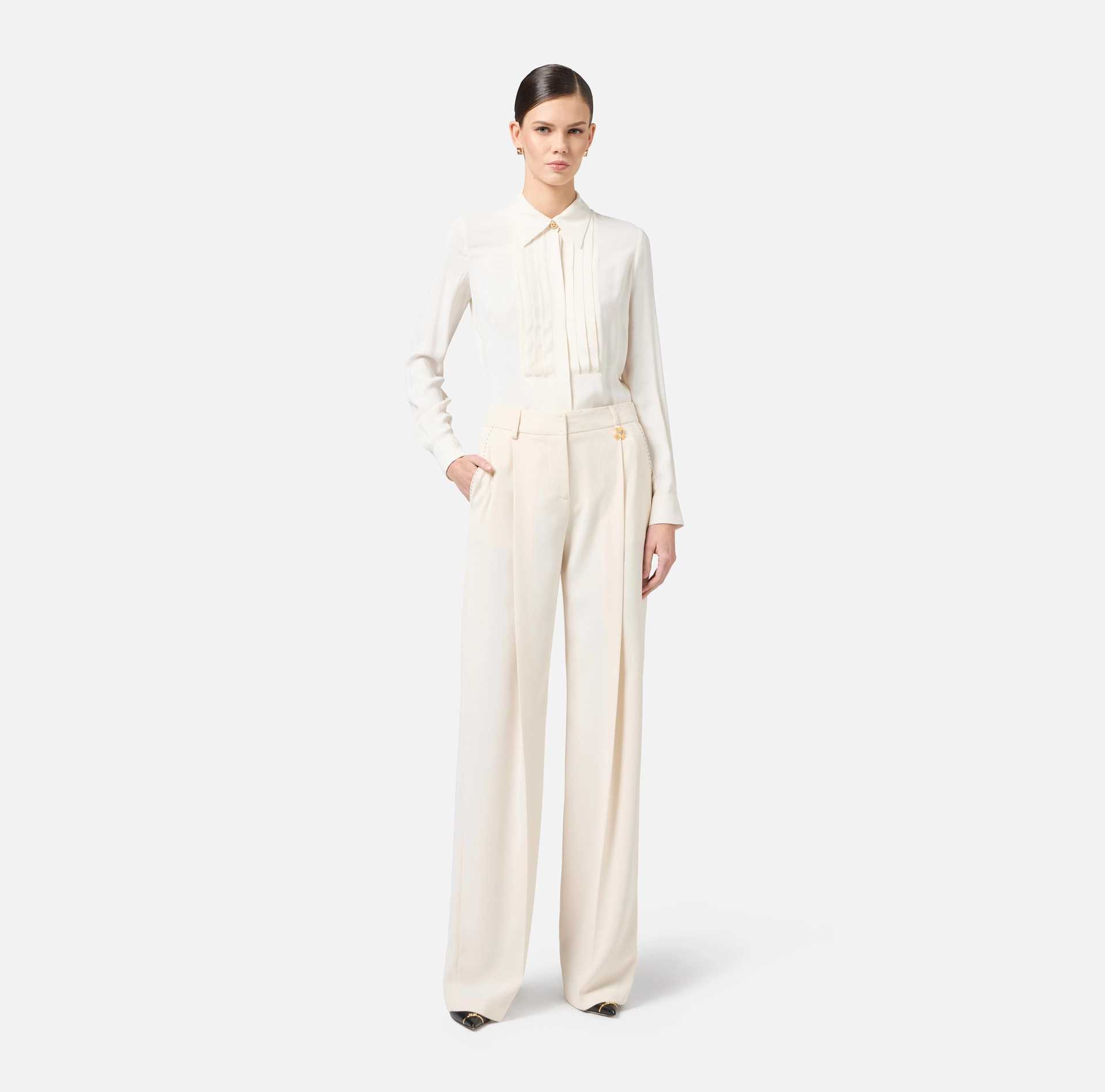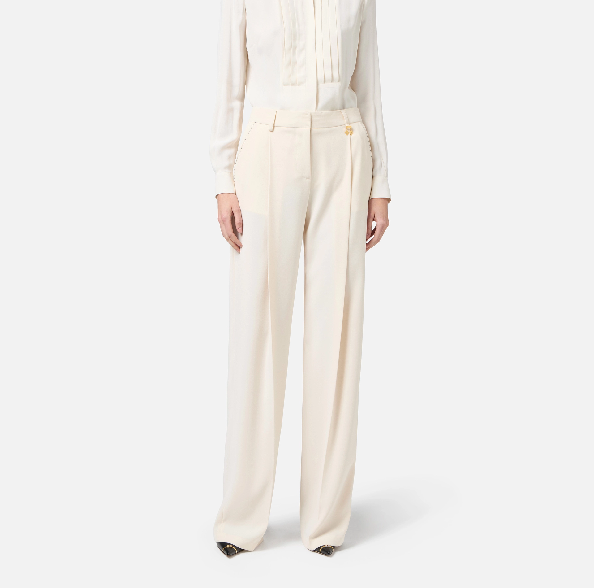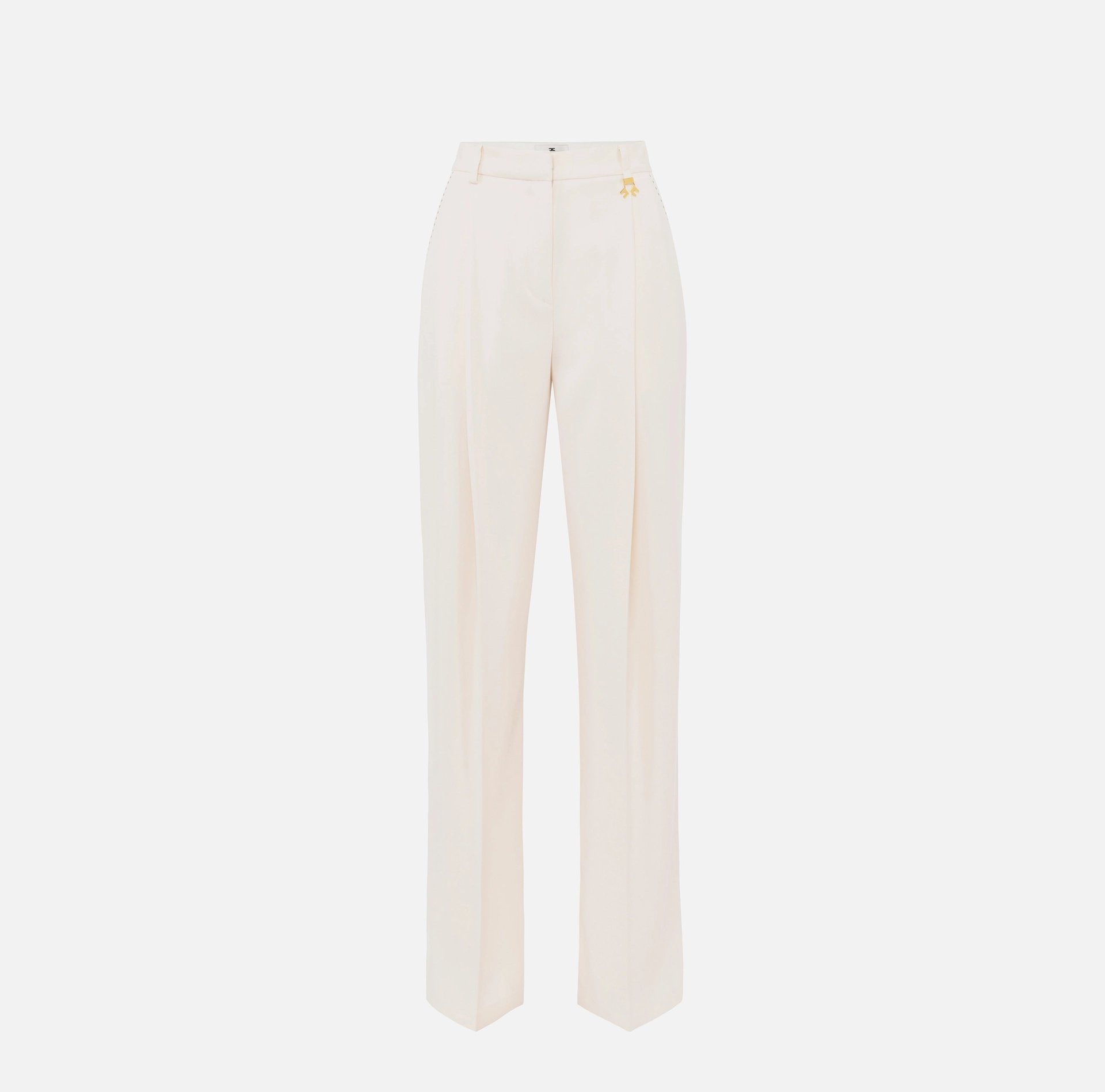 Spodnie z lekkiej tkaniny krepy o regularnym kroju. Przednie kieszenie skośne i tylne kieszenie wpuszczane. Zaszewki i kontrastowe przeszycia dodają wyrazistości. Lekki akcent zapewnia zawieszka ze złotym metalowym logo na szlufce.