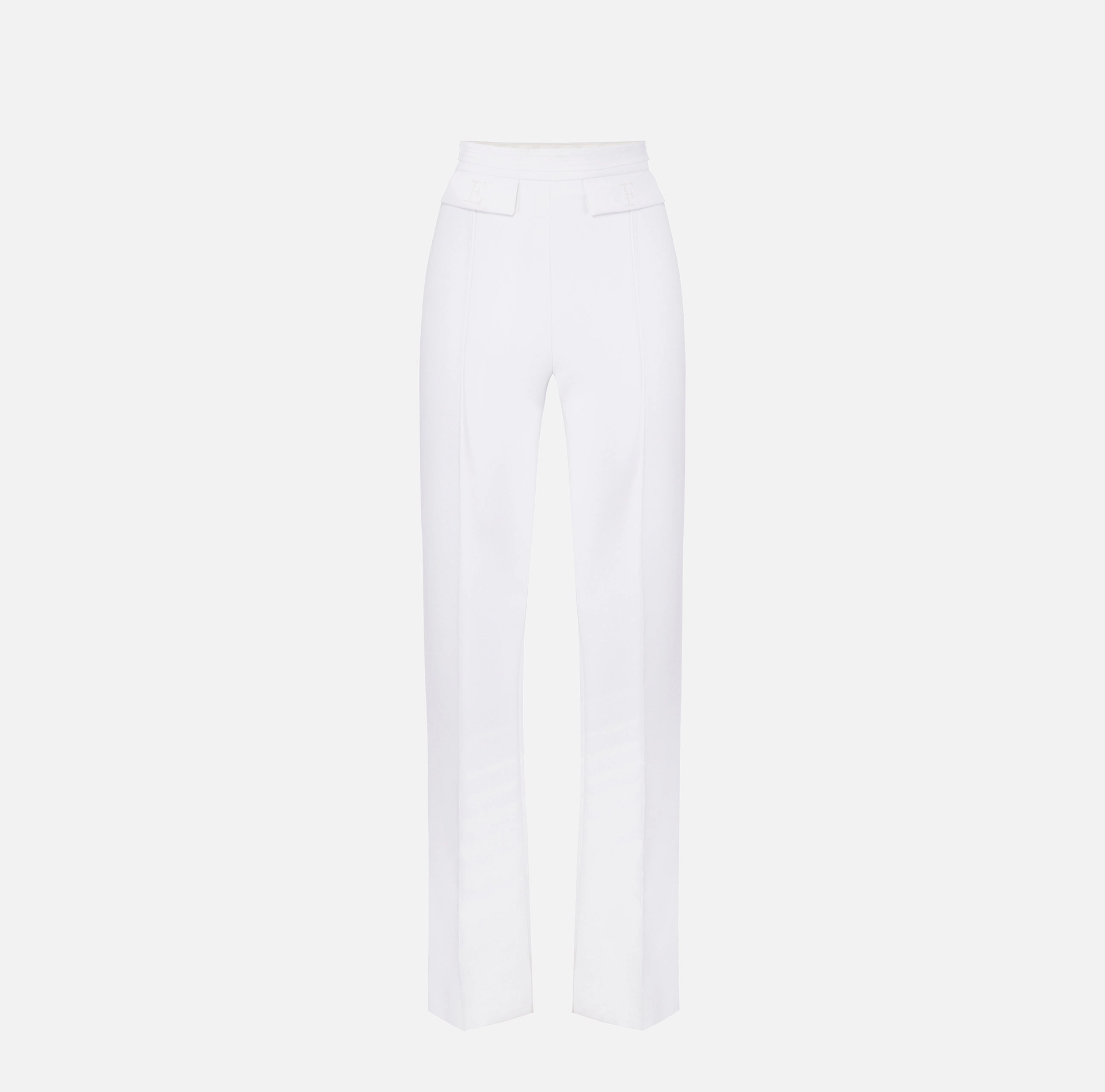Spodnie z podwójnej elastycznej krepy. Posiadają widoczne na zewnątrz szwy, podkreślone nieobrębianym materiałem i przeszyciami. Z przodu patki ozdobione są wyszywanym logo w dopasowanym kolorze. Prosty krój. Należą do kolekcji Essential, składającej się na garderobę doskonałą.
