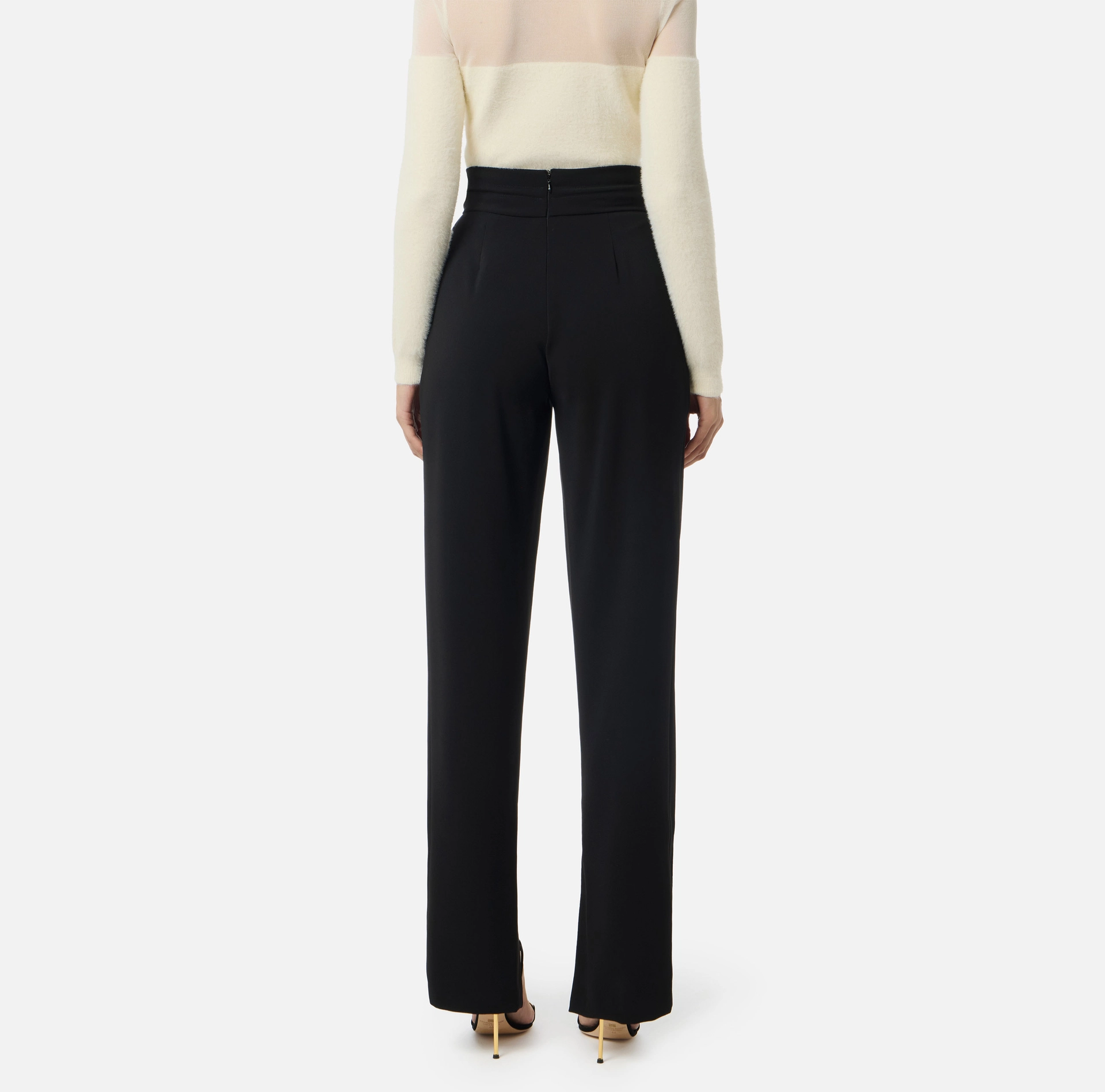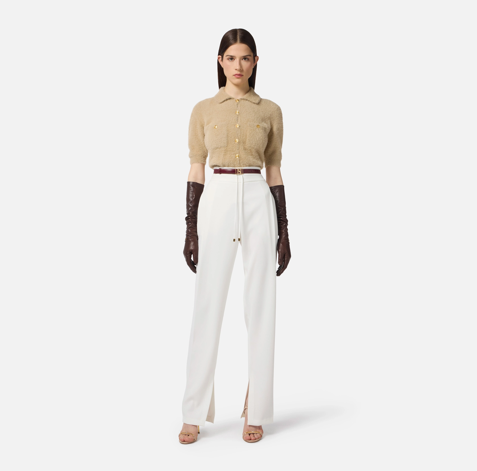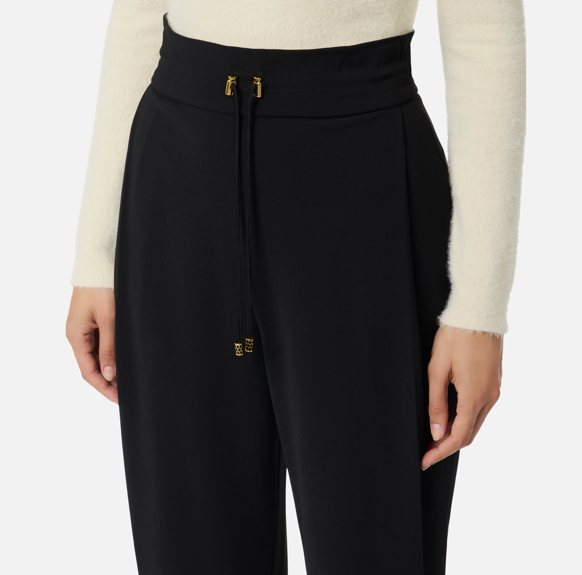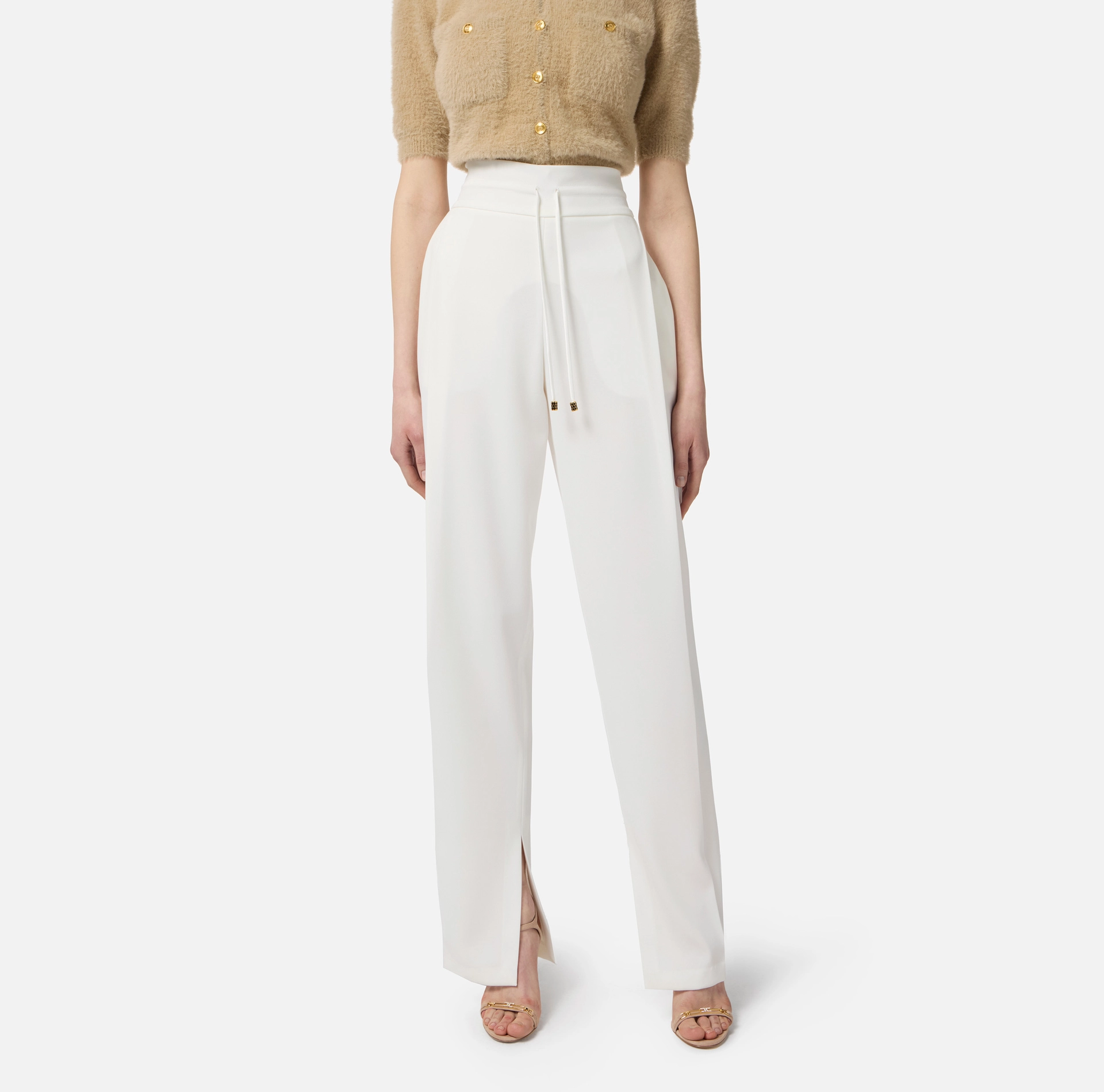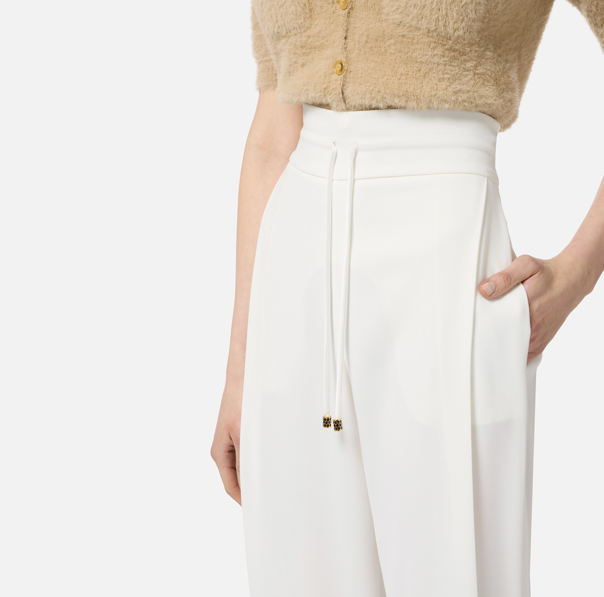 Spodnie z lekkiej krepy o luźnym kroju. Charakteryzują się ozdobnym sznurkiem w talii, ozdobionym emaliowanymi kryształkami z logo i motywem węża. Wewnętrzne rozcięcia u dołu nogawek wyszczuplają sylwetkę.