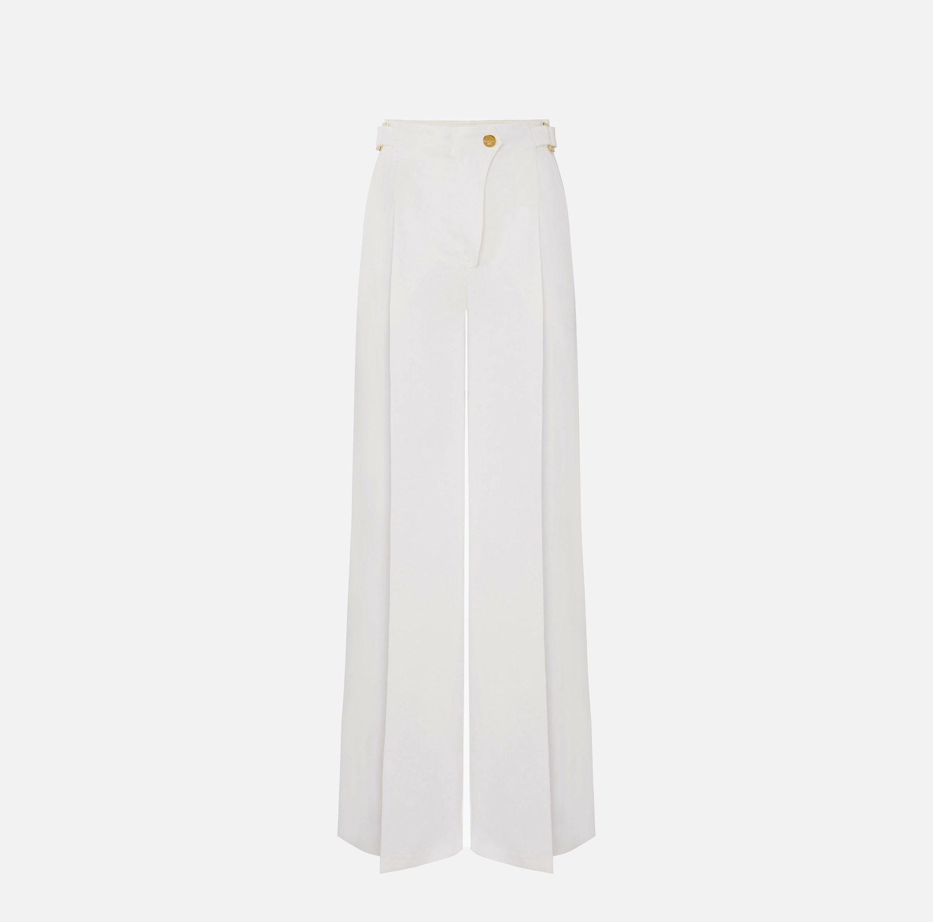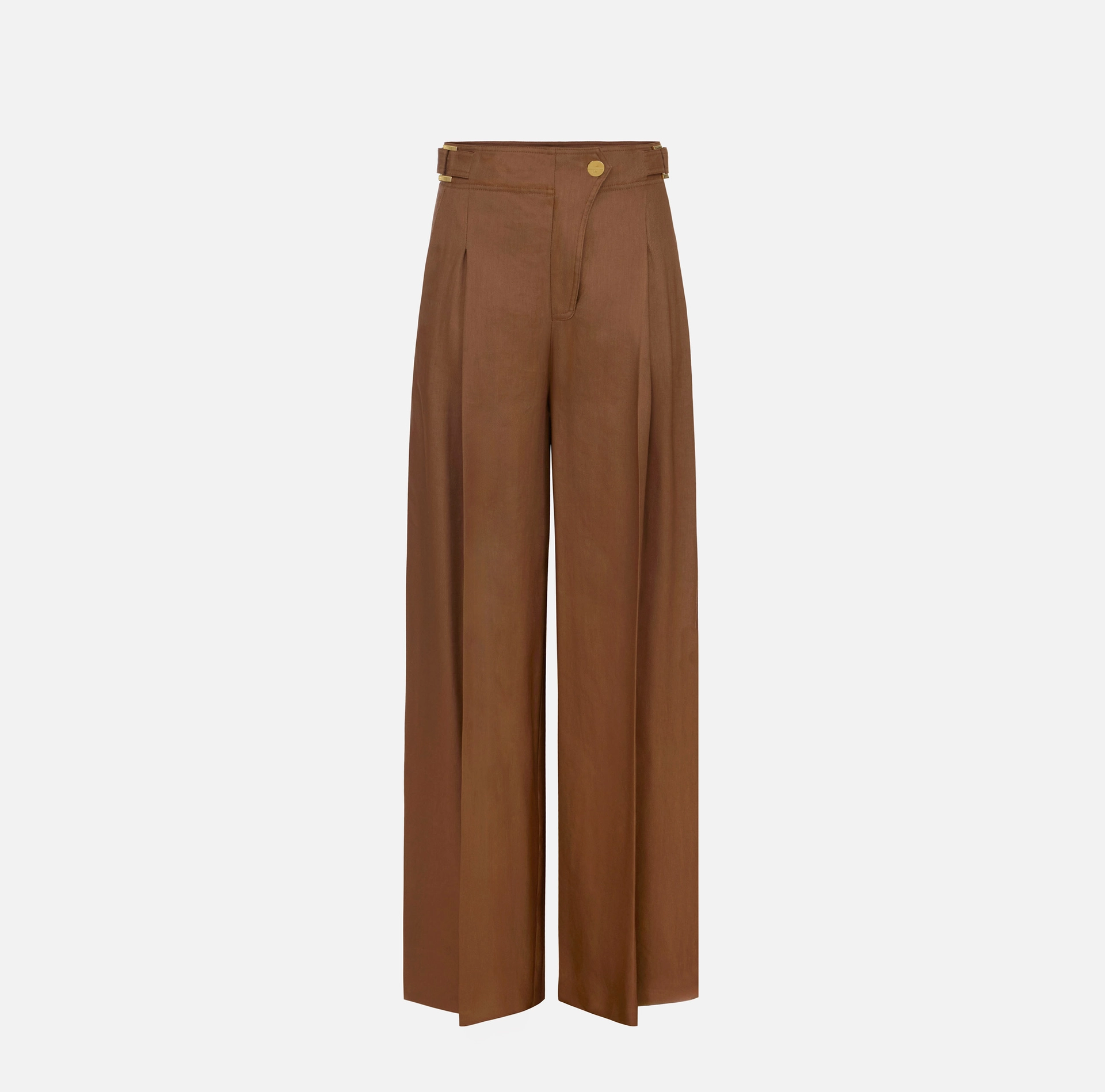 Spodnie z wysokim stanem, z mieszanki lnu. Szeroki spodnie typu palazzo, z pasem podkreślonym paseczkami z metalowymi pierścieniami w kolorze złota, które dodają ubraniu blasku. Patka o skośnym kroju stanowi stylowy detal. Krój oversize.