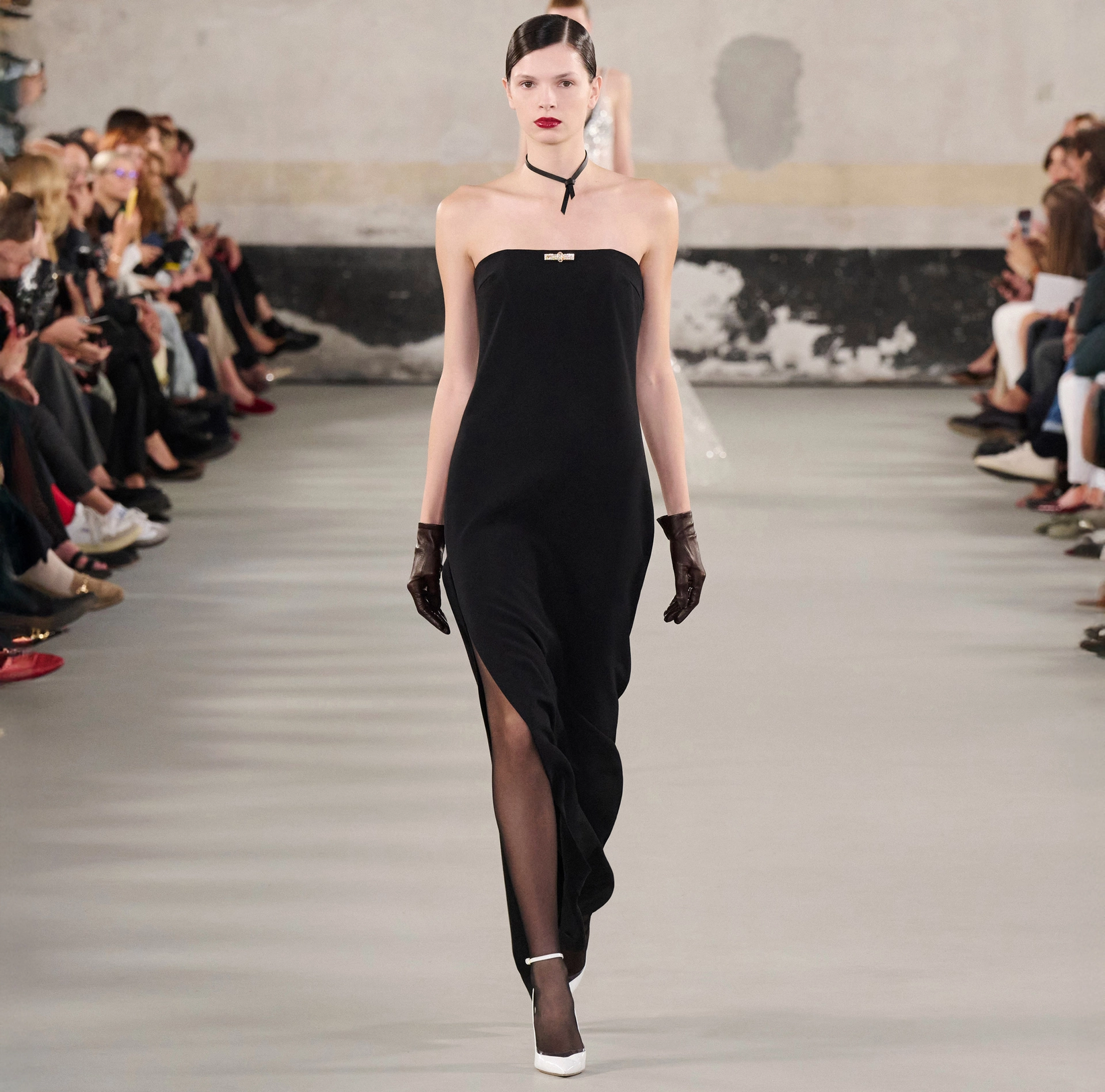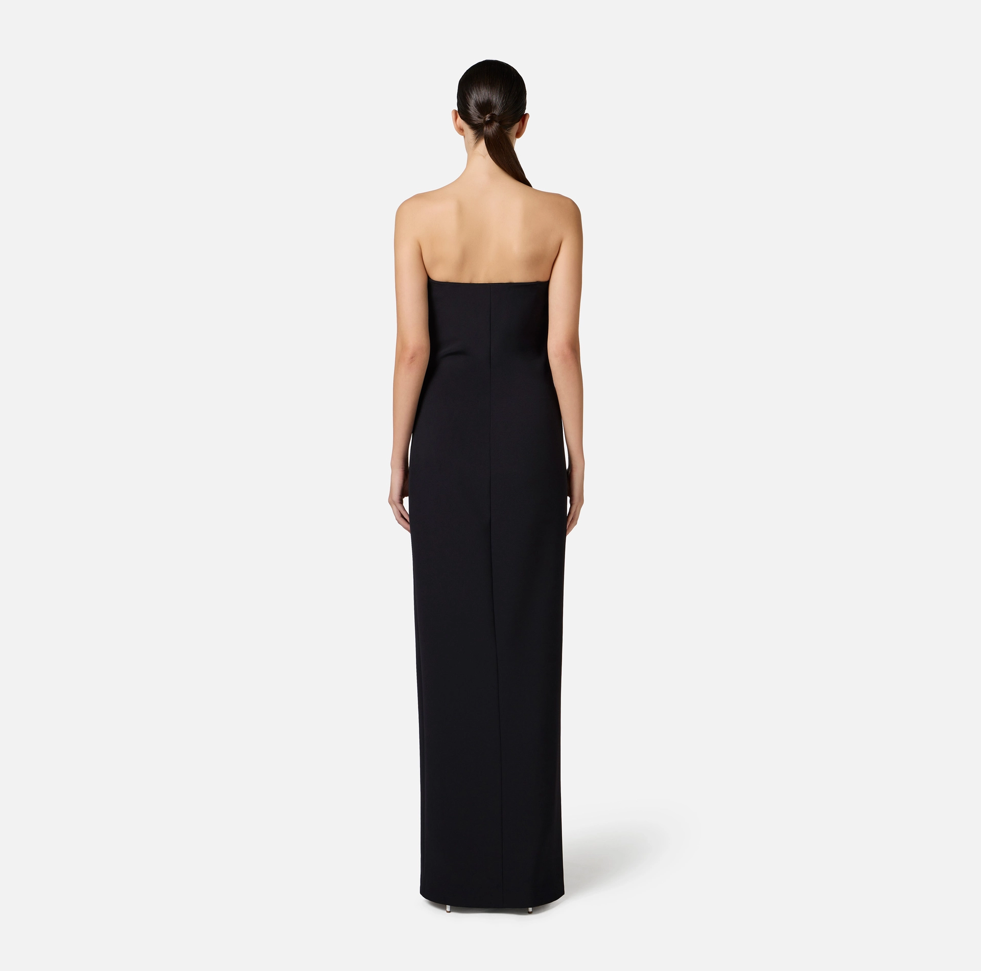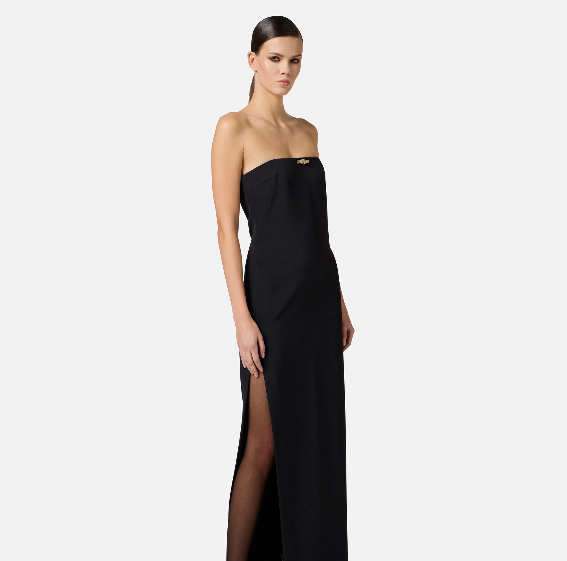 Suknia wieczorowa z lekkiej dwuwarstwowej tkaniny krepowej. Sukienka ma odsłonięte ramiona i wyróżnia się podstawową konstrukcją, ozdobioną aplikacją z kryształków na górze. Spódnica ma rozcięcie z boku, co idealnie wyszczupla sylwetkę. Dopasowany krój.