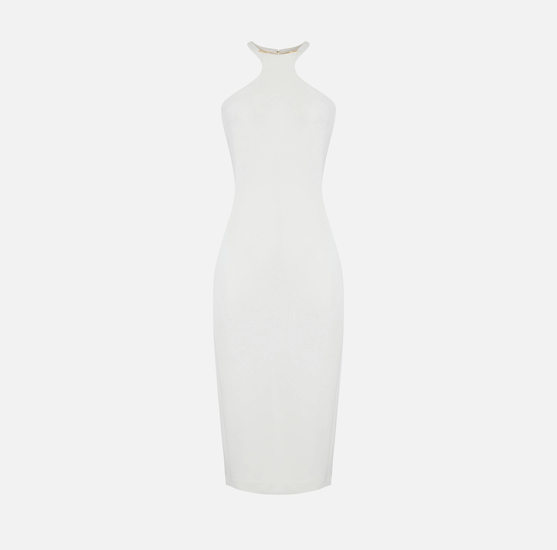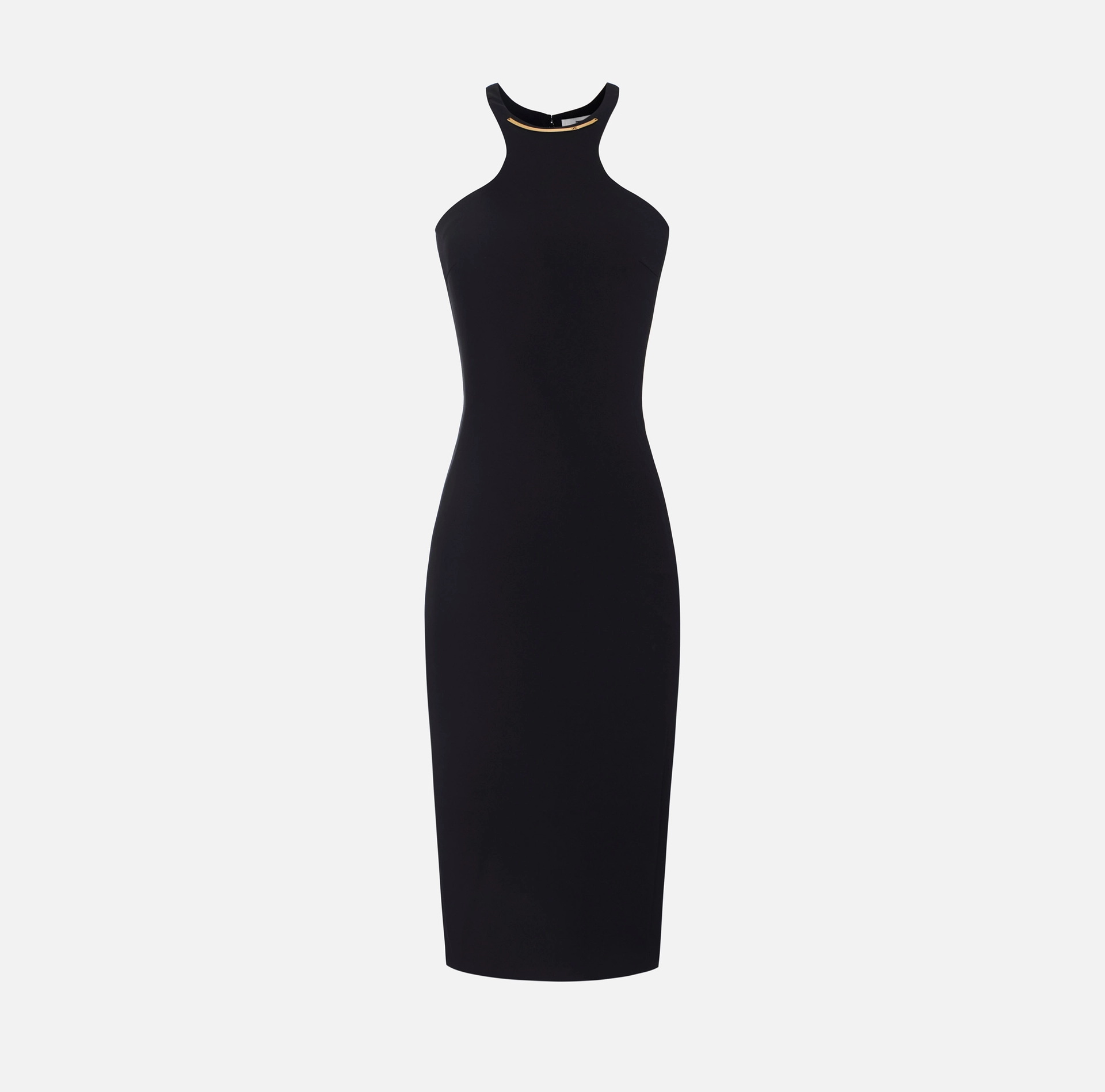 Sukienka z lekkiej krepy o dopasowanym kroju. Model o długości midi, z dekoltem typu halter, odsłaniającym ramiona. Blaszka ze złoconego metalu z logo zdobi dekolt.
