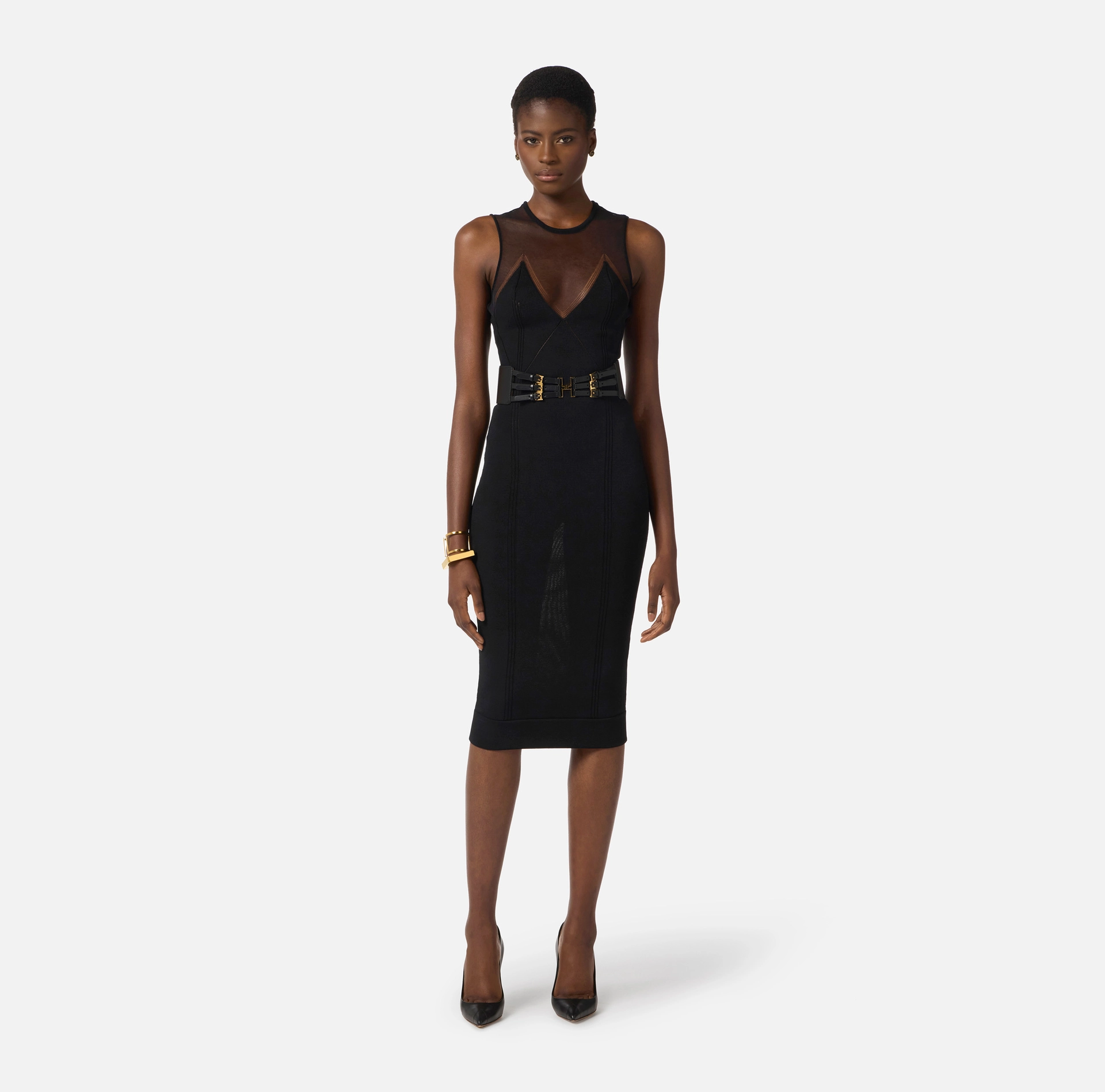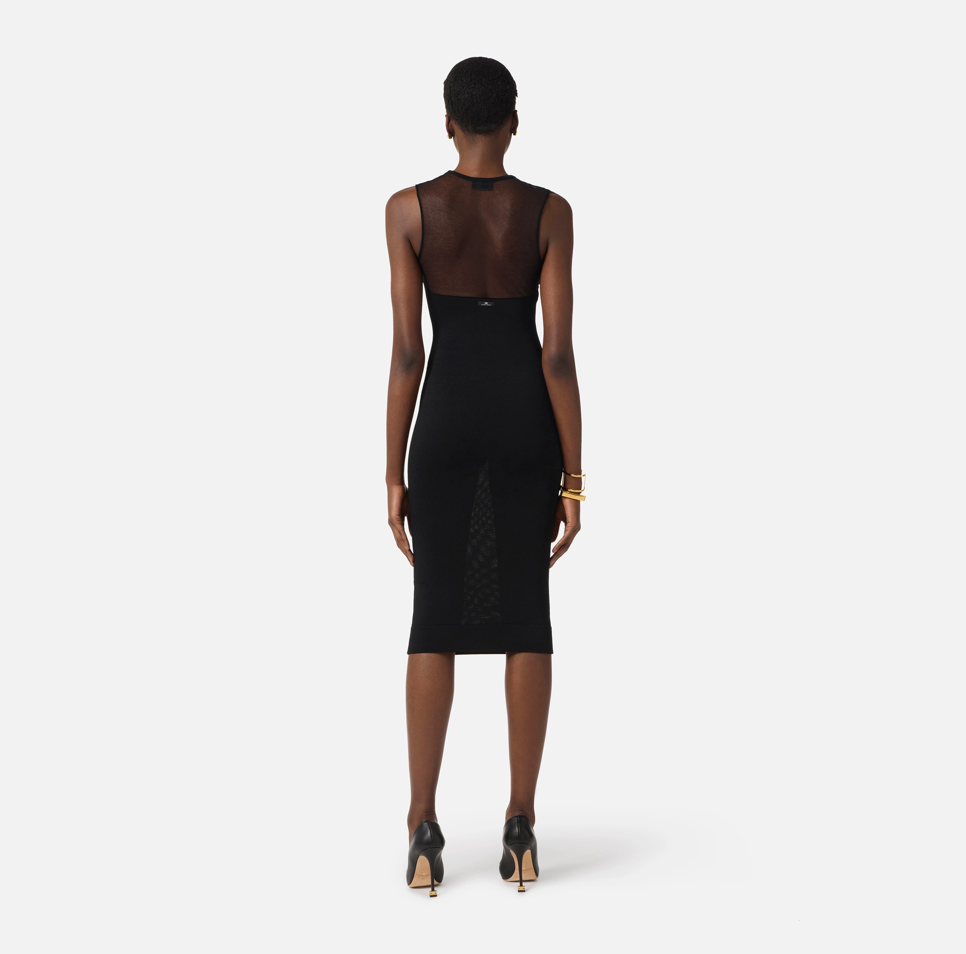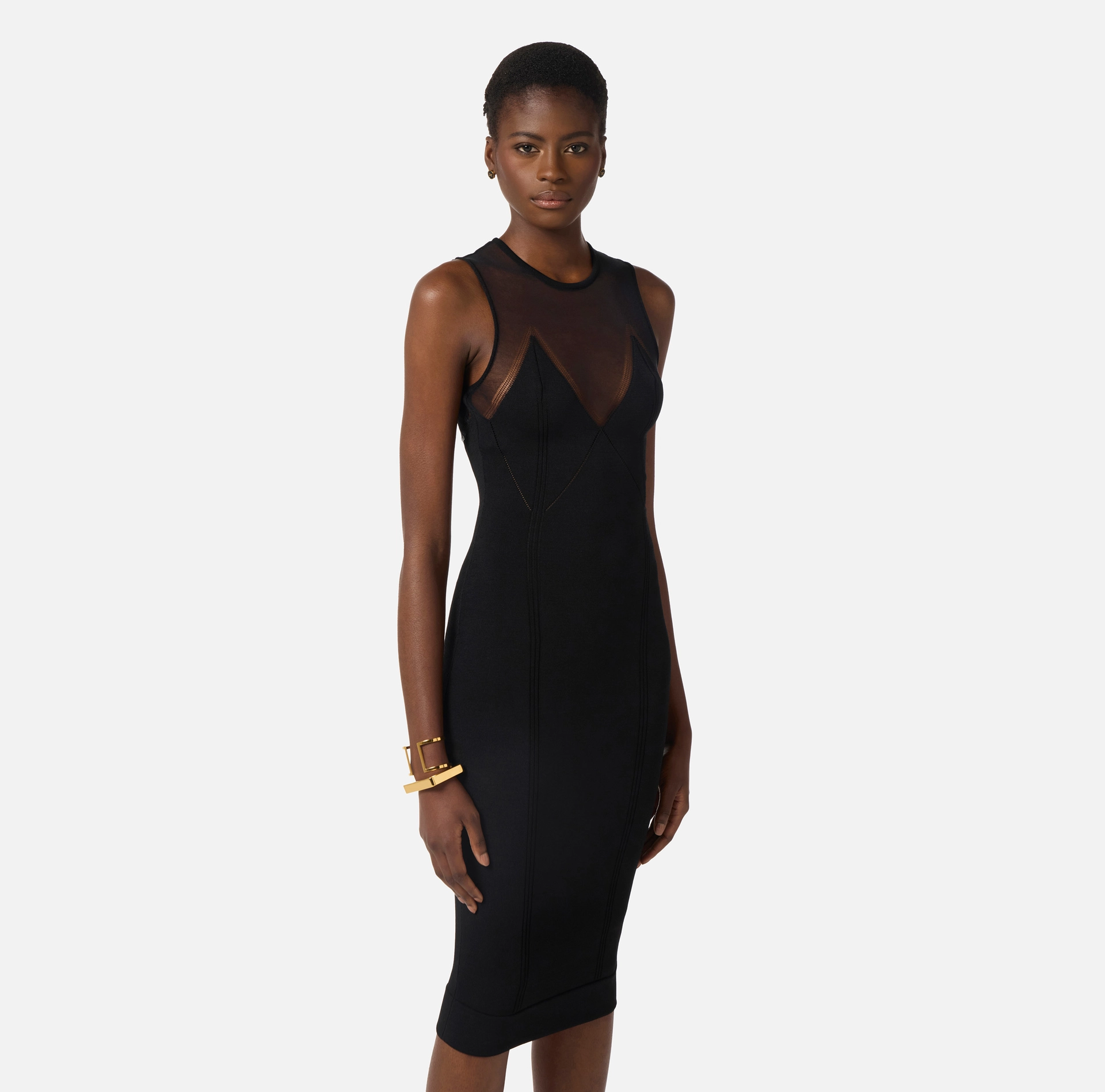 Dzianinowa sukienka o dopasowanym kroju. Model bez rękawów, z okrągłym dekoltem i dołem do kolan. Uwagę przyciąga ażurowy panel z siateczki, tworzący zmysłową grę przezroczystości. Sześcioboczne miseczki tworzą śmiały, geometryczny fason.