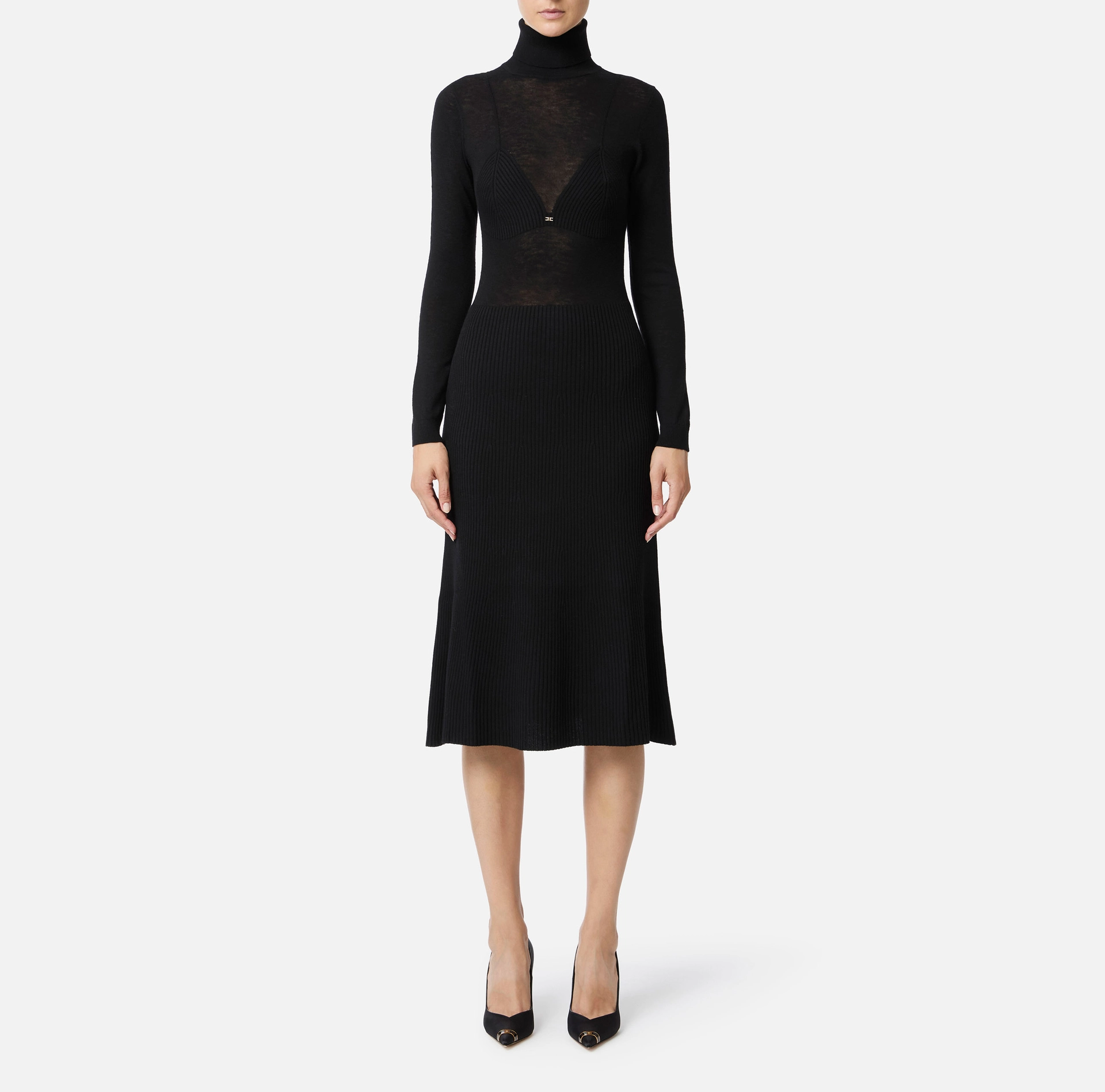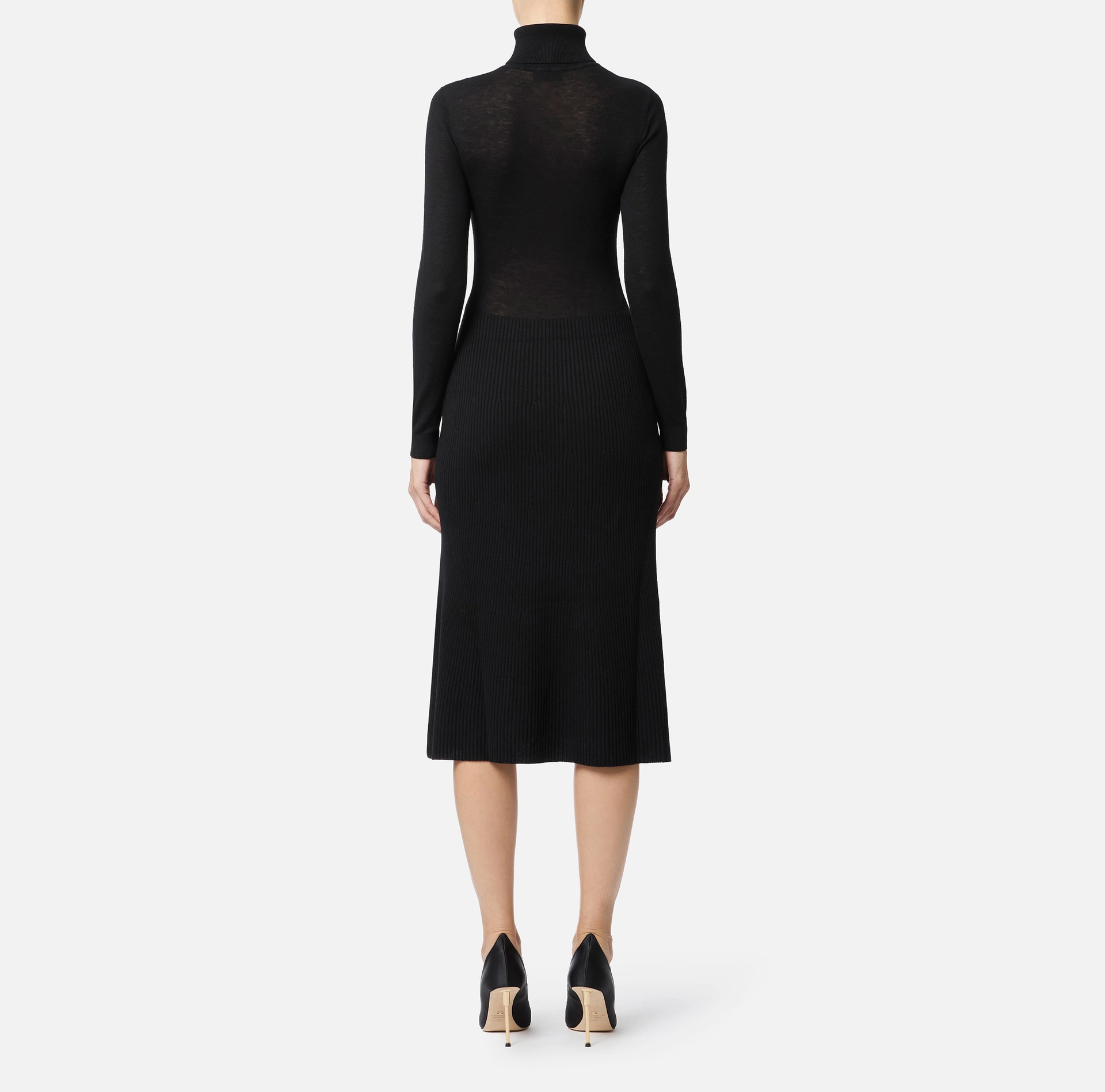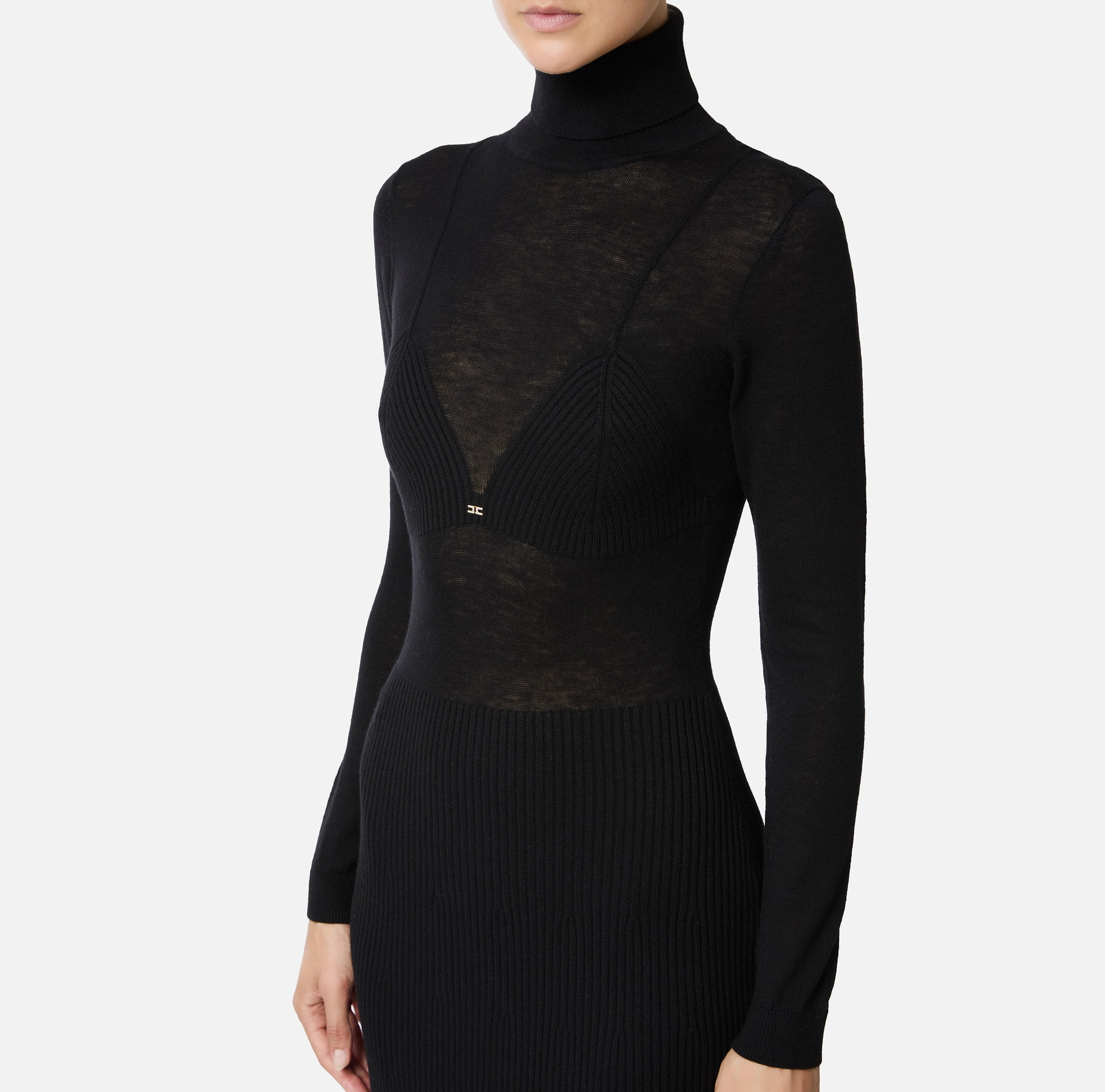 Sukienka z mieszanki wełny o kroju slim. Model posiada golf i lekko rozszerzający się dół. Charakteryzuje się prążkowaniem na wysokości biustu i u dołu, co tworzy wyrafinowany kontrast tekstur. Biżuteryjny detal z logo ze złoconego metalu z kryształkami.