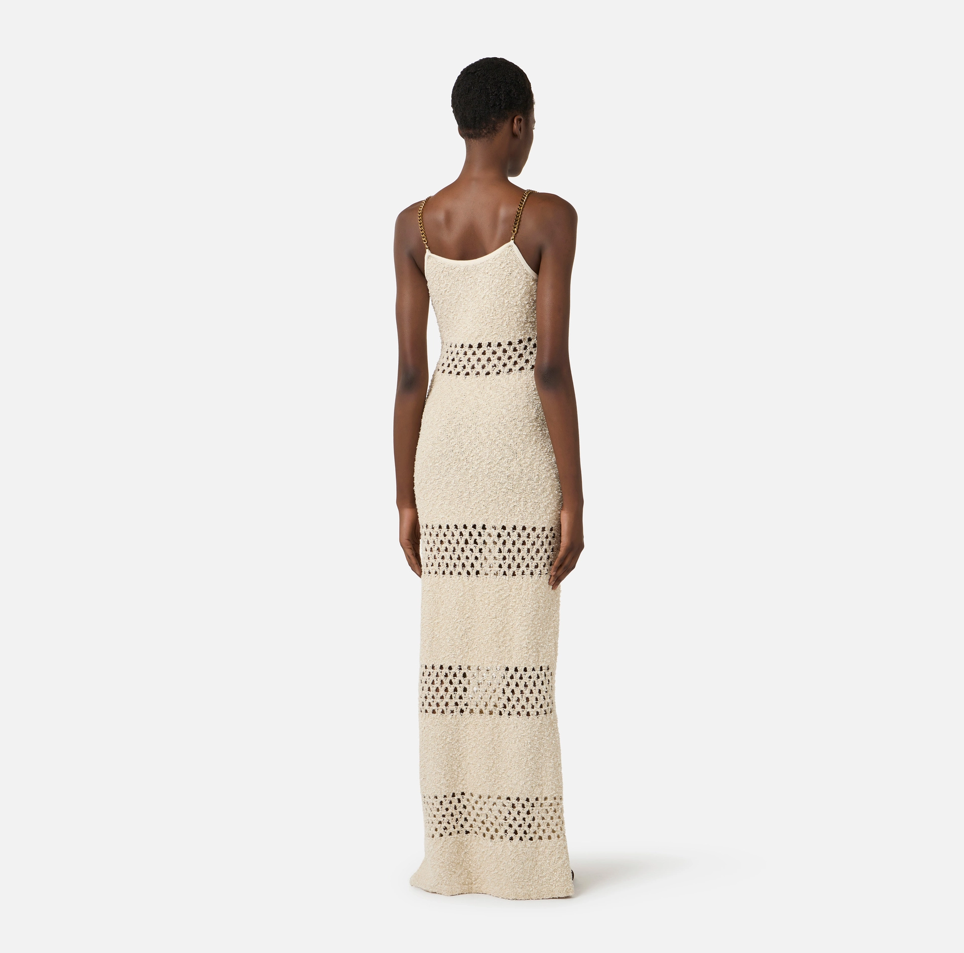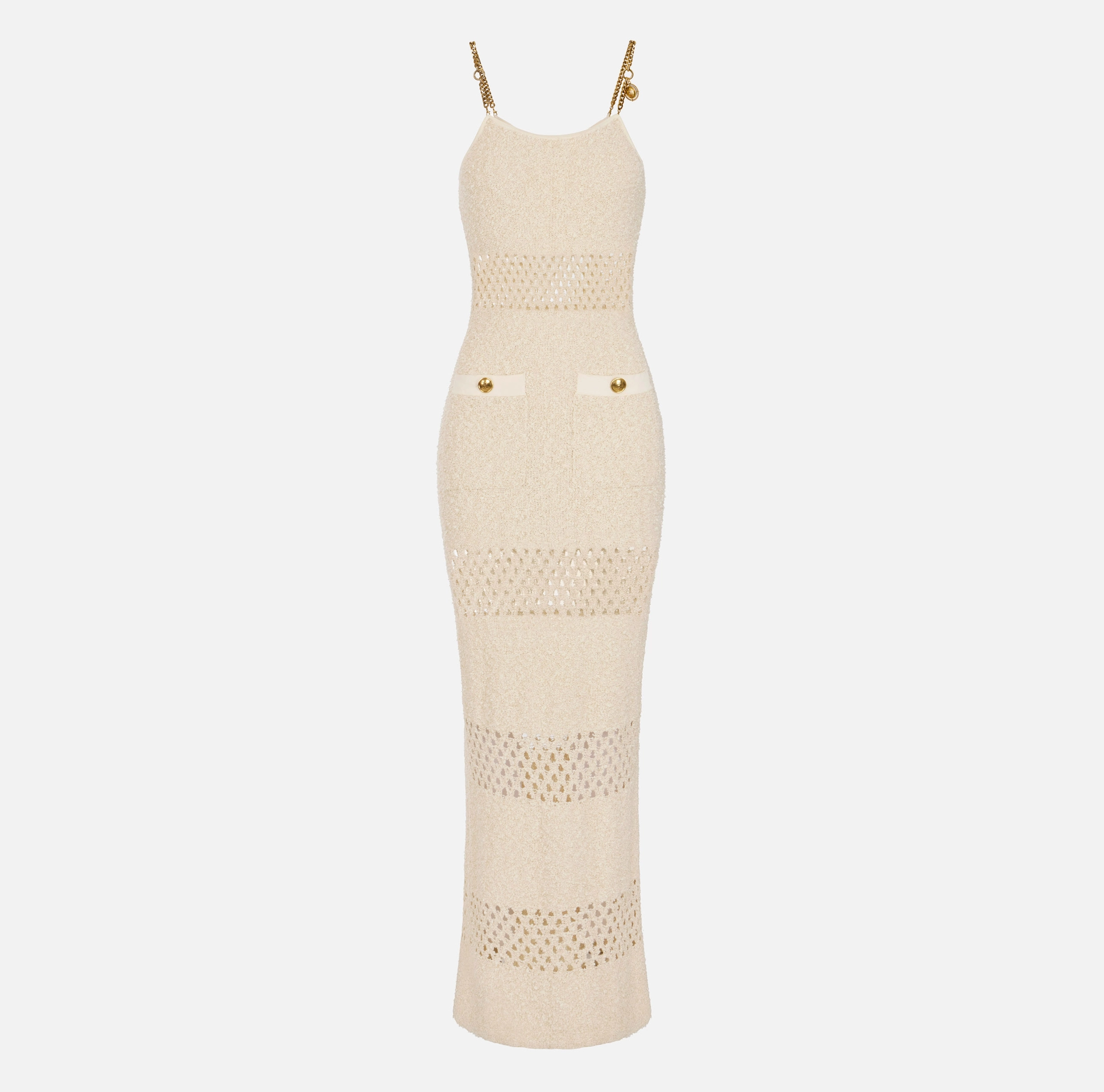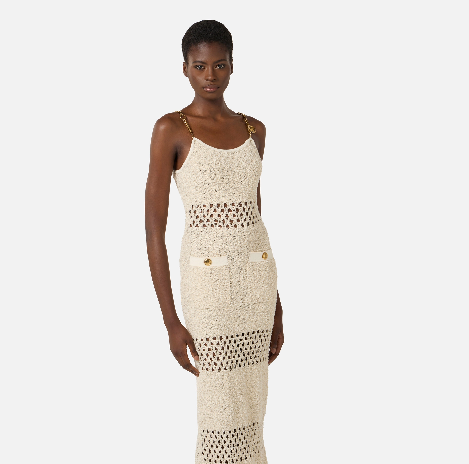 Długa sukienka z dzianiny. Sukienka wyróżnia się miękkim splotem bouclé, ozdobionym połyskującymi nitkami lureksu i przeplatanymi, ażurowymi wstawkami, co tworzy mieszankę faktur. Cenne detale to ramiączka wykonane z łańcuszków, ozdobione po jednej stronie zawieszką w kształcie medalionu. Guziki mają złote wykończenie z efektem postarzenia. Prosty krój.