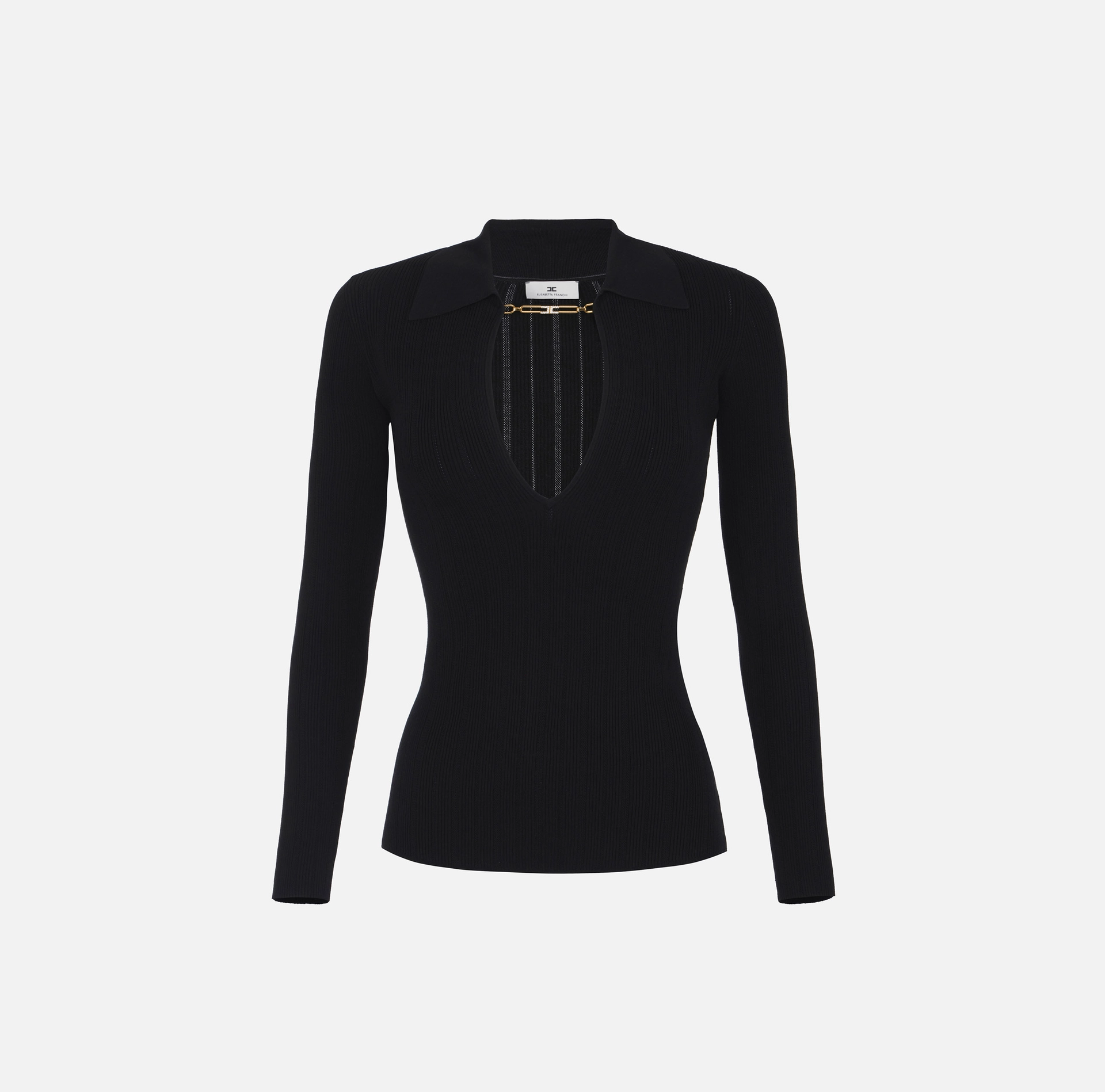 Sweter w prążki, o dopasowanym kroju. Ma kołnierzyk polo i dekolt w szpic, jest ozdobiony biżuteryjnym elementem z metalu w kolorze złotym z logo i kryształkami. Splot jest wzbogacony ażurowym haftem, który nadaje ubraniu wyrazistości i miękkości.