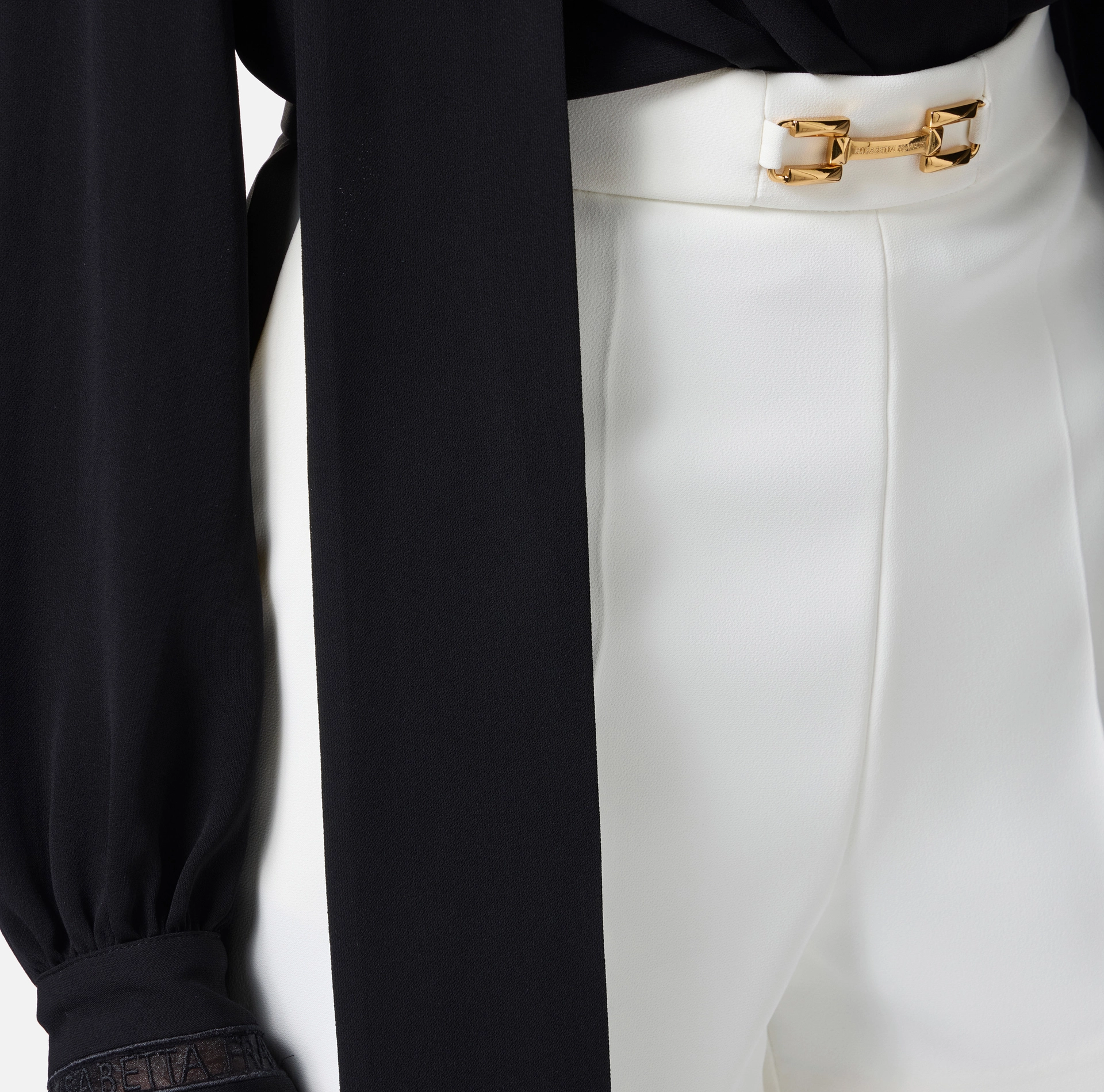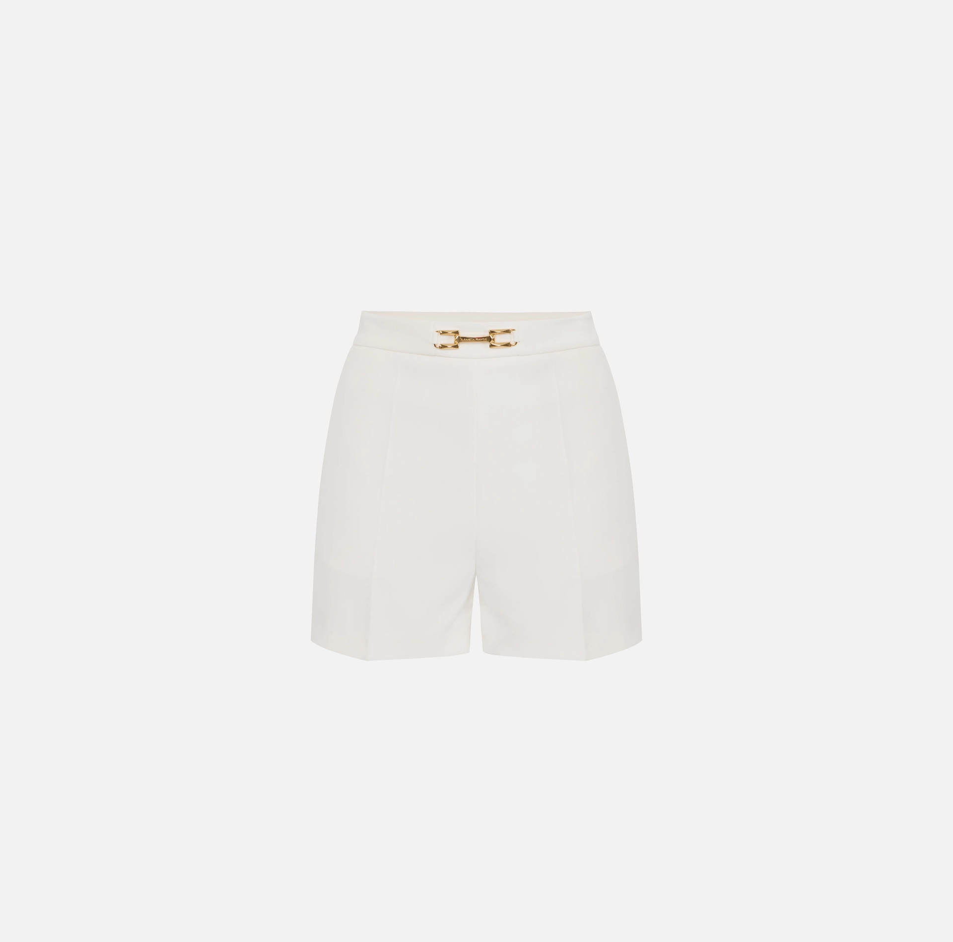 Szorty z lekkiej krepy ze stretchem, z klamrą ze złoconego metalu zdobiącą pas. Patki z tyłu posiadają guziki ze złoconego metalu z logo. Krój slim. Należy do kolekcji Essential, składającej się na garderobę doskonałą.