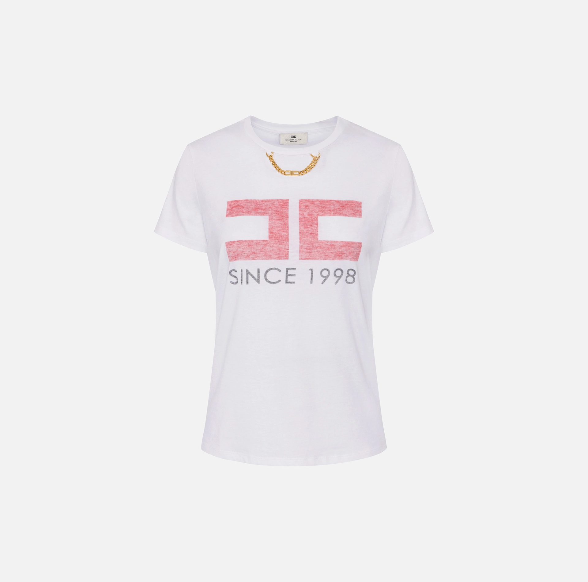 Krótkorękawowa, lekka bawełniana koszulka z nadrukiem i dopasowanym krojem. Skupiono się na szczegółach, takich jak nadruk z przodu i dekolt ozdobiony złotym metalowym łańcuchem.
